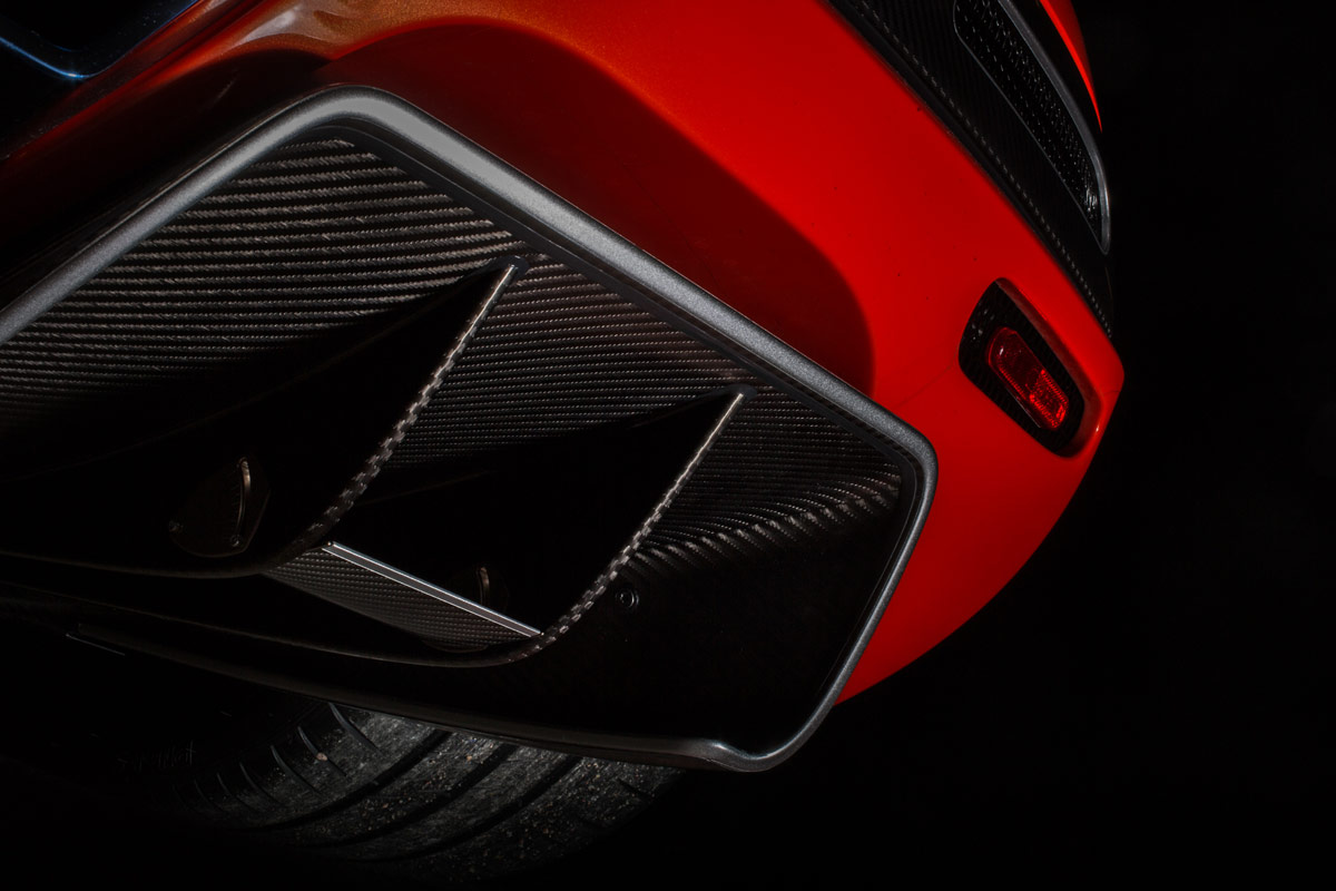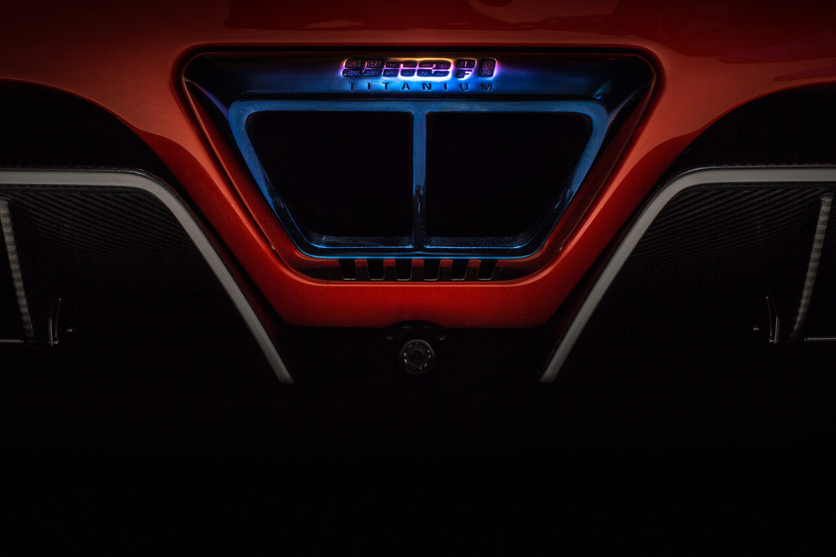 - Eine zweigeteilte Titan-Blende am Abgasendrohr mit „One of 1“-Gravur