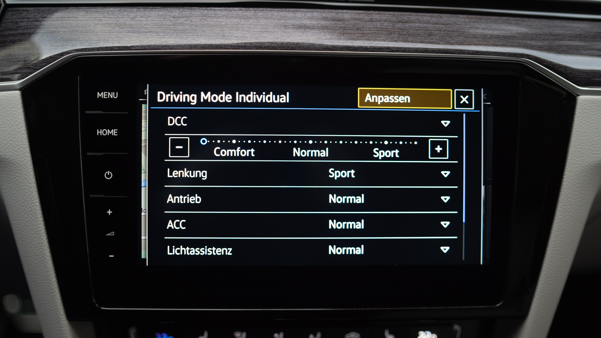 Das Beste am Mode-Taster neben dem DSG-Hebel sind nicht etwa die voreingestellten Varianten Comfort, Normal, Sport oder Offroad, nein, es ist die Individual-Einstellung, die es in sich hat. Denn für die adaptive Fahrwerksregelung DCC reicht der Einstellschieber noch über die Comfort-Stellung hinaus. Also: weicher als weich. Und damit ist es genau das richtige Setup für den grünen Großkombi.