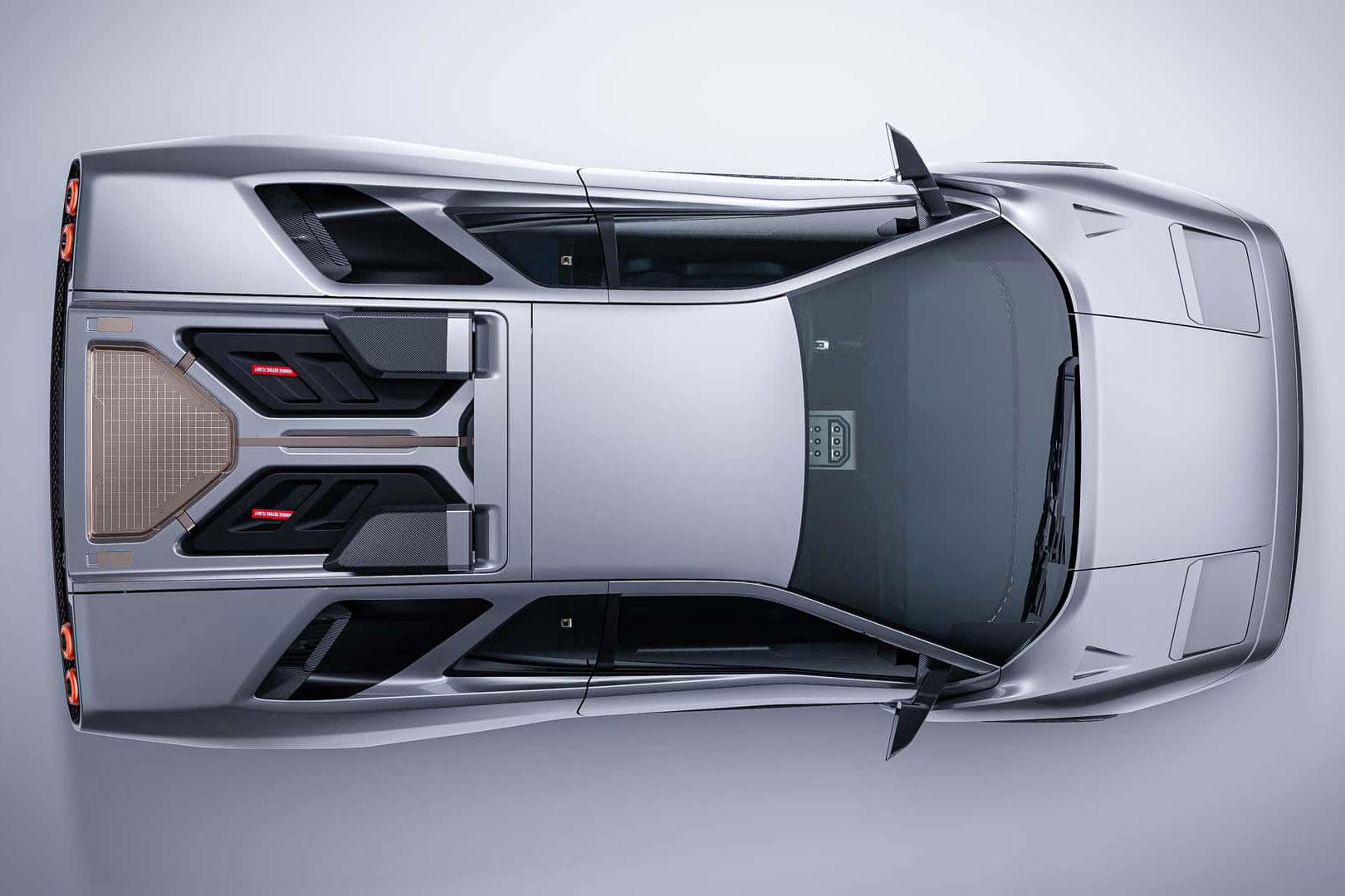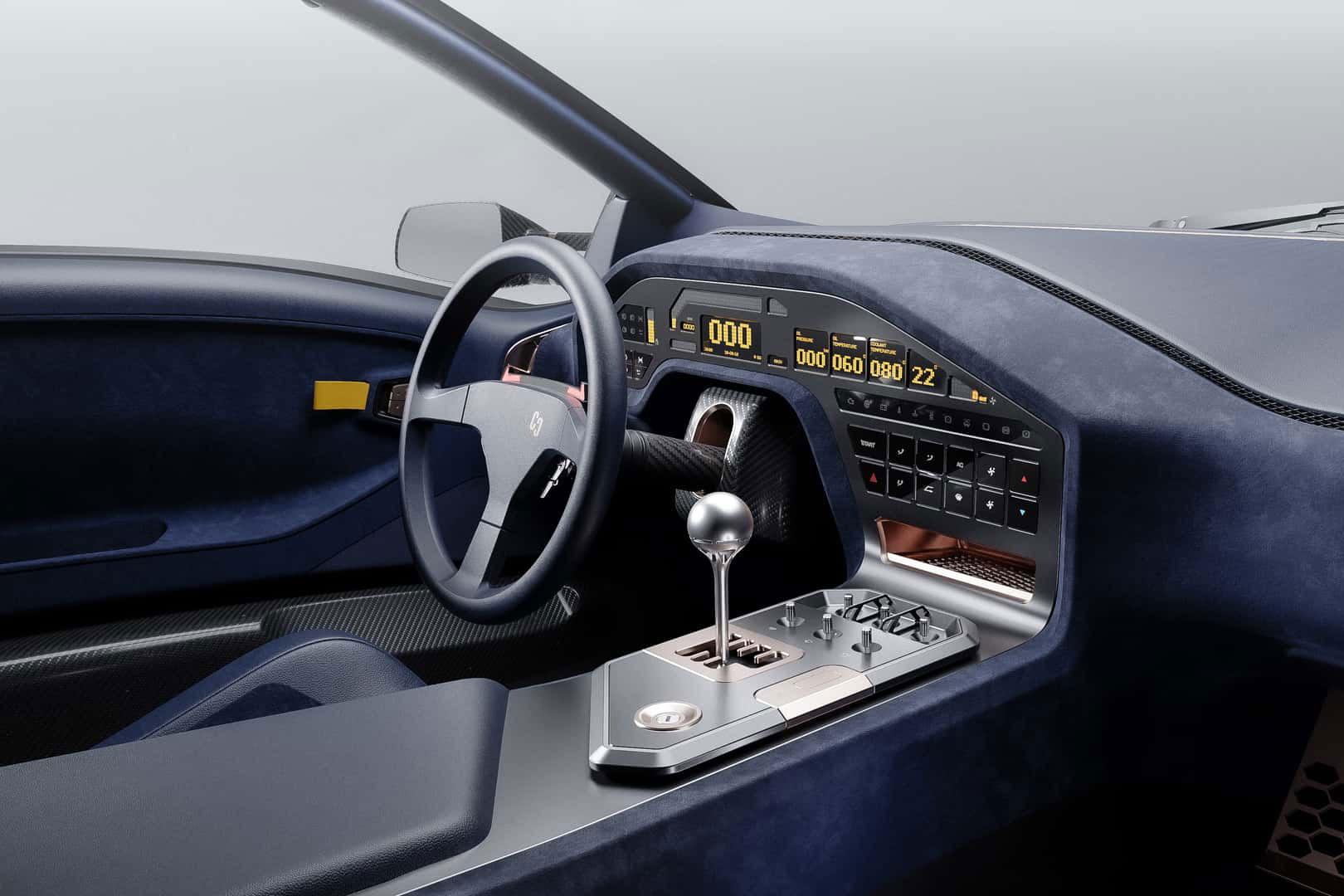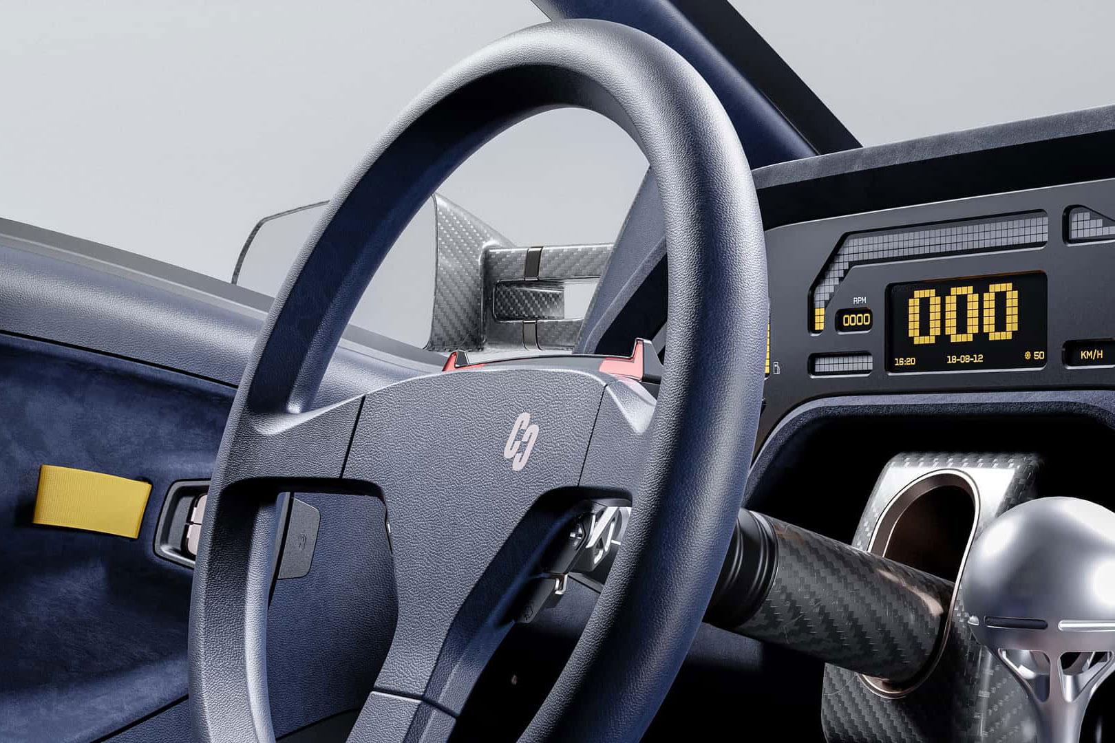 Auch der Innenraum wird einer deutlichen Modernisierung unterzogen, wobei hier das klassische Design im Vordergrund steht. Die minimalistische Kabine behält ihren Charme und wird mit hochwertigen Materialien sowie Anzeigen und Schaltgeräten veredelt.  Das ursprünglich analoge Cockpit musste einer Einheit weichen, dass selbst Keanu Reeves in Cyberpunk 2077 neidisch machen würde. Insgesamt wurde mit Alcantara, Kohlefaser und Leder gearbeitet, wobei die  Lenksäule aus Kohlefaser eine Anspielung auf den originalen Diablo GTR ist.