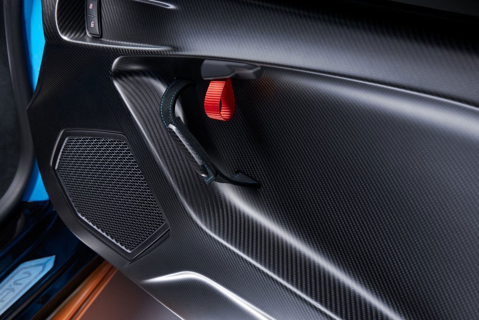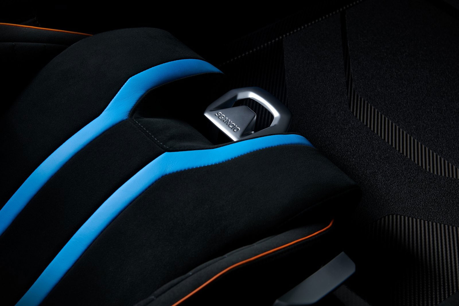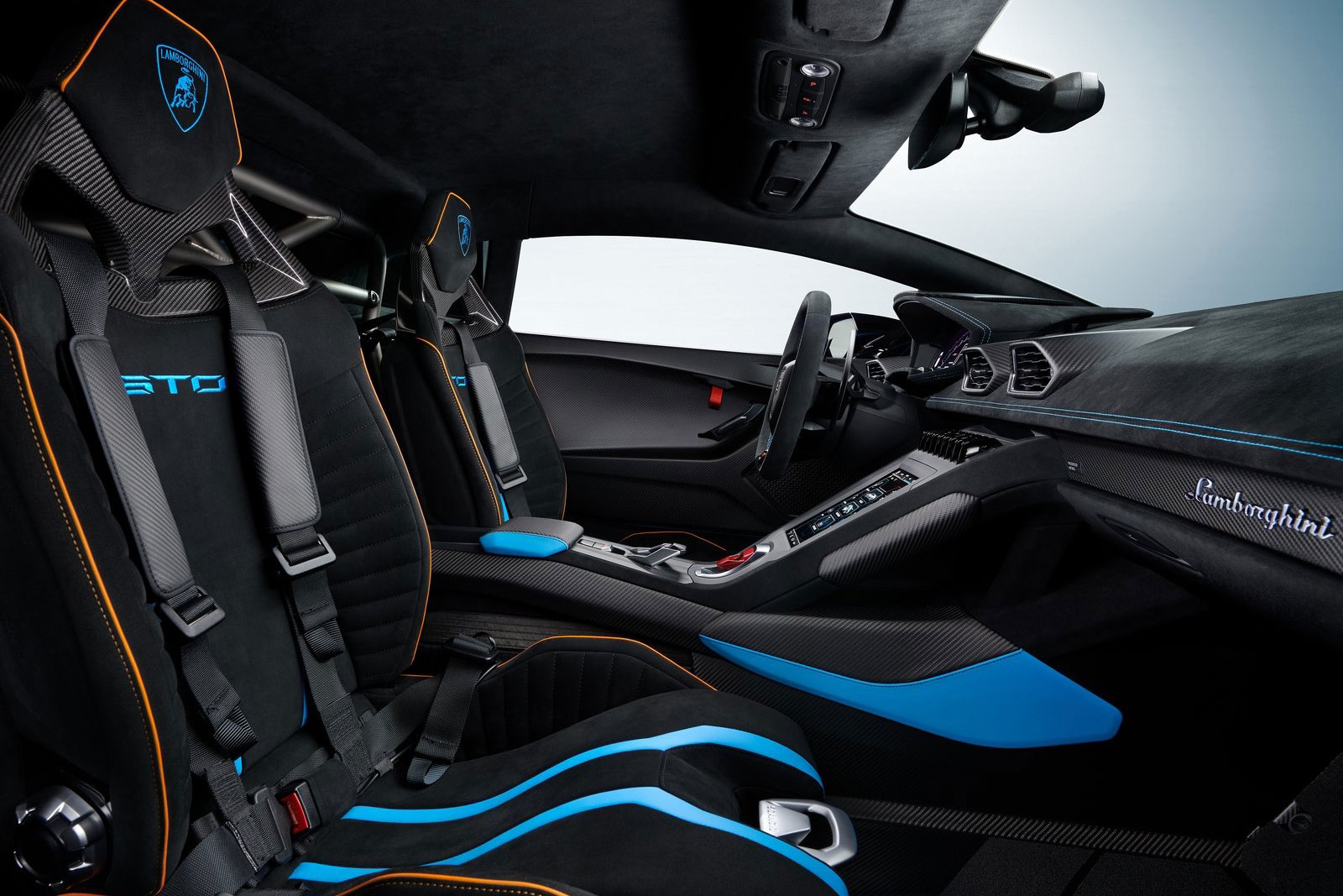 Das Interieur des Huracán STO spiegelt den Leichtbau-Ansatz des Exterieurs wider: umfangreicher Einsatz von Carbonfaser-Elementen im gesamten Cockpit, darunter Sportsitze komplett aus Carbonfaser. Eine Alcantara-Innenausstattung mit Lamborghini Carbonskin findet Verwendung, die Teppiche wurden entfernt und durch Carbonfaser-Fußmatten ersetzt, leichte Türverkleidungen aus Carbonfaser mit Zugschlaufe als Öffner kommen zum Einsatz. Ein Käfig aus einer hochwertigen Titanlegierung mit Vier-Punkt-Gurten und ein neu gestalteter vorderer Kofferraum zur Helmaufbewahrung unterstreichen die Rennsport-DNA des Huracán STO. Der Käfig, entwickelt in Kooperation mit unserem technischen Partner Akrapovič, ist aus einer hochwertigen Titanlegierung gefertigt. Er ist 40% leichter al konventionelle Edelstahlkäfige.