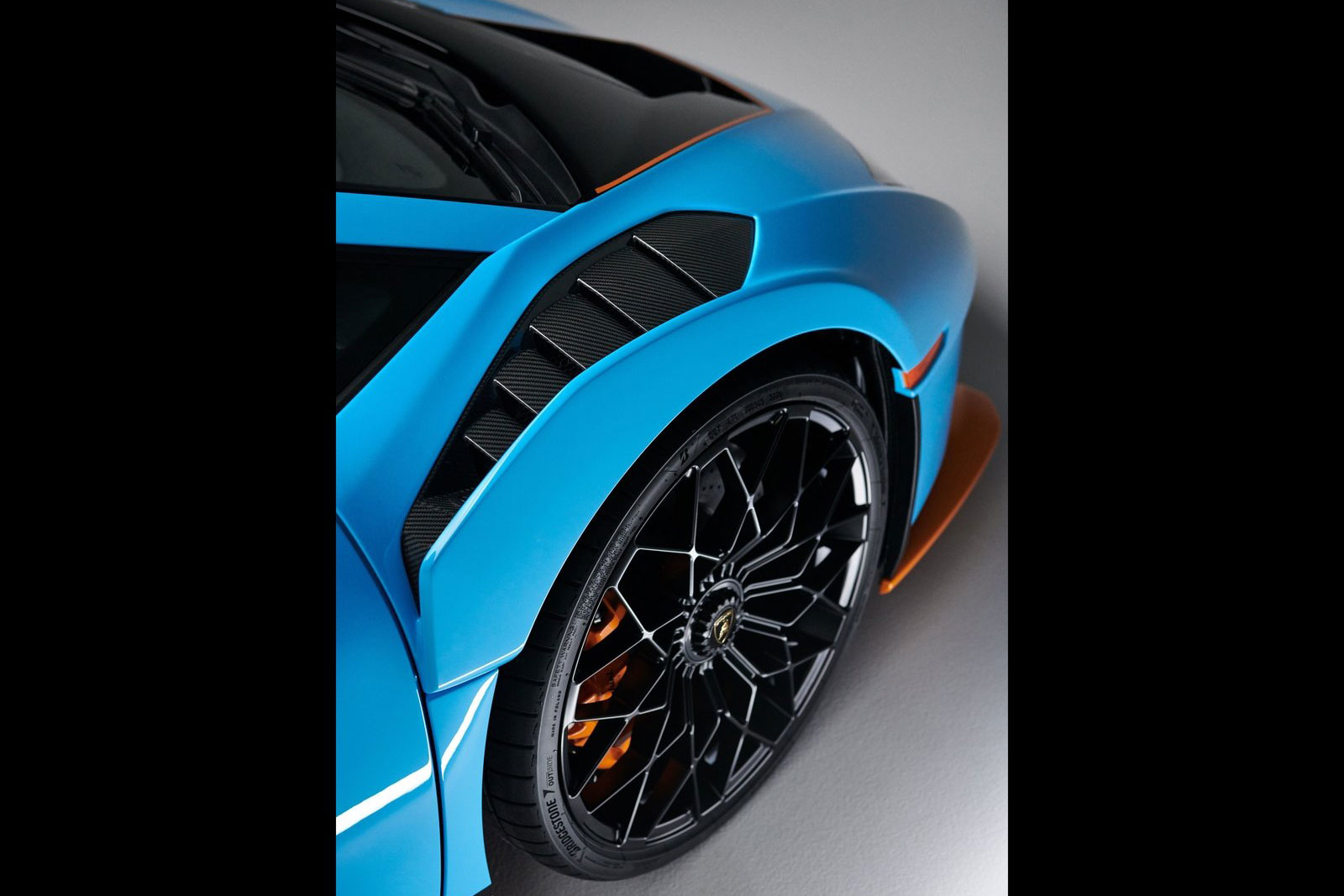 Die Forschungs- und Entwicklungsabteilung von Lamborghini setzt beim hinteren Kotflügel eine Carbonfaser-Sandwich-Technik ein, die auch in der Luft- und Raumfahrtindustrie verwendet wird. Dank dieser Technologie benötigt der Huracán STO 25% weniger Carbonfaser-Material bei gleicher struktureller Steifigkeit. Mit einem Leergewicht von 1.339 kg wiegt der Huracán STO 43 kg weniger im Vergleich zum bereits leichten Huracán Performante.