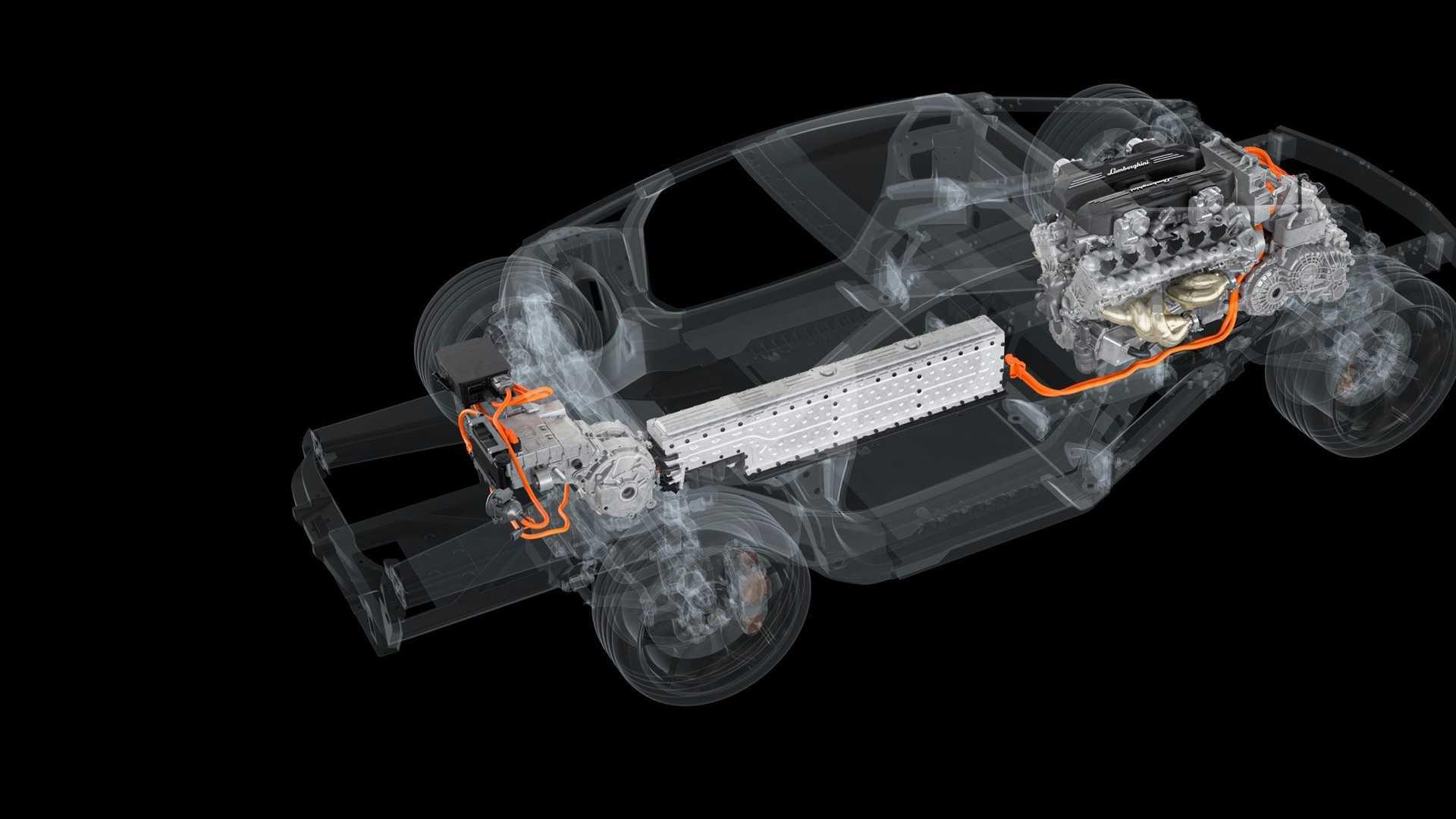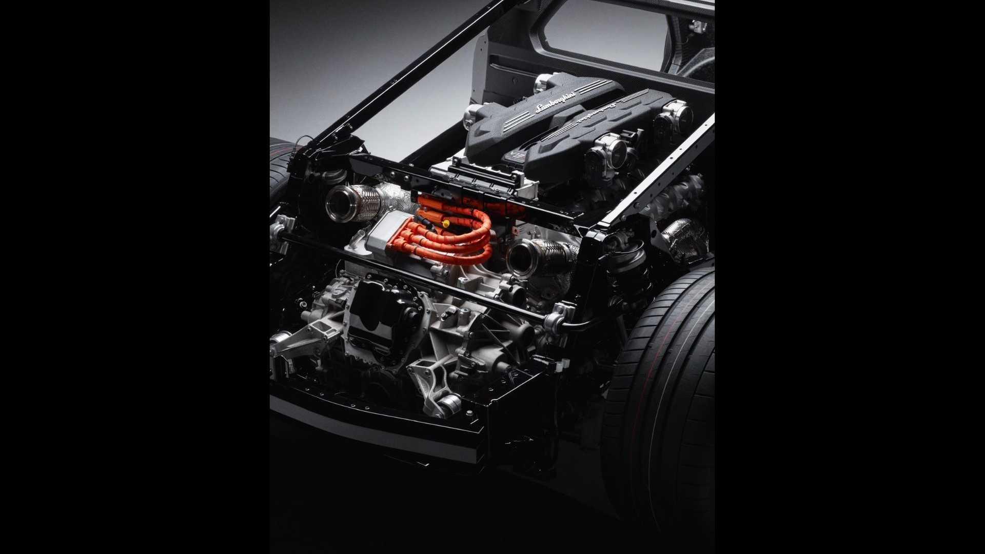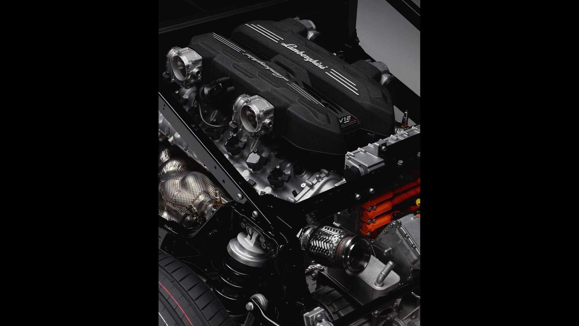 Zwei der Elektromotoren treiben jeweils ein Vorderrad an, der dritte E-Motor sitzt im Heck. Er startet den V12, unterstützt mit 150 PS und fungiert zudem als Generator für den im Tunneln zwischen den Insassen verbauten Akku. Dessen Kapazität beträgt 3,8 kWh und er ermöglicht es, dass der LB744 sogar komplett elektrisch fahren kann. Geladen werden kann der Akku extern mit bis zu 7 kW oder über Rekuperation. Lamborghini selbst bezeichnet den Supersportwagen als HPEV – als ein „High Performance Electrified Vehicle“. Nicht zu verwechseln mit einem schnöden PHEV (einem herkömmlichen Plug-in-Hybriden).