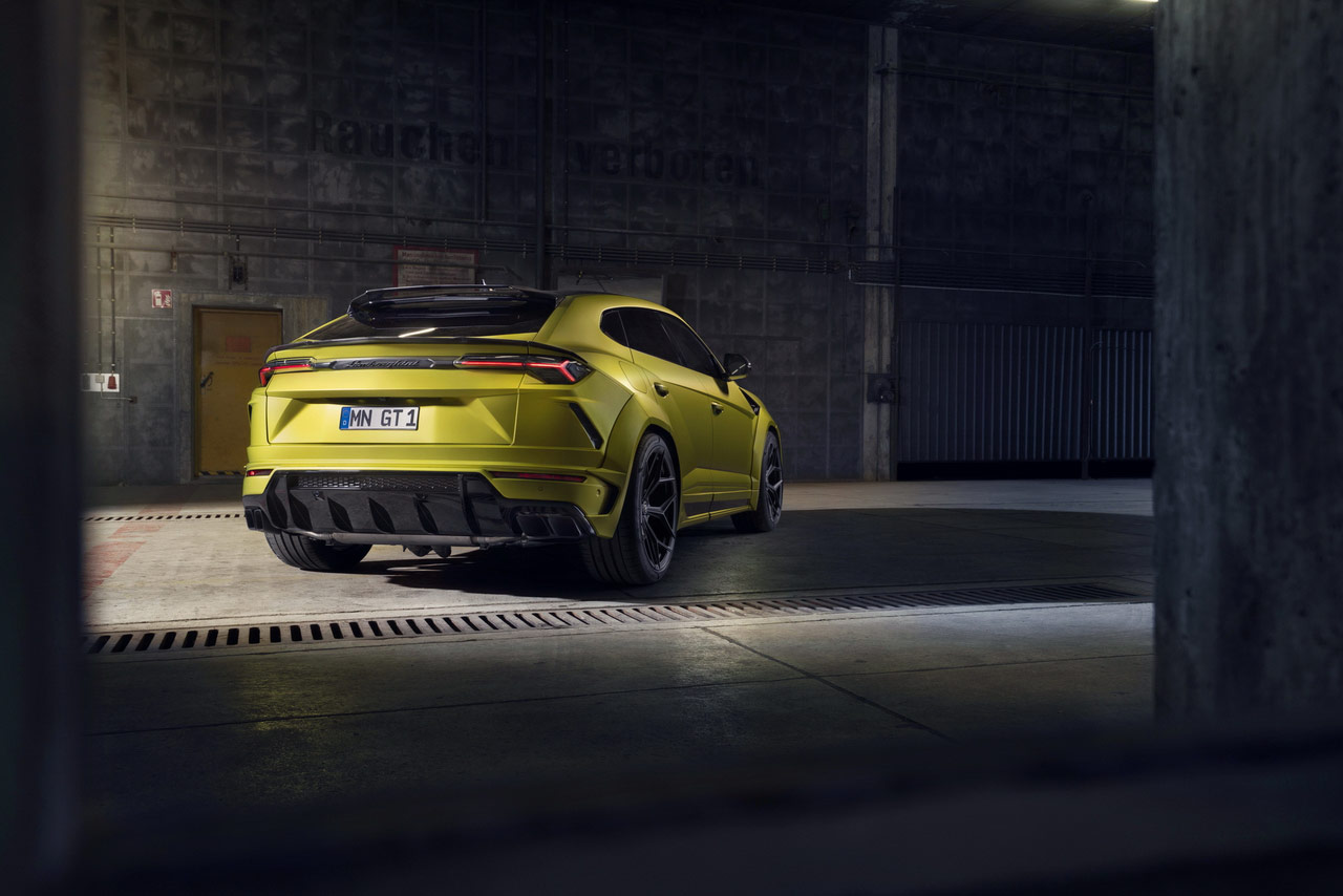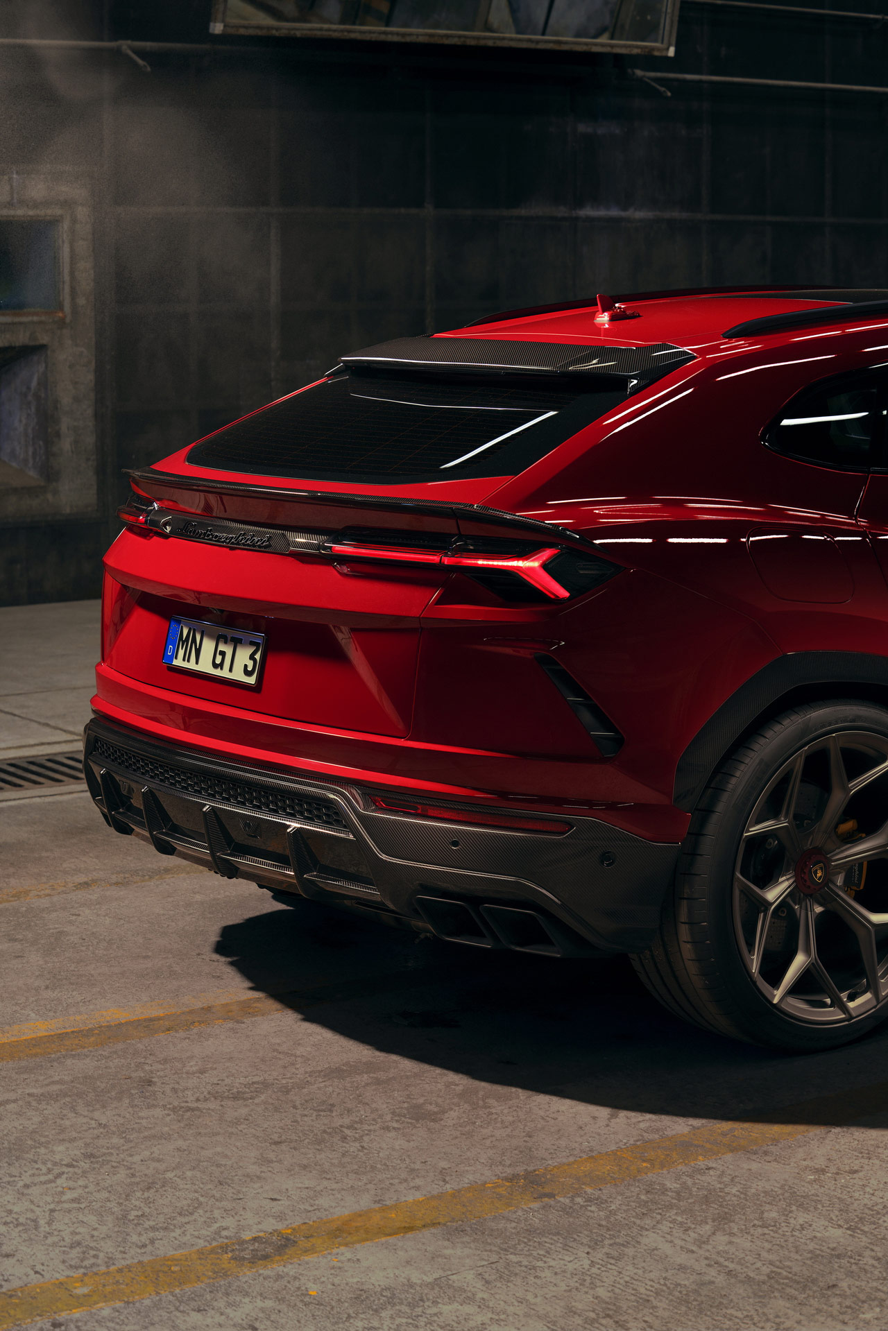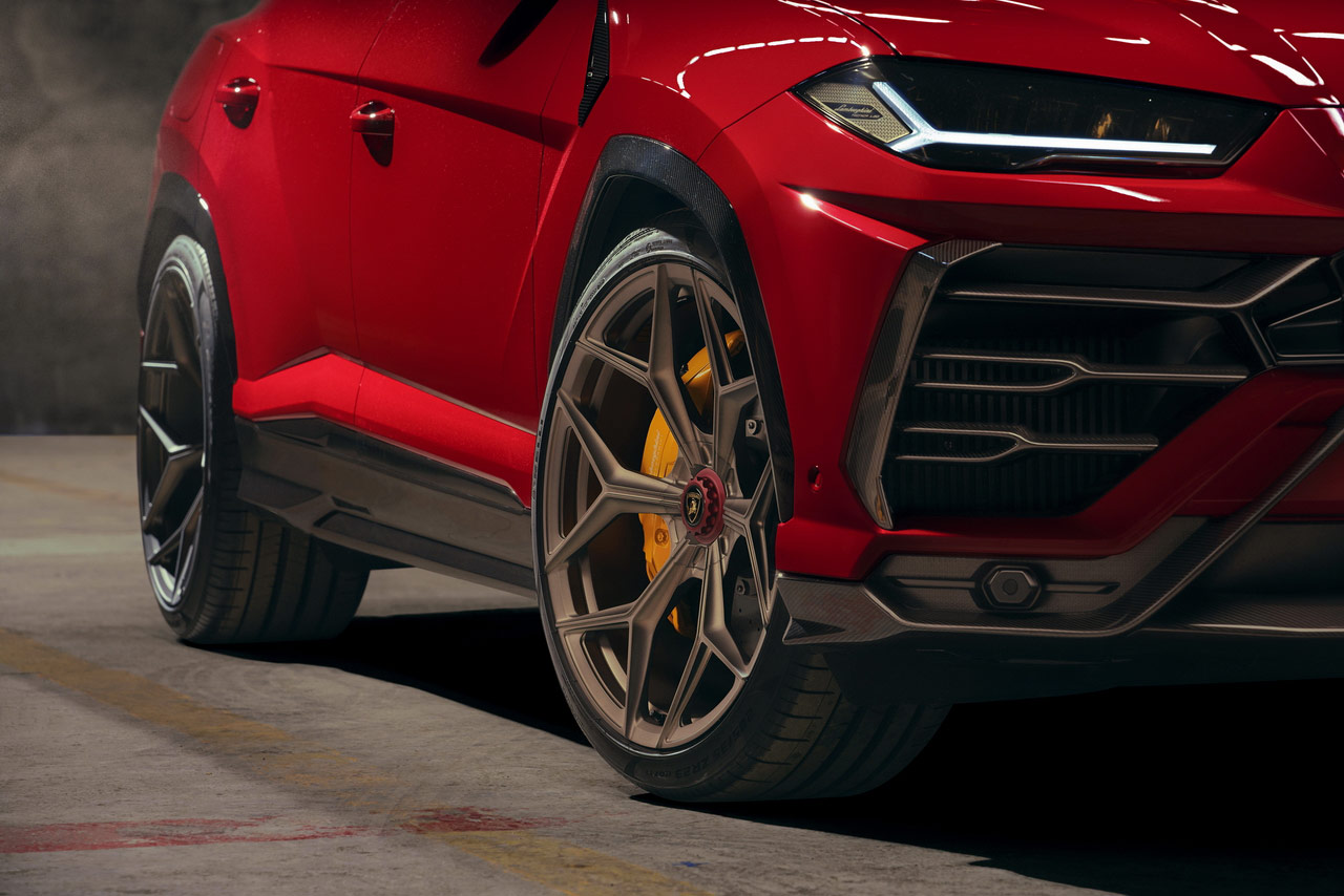 Mindestens genau so krawallig wir die Fahrleistungen des Urus aus dem Hause Novitec ist der Auftritt des Widebodykits, das auf den Namen „Esteso“ hört und das V8-SUV an der Vorderachse um zehn Zentimeter in die Breite zieht. Hinten sind es gar zwölf Zentimeter. Das Komplett-Kit besteht aus 14 Teilen und wird aus PUR-Rim gefertigt. Ergänzt werden kann es um diverse Teile aus Sichtcarbon. Schlussendlich werden noch gewaltige 23-Zoll-Felgen montiert, auf die 285/35 R 23 und 325/30 R 23 messende Reifen gezogen sind.