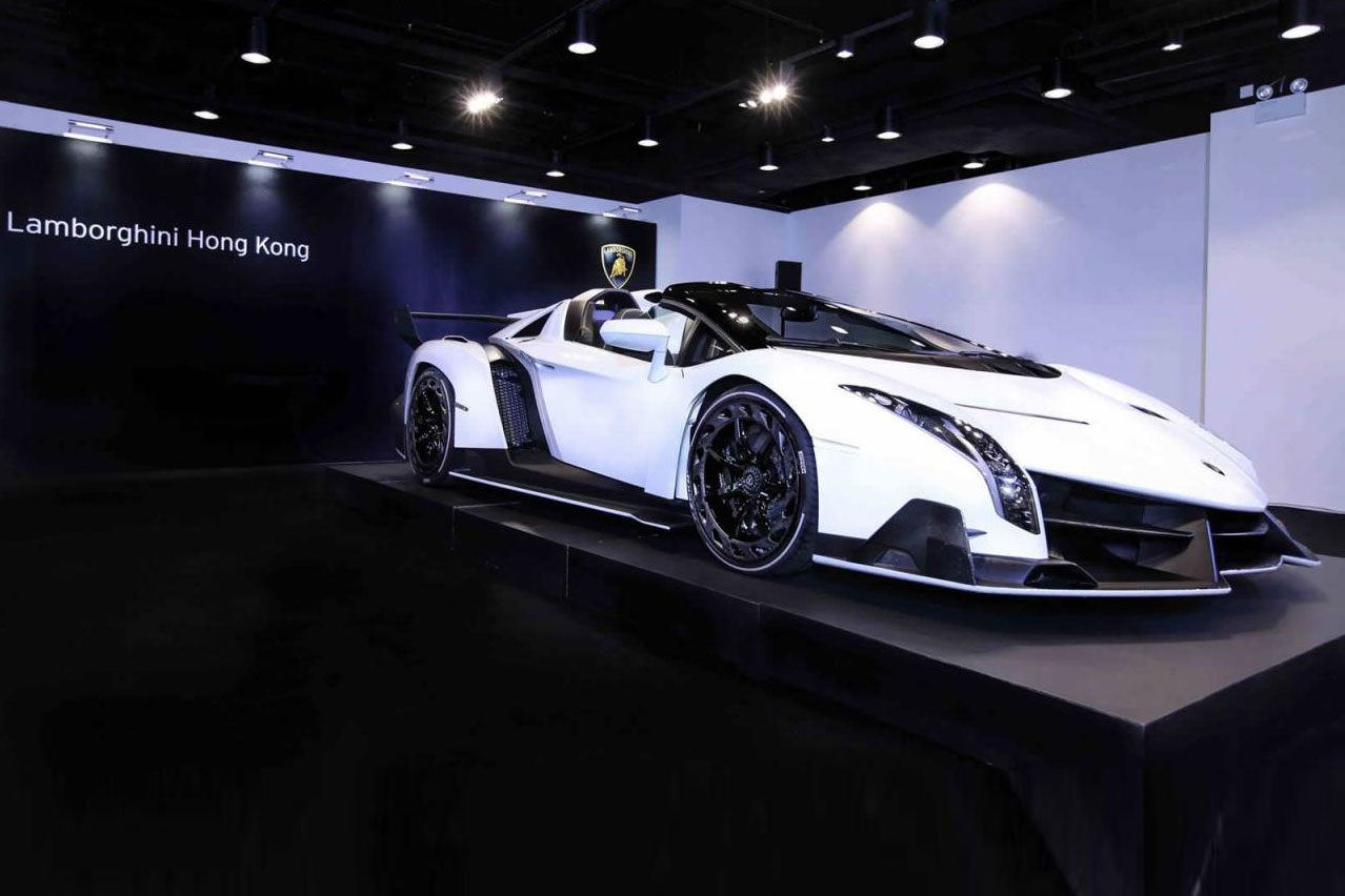 Ja ja, das Jahr 2013 war ein ganz besonders Jahr für Lamborghini. Immerhin wurde die Marke mit dem Stier im Logo da 50 Jahre alt. Und so beschenkte man sich unter anderem mit dem 750 PS starken Veneno Coupé (drei Stück zu je 3,57 Mio. Euro) und dem Veneno Roadster (neun Stück zu je 3,927 Mio. Euro). Zumindest einen der neun offenen Versionen kann man derzeit in Natura bestaunen – zumindest diejenigen, die derzeit in Hong Kong weilen.
