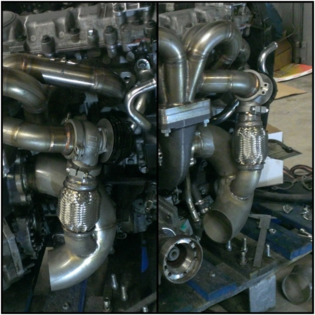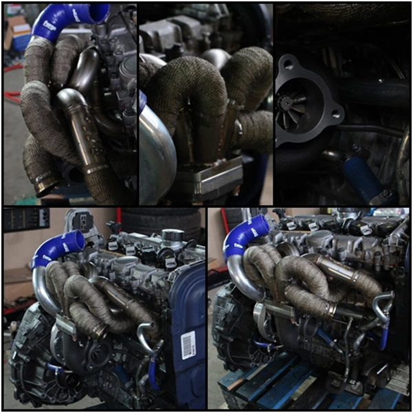 Es folgte nun das verbauen der neuen Schläuche, das Anschließen sämtlicher Druckleitungen, es mussten selbst auch diverse Kabel verlängert werden damit die Stecker zu den neuen Positionen im Motorraum gelangen. Dann wurde die Downpipe neu gebaut inkl. der Verrohrung für das externe Wastegate von TAIL USA.