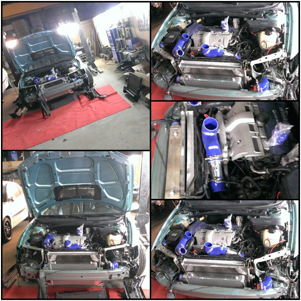 Nachdem nun der Motor wieder seinen Platz im Auto gefunden hat, wozu die Niederdruckleitung von der Klimaanlage weichen musste. Weiter baute ich die Ansaugung um bzw. vergrößerte Diese. Ich erweiterte sie von 70 mm auf 90 mm Durchmesser. Neues Luftmassenmessergehäuse welches an den original Luftfilterkasten passt, jedoch erweiterte ich den Auslass vom Filtergehäuse. Ein neuer Sportluftfilter mit einem größeren Durchmesser baute ich in das Gehäuse ein. Die Ansaugung wurde komplett auf 3,5“ (90mm) gebaut, bzw. geschweißt von „Hoonbrothers“ aus Gernsbach bei Rastadt.