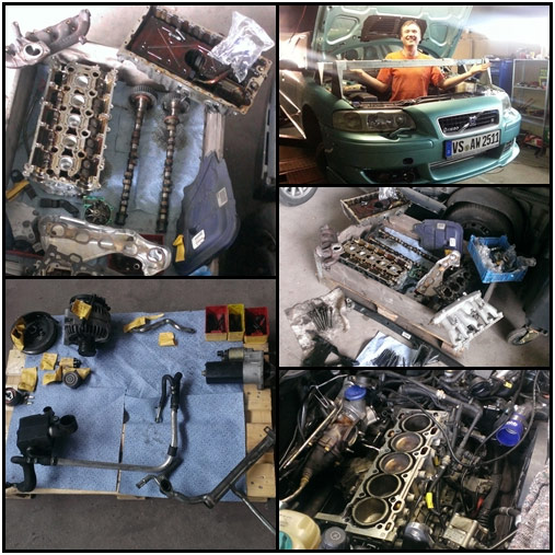 Bei einer weiteren Fahrt im März 2014 passierte leider das unglaubliche, er hatte Kühlwasserverlust und Druck auf dem gesamten Kühlsystem. Mir blieb nix anderes übrig wie das Fahrzeug abzuschleppen. Am darauf folgenden Tag öffnete ich den Motor. Nachdem nun klar was passiert ist, nämlich einen Stegriss in der Zylinderlaufbuchse 1, musste ich relativ schnell reagieren und suchte nach einer Lösung. Ich telefonierte mit ein paar Volvo-Tunern und auch Motorenbauer. Am Ende entschied ich mich für einen gebrauchten Motorblock mit 77.000km und bestellte diesen. Bis der Motorblock eintraf baute ich nun den Rest des Motors und das Getriebe aus. Den Motor zerlegte ich dann nun auch gleich.