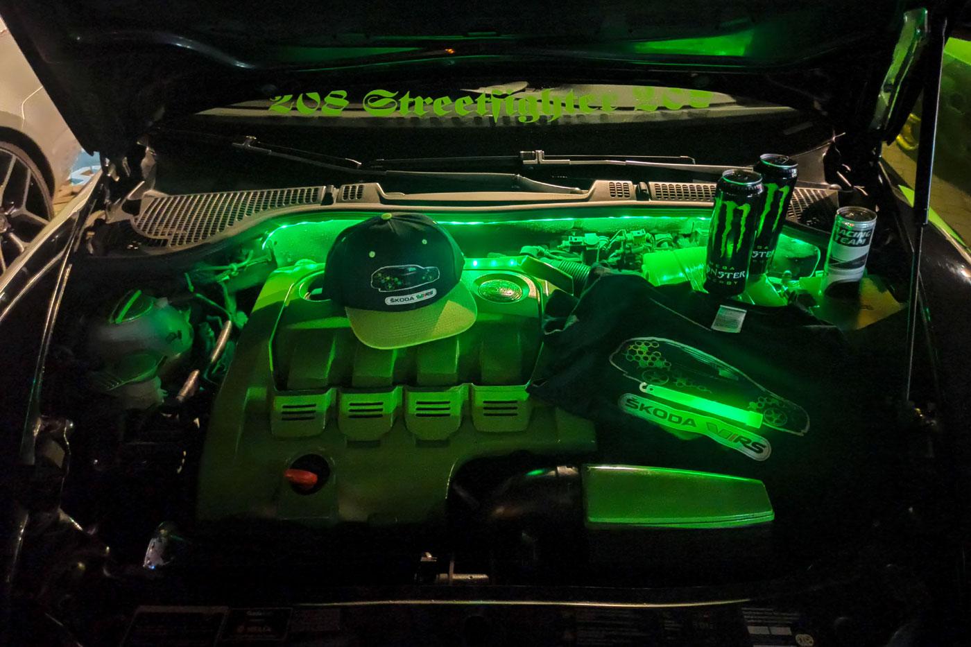 – Fußraumbeleuchtung nachgerüstet, natürlich in Grün
