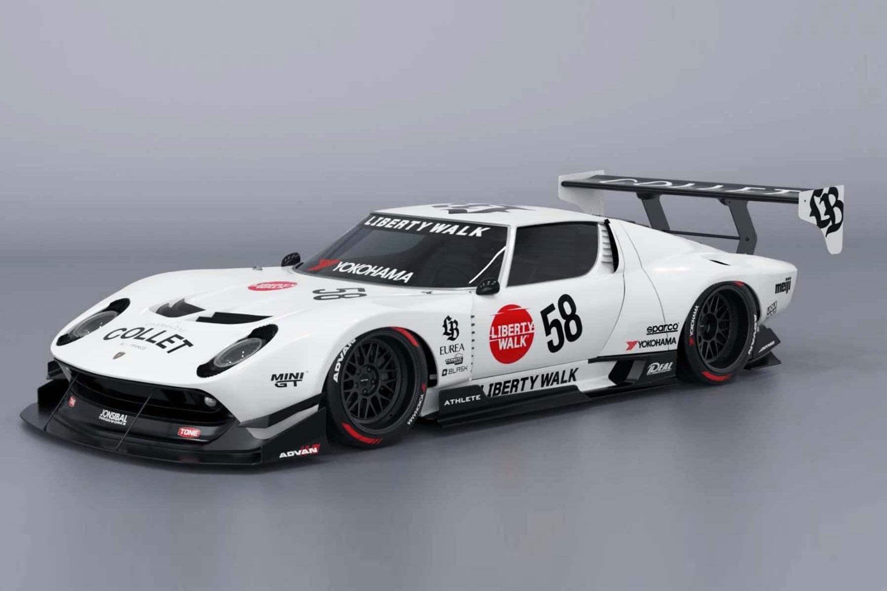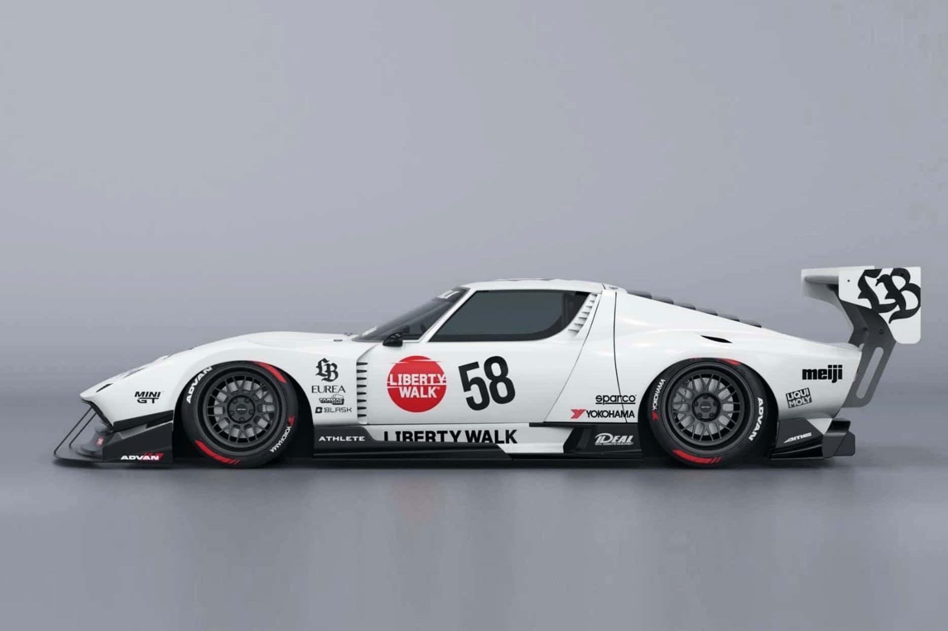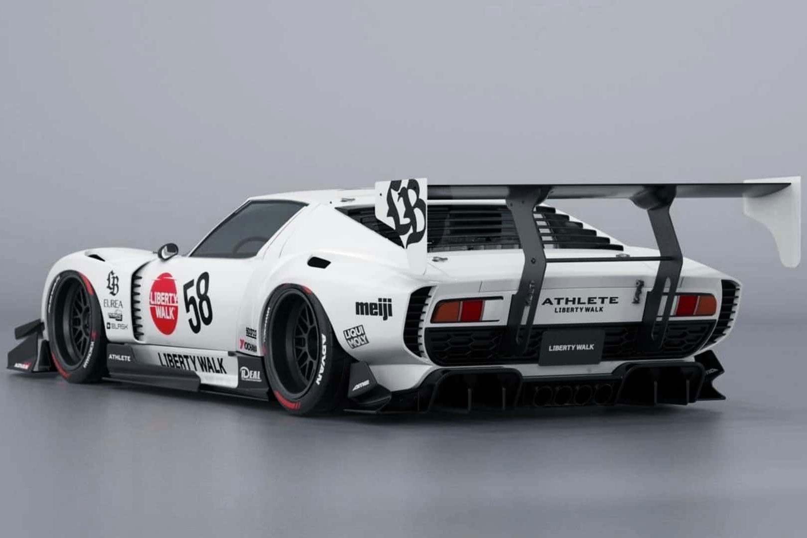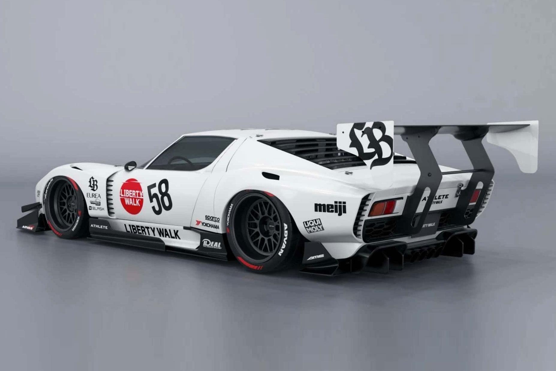 Denn DAS ist der auf den Namen „LB-Silhouette WORKS GT Lamborghini Miura“ getaufte Hingucker auf jeden Fall. Wie man das vom japanischen Tuner kennt, besteht der Umbau aus einem allumfassenden Widebodykit sowie einem monsterfetten Heckflügel und Spoilerwerk ringsum. Dazu wurde das Coupé noch massig tiefer gelegt.