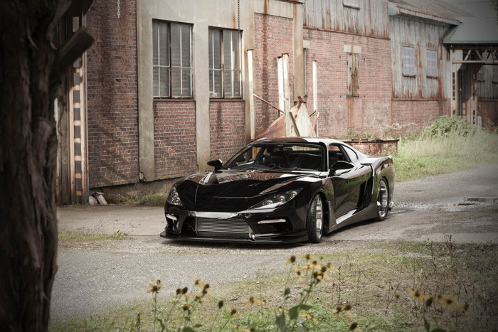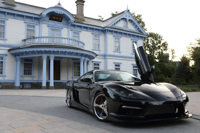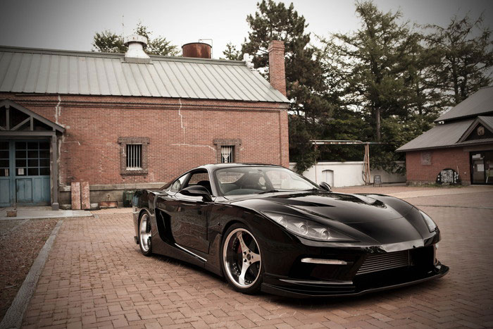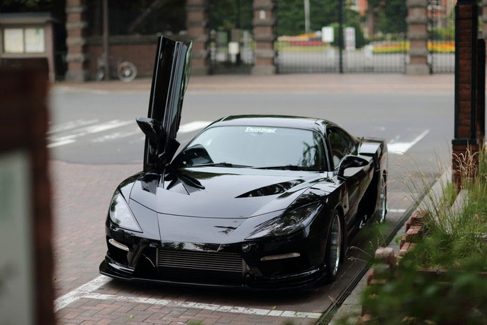 Also, was haben wir denn hier? Auf den ersten Blick könnte dieser Umbau des japanischen Tuners Abflug auch als verbastelter Ferrari durchgehen, doch weit gefehlt. Vielmehr handelt es sich beim „Schwarzer“ genannten Umbau um eine Toyota Supra, die technisch und vor allem optisch tüchtig eingeschenkt bekommen hat – wobei die Flügeltüren fast das kleinste „Übel“ sind.