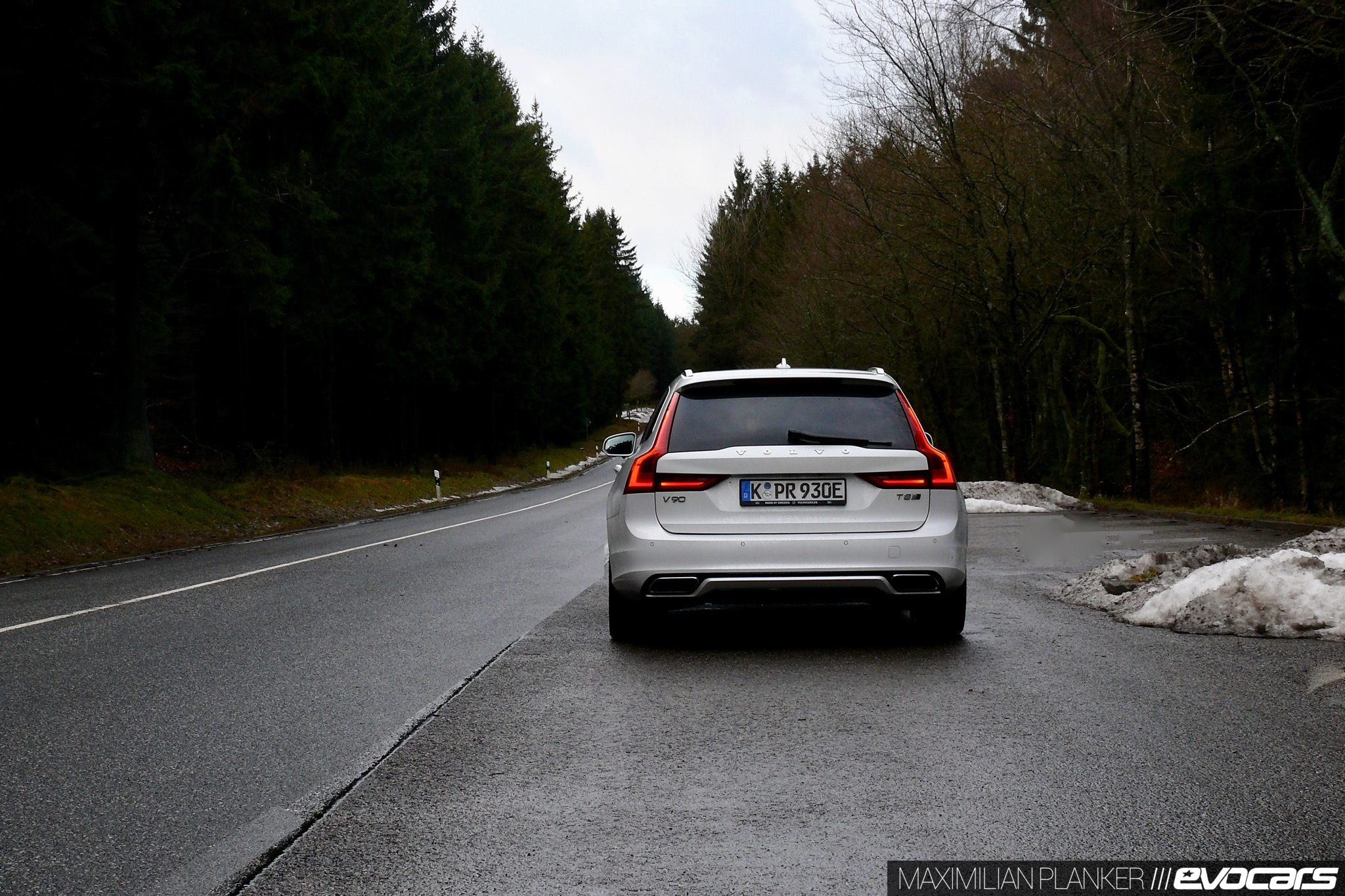 {1}Nun wollen wir keinen Vergleich zwischen dem Volvo und dem Porsche herstellen, das wäre gelinde gesagt auch recht unfair – vor allem für den Volvo, liegt er doch im Grundpreis um etwas mehr als ein Drittel unterhalb des Panamera. Und doch sind die nackten Daten beider Fahrzeuge gar nicht so weit voneinander entfernt: 407 PS Systemleistung packt der Volvo V90 T8 an alle vier Räder, diese müssen wiederum 2130 Kilogramm antreiben. Allerdings tun sie das, was die Verteilung der Antriebskraft angeht, nur bedingt: die 320 PS des Zweiliter-Vierzylinders landen stets an der Vorderachse, während die 87 Zusatzpferdchen des Elektromotors korrigierend an der Hinterachse eingreifen, falls vorne Schlupf auftritt oder der Fahrer in den Allrad- respektive Powermodus wechselt, in denen jeweils beide Motoren stets zusammenwirken. Was den Nachteil hat: es besteht keine starre Verbindung des Verbrenners zur Hinterachse. Ist die Batterie gänzlich leer, kann der E-Motor außer beim Rangieren und Anfahren nur noch wenig zu mehr Grip beitragen.