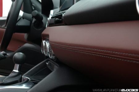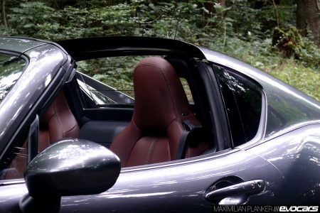 Allerdings bliebe von ihm nicht mehr so viel übrig. Denn eines ist der MX-5 durch den RF-Zusatz nicht geworden: größer. Es bleibt also bei den etwas beengten Platzverhältnissen des Roadsters, an denen wir schon typisch deutsch herumgekrittelt haben. Und die die Passagiere für einen Wochenendtrip an den Bodensee schon an ihre Grenzen bringen können. Da kann einem die Lust am Reisen trotz mehr als ordentlichem Federungskomfort, einer guten Soundanlage von Bose und absolut akzeptablem Verbrauch (wir bewegten den RF zeitweise und wetterbedingt unter sechs Litern pro 100 Kilometer) schon ab und an vergehen, solange einer von beiden Reisenden rund 1,90 Meter groß ist und dieser sich auf den mit schickem braunen Leder bezogenen Sitzen keinen Zentimeter vor oder zurück lehnen kann.