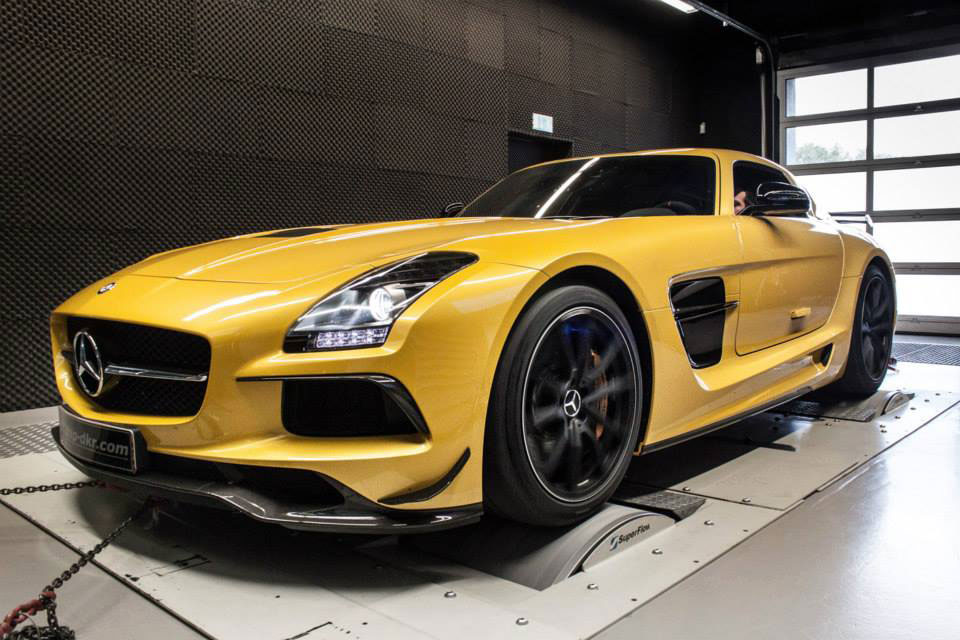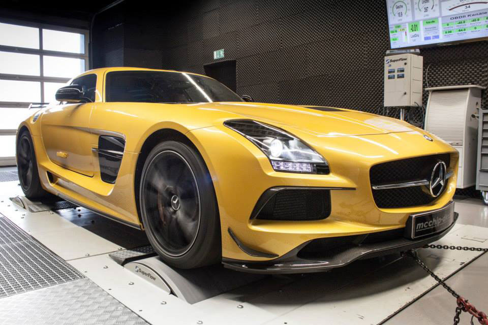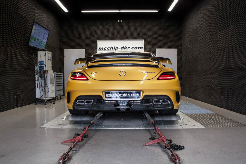 Untermotorisiert ist jetzt nicht unbedingt das erste Wort das uns zum Thema SLS AMG Black Series einfällt, aber es soll ja bekanntlich Leute geben, die immer ein wenig mehr als nur die Standardkost wollen. Um dem Leistungshunger ebendieser Kundschaft Rechnung zu tragen hat Mcchip-DKR ein Stage 1 Tuningkit für den 6.3-Liter-V8 entwickelt, das die Leistung von 631 PS und 635 Nm auf 654 PS und 649 Nm anhebt.