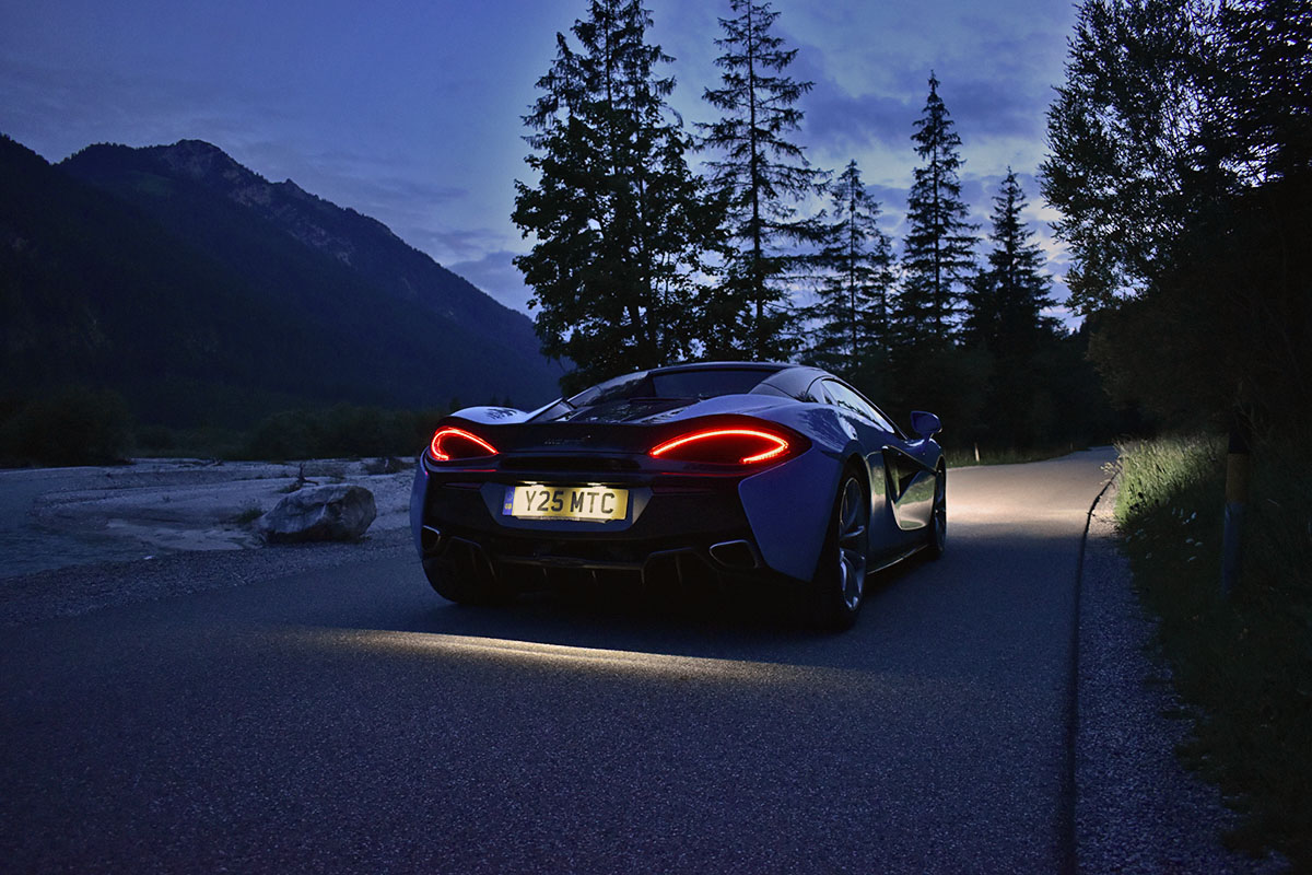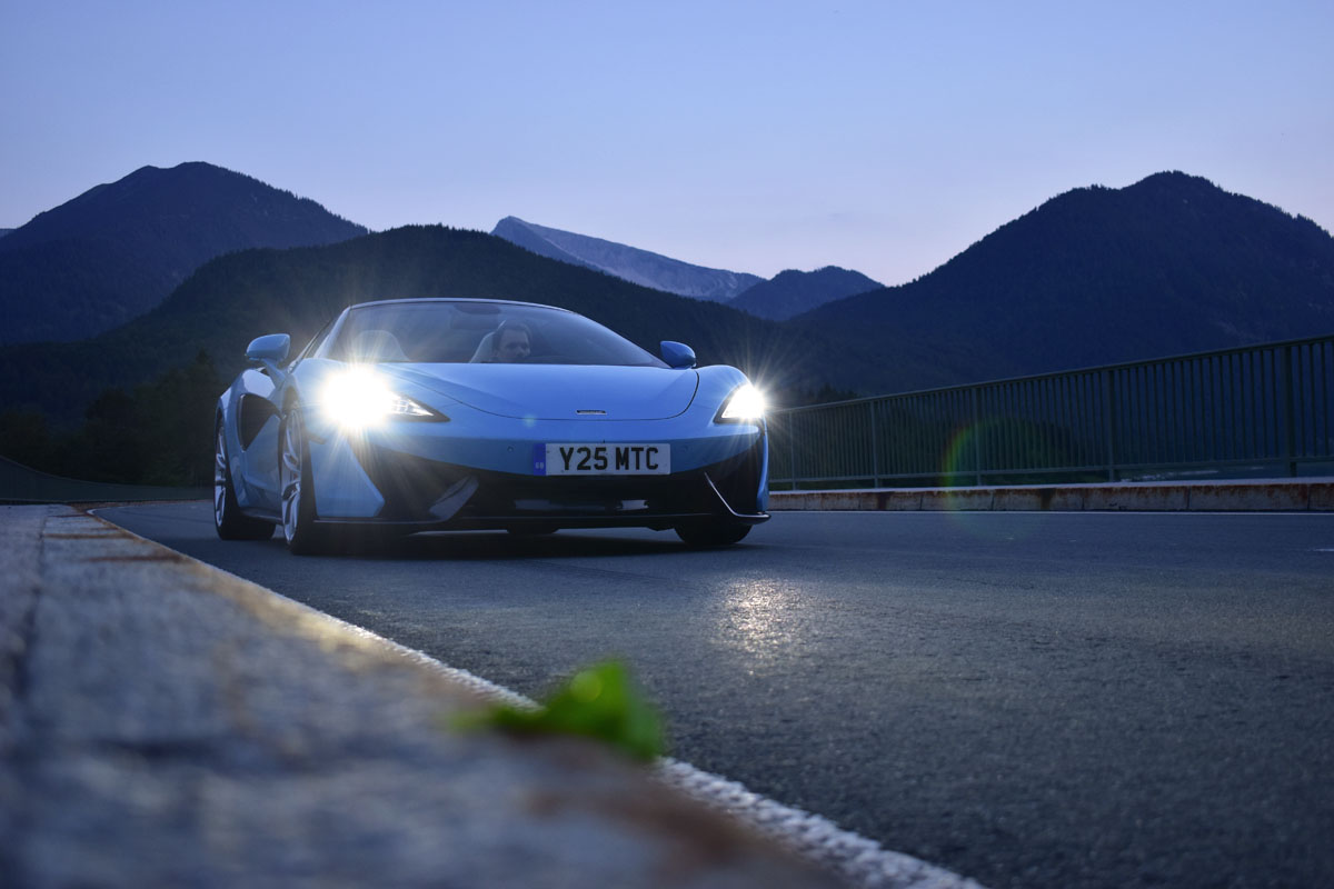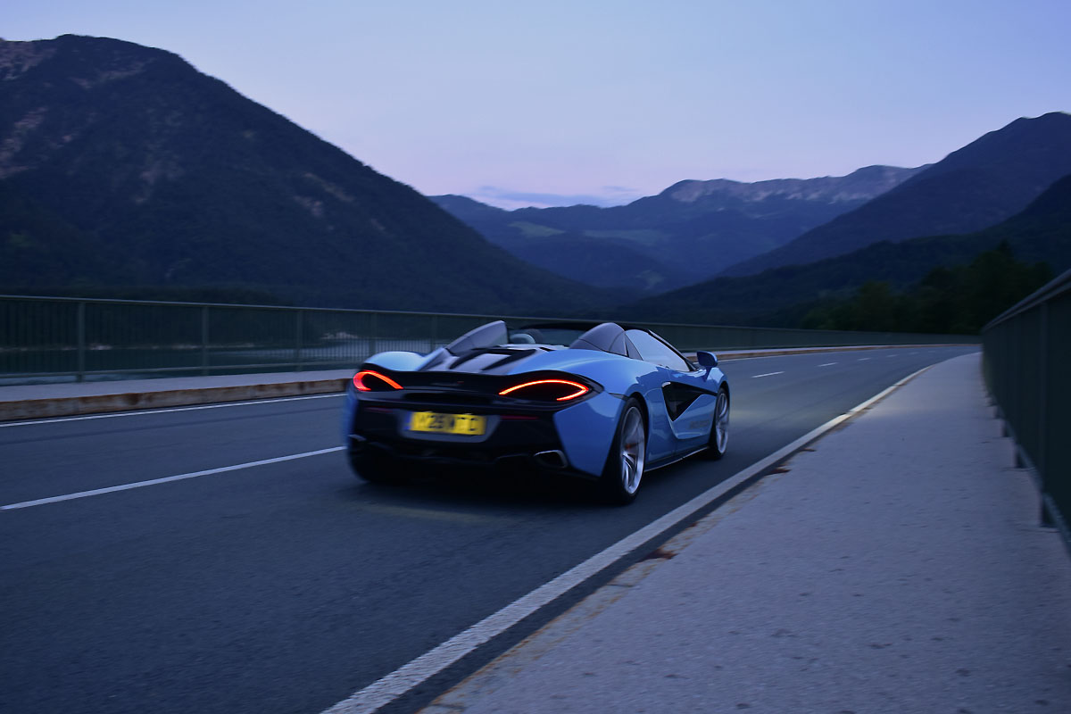 Mit dem McLaren 570S Spider kann man – wie bereits beim Vorgänger – seiner Offenherzigkeit in Form eines exklusiven Automobils Rechnung tragen, sich der Umwelt zeigen oder alternativ die Umwelt auf einen selbst wirken lassen. Wir bevorzugen Letzteres, sehen nicht ein wieso wir 570 PS auf der Münchner Maximilianstraße vergeuden sollten und fahren Richtung Alpenraum. Dabei merken wir schnell, dass der McLaren im Stande ist einen Spagat abzuliefern, den selbst renn-sportliche Mittelklassekombis aus Bayern oftmals nicht hinbekommen: weich zu federn und im Bedarfsfall knallhart (aber nicht bockig) auf der Straße zu liegen.