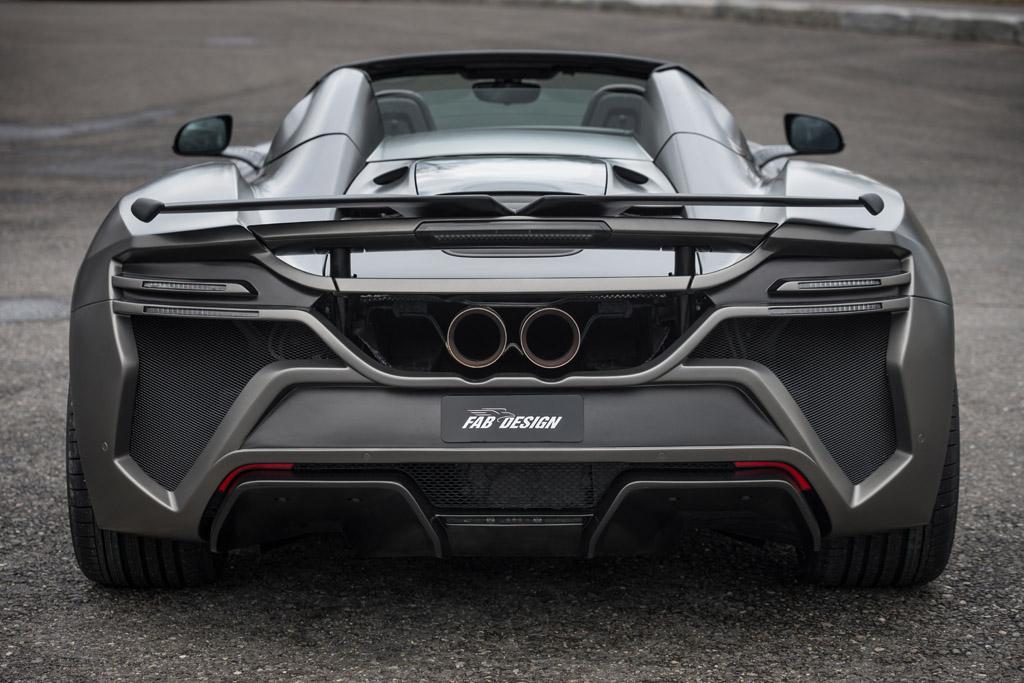 Das Bodykit umfasst alle Partien des MP4-12C und wird ergänzt um dreiteilige 20-Zoll-Alus mit 275/25 ZR20er Bereifung vorn und 325/30 ZR20er Schlappen hinten. Außerdem verbaut FAB Design eine neue Abgasanlage die für 32 PS extra gut sein soll. Damit stehen dann 657 PS zur Verfügung, also sogar etwas mehr als beim 650S.