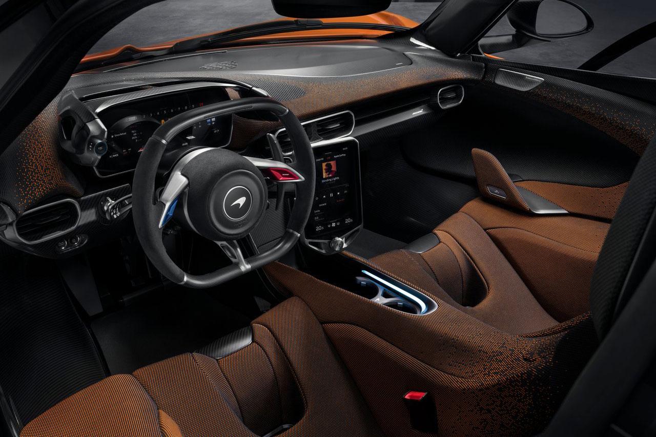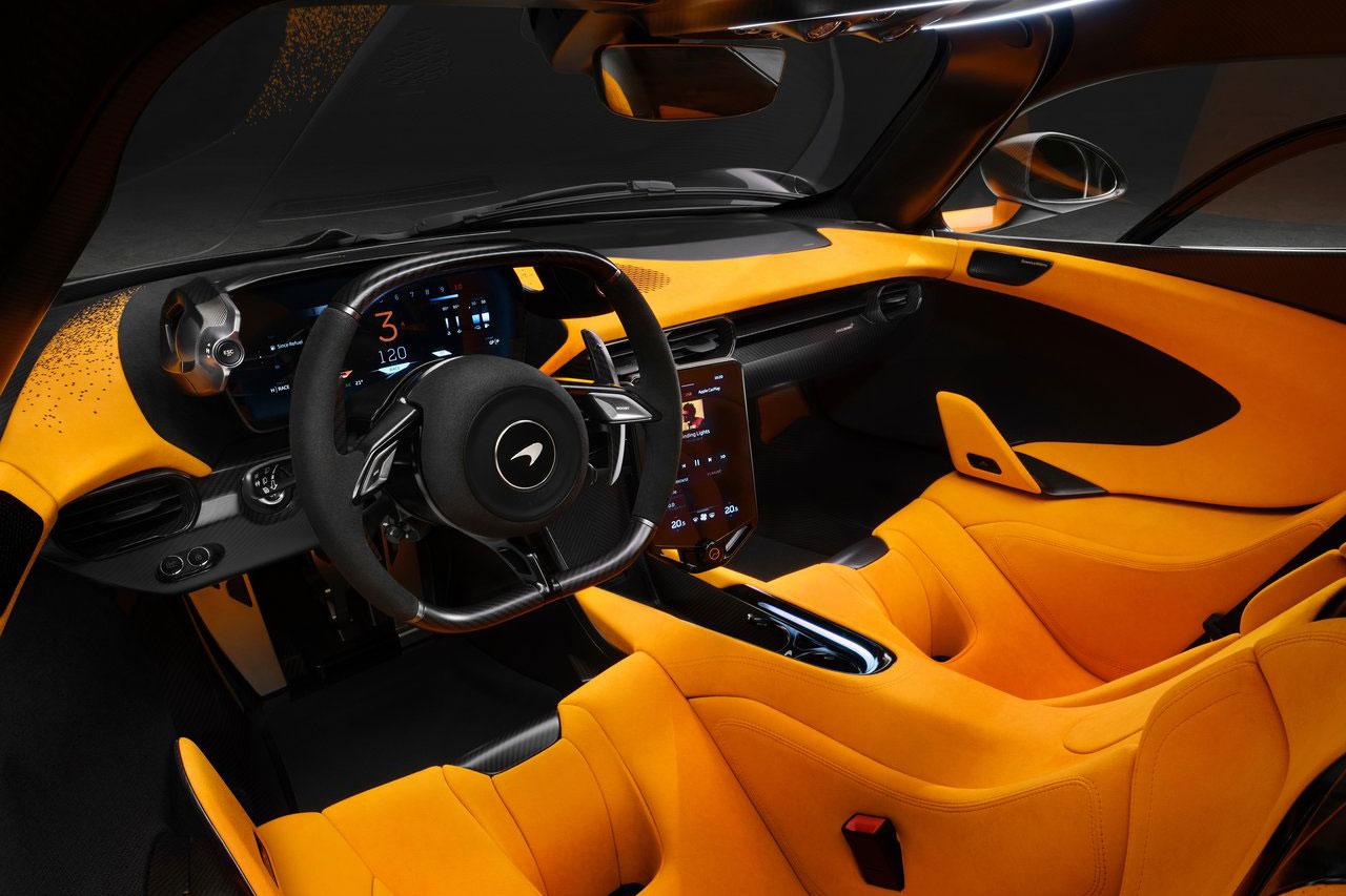 Mit seinen festen Sitzen und erhöhten Fußräumen ähnelt die Fahrposition des McLaren W1 eher einem Sport-Prototyp-Rennwagen – in der Praxis ist er jedoch auf höchsten Fahrgastkomfort ausgelegt. Die schrägen Türen verfügen über einen geformten konkaven Abschnitt an der Innenseite, um den Platz für die Fahrgäste zu maximieren, und eine freitragende Türlamelle, die von den Fahrgästen wegzuschweben scheint – minimalistisch, aber dennoch schön und funktional.