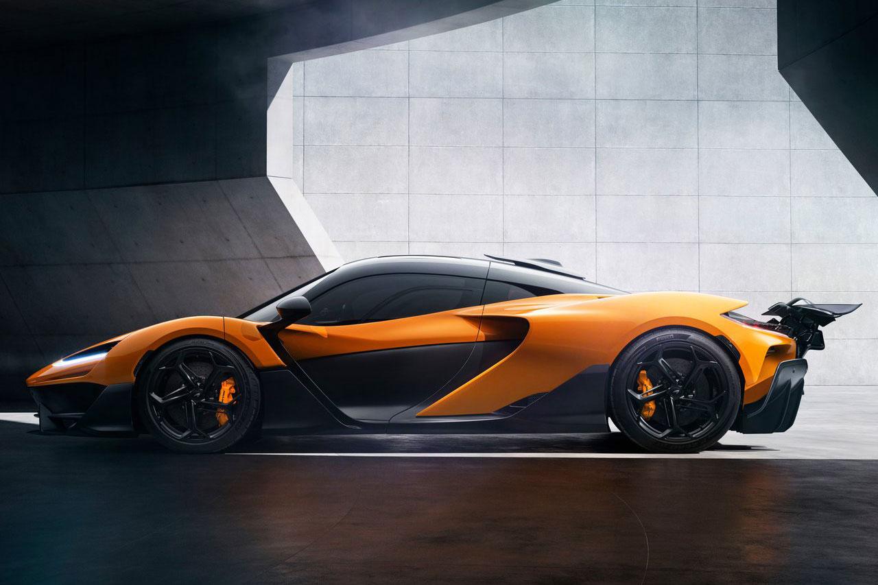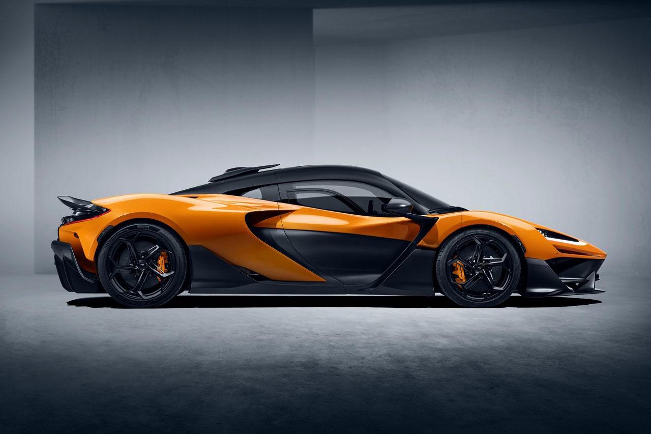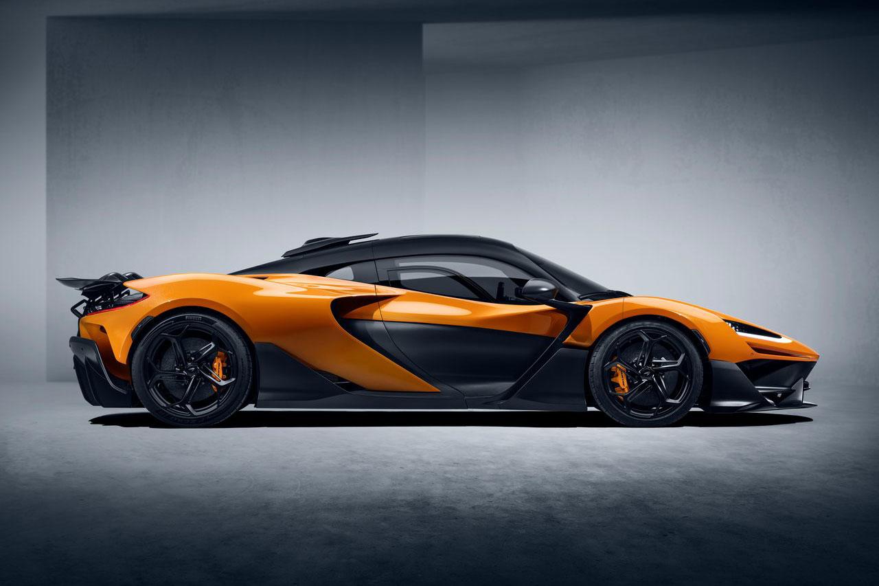 Die Seitenansicht des W1 wird von einem breiten Ausschnitt für die konvex geformte Tür dominiert, der Platz schafft, damit die Luft über zwei Auslässe aus dem vorderen Radkasten entweichen kann – durch die die vorderen Aufhängungsarme sichtbar sind – und zwei große Einlässe vor dem Heckbereich. Der auffälligste davon, der die Hochtemperaturkühler speist, ist vom Design der Seitenkästen der Formel 1 beeinflusst. Seine dreieckige Form bietet einen Hinterschnitt, in dem sich der zweite Einlass vor dem Hinterrad befindet und über einen Kanal verfügt, der den Heckdiffusor speist. Sogar die Seitenspiegel wurden mit Blick auf die Aerodynamik entworfen; sie sind so weit außen wie möglich auf einem Stützblatt platziert und so geformt, dass sie ihren Sog vom Heck des Autos wegleiten und so die Effizienz der Kühler oder des Active Long Tail-Flügels nicht beeinträchtigen.