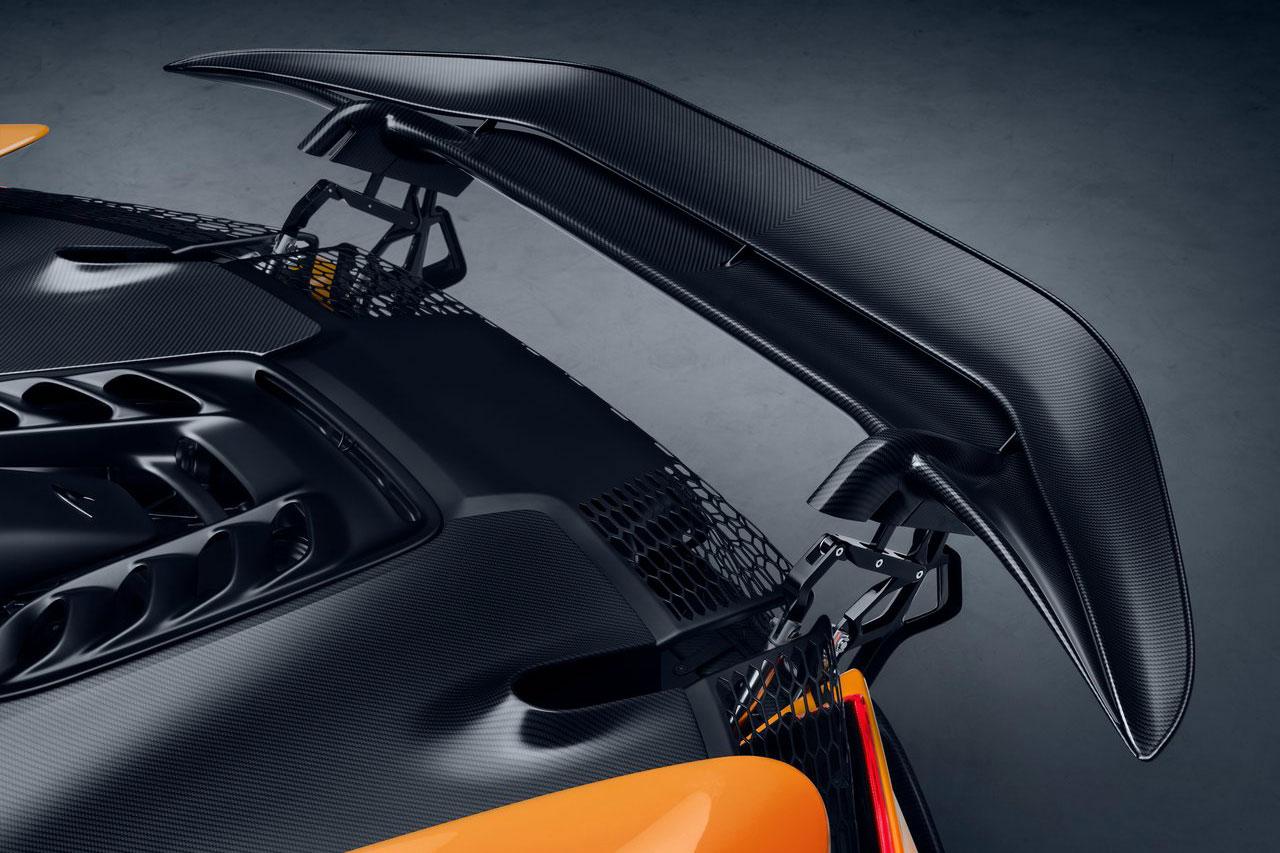 Der strukturelle Heckdiffusor ist der extremste, der in einem McLaren-Straßenfahrzeug verbaut wurde. Er beginnt hinter dem Kabinenabschnitt und vor der Hinterachslinie nach oben zu wölben – wodurch die Luft expandiert und Abtrieb erzeugt wird. Um dieses große Element unterzubringen, wurde der Antriebsstrang um 3 Grad geneigt und die Hochtemperaturkühler und die hinteren unteren Querlenker der Aufhängung wurden angehoben, um Platz unter dem Boden zu schaffen. Der Diffusor selbst ist mit dem Antriebsstrang verschweißt und mit markanten Zäunen detailliert gestaltet. Er arbeitet mit dem Active Long Tail-Flügel zusammen, um den Abtrieb zu maximieren.