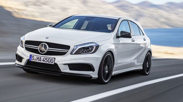 Außen erkennt man den A 45 AMG am Twin-Blade-Kühlergrill und den titangrau-matt lackierten Zierelementen. Dazu gibt es aerodynamische Flics an der AMG-Schürze, spezielle Schwellerverkleidungen und eine Heckschürze mit Luftauslässen neben der AMG Sport-Abgasanlage mit zwei eckigen Endrohren. Innen findet sich eine Mischung aus Leder und Mikrofaser, dazu gibt es rote Kontrastnähte, sowie die obligatorische AMG DRIVE UNIT.