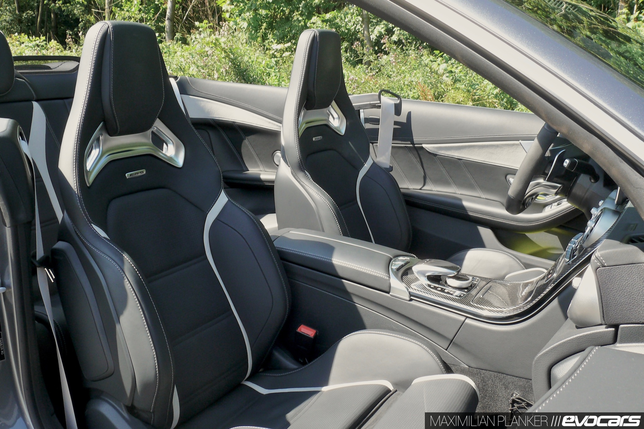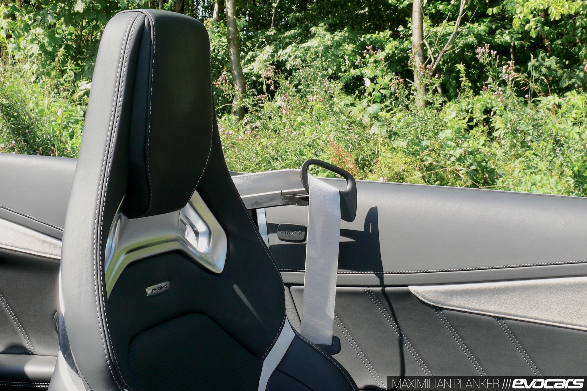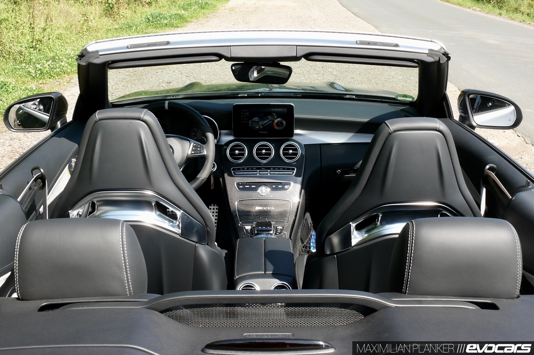 {1}Dabei braucht man heutzutage auch einfach nicht mehr als eine C-Klasse. Die Platzverhältnisse auf den vorderen beiden Plätzen stimmen schonmal und hinten nimmt man im Cabriolet höchstens im Bedarfsfall jemanden mit, der sich dann zumindest über orkanartige Böen rund ums Haupthaar beschweren kann, aber nicht über mangelnde Knie- respektive Beinfreiheit. Ebenso wirken Verarbeitungsqualität und die Auswahl der Materialien hochwertiger als in der größeren E-Klasse. Und zuletzt machen die Abmessungen und der Wendekreis des V8-Cabrios im Alltagsbetrieb deutlich, dass man es beim C 63 S nicht mit einer schwer zu händelnden Diva zu tun hat. Wir würden allerdings auf die AMG Performance-Sitze zu 2.320,50 Euro verzichten. Zwar bieten sie in allen Lebenslagen perfekten Seitenhalt, doch waren sie uns auf Dauer zu hart gepolstert und die hohen Seitenwangen erschwerten das Einsteigen. Ferner war die Verstellung der überaus kräftigen Lordose nur mit Mühe oder besser bei geöffneter Tür zu erreichen. Ein wenig Kritik verträgt auch das Rotkäppchen in Form des Stoffverdecks, das bei langsamer Fahrt über schlechte Straßen leichte Klapper- und Knarzgeräusche entwickelte und ferner stets vor dem Öffnen den Gang zum Kofferraum erforderte, um die Klappe der Verdeckabdeckung zu öffnen. Eine solche Aufgabe sollte doch im Jahr 2017 von einer Hand voll Sensoren erledigt werden, oder sind wir etwa zu verwöhnt?