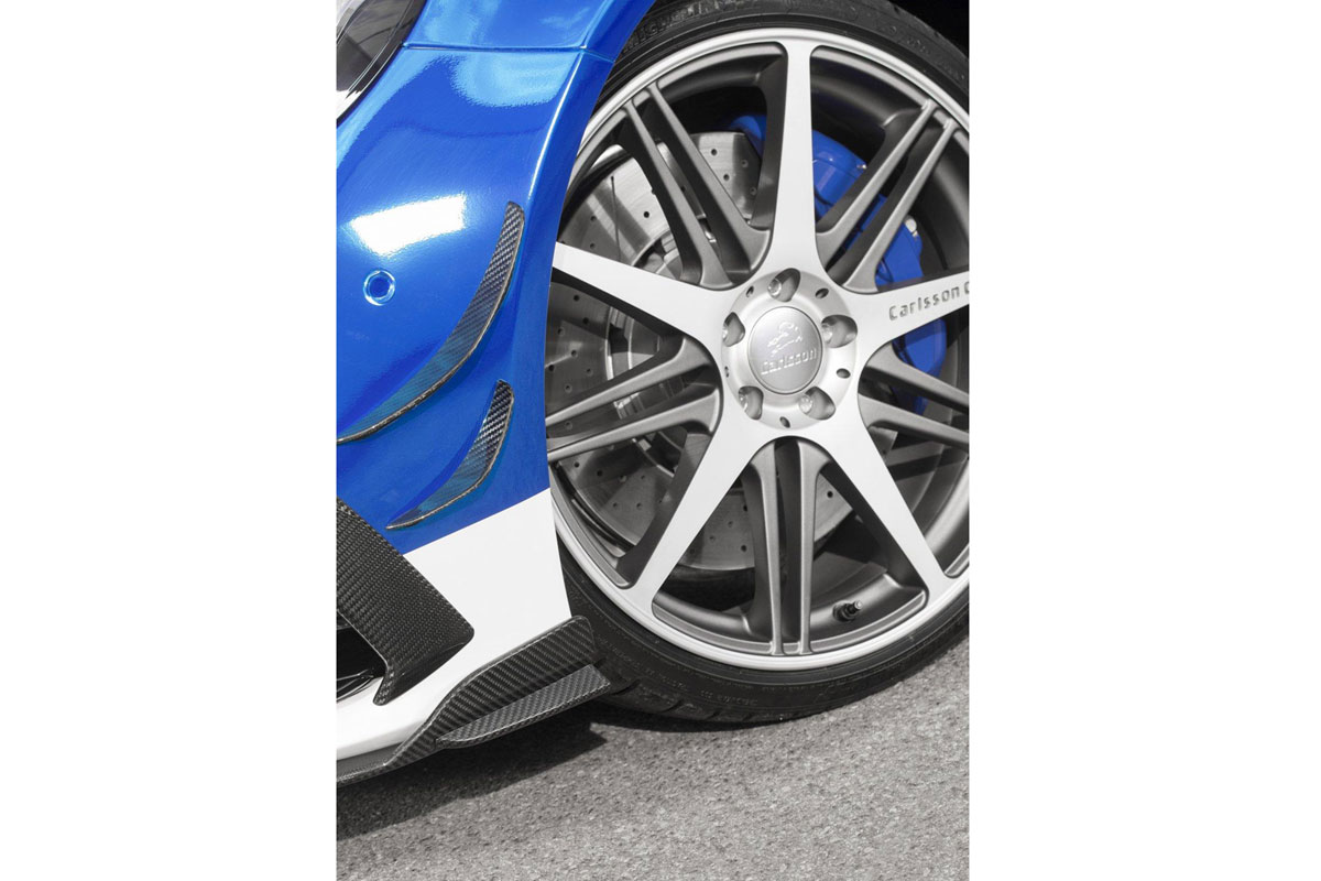 Dann, ja dann gefällt uns der auf den Namen Carlsson CC63S Rivage getaufte Wagen durchaus. Für die Front kann eine neue Spoilerlippe geordert werden, die Lufteinlässe wurden umgestaltet und an den Seiten kommen Luftleitfinnen zum Einsatz. Zudem bietet der Tuner Kotflügelaufsätze und neue Schwellerflaps an.