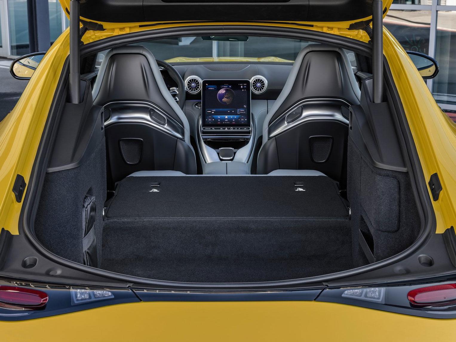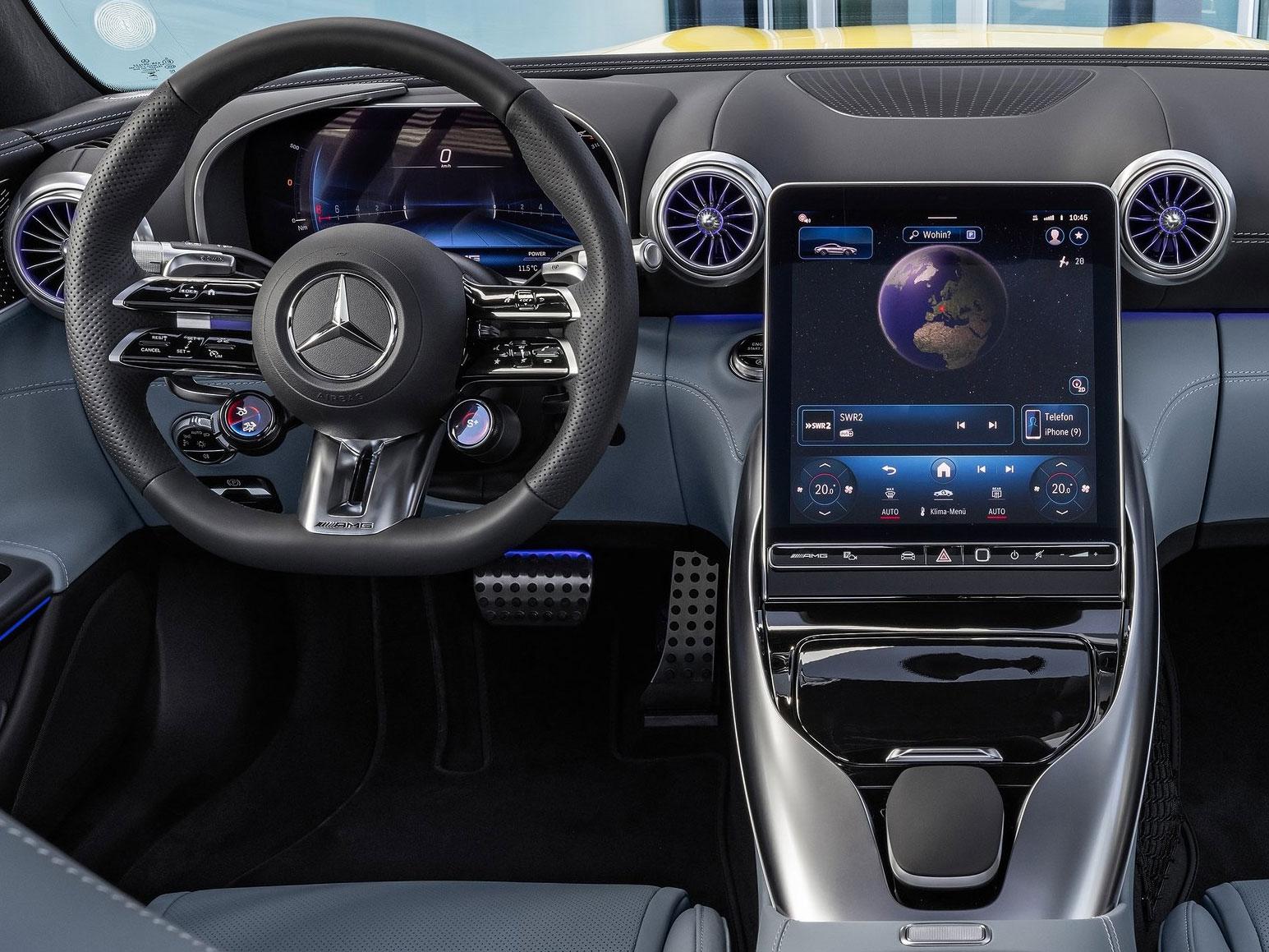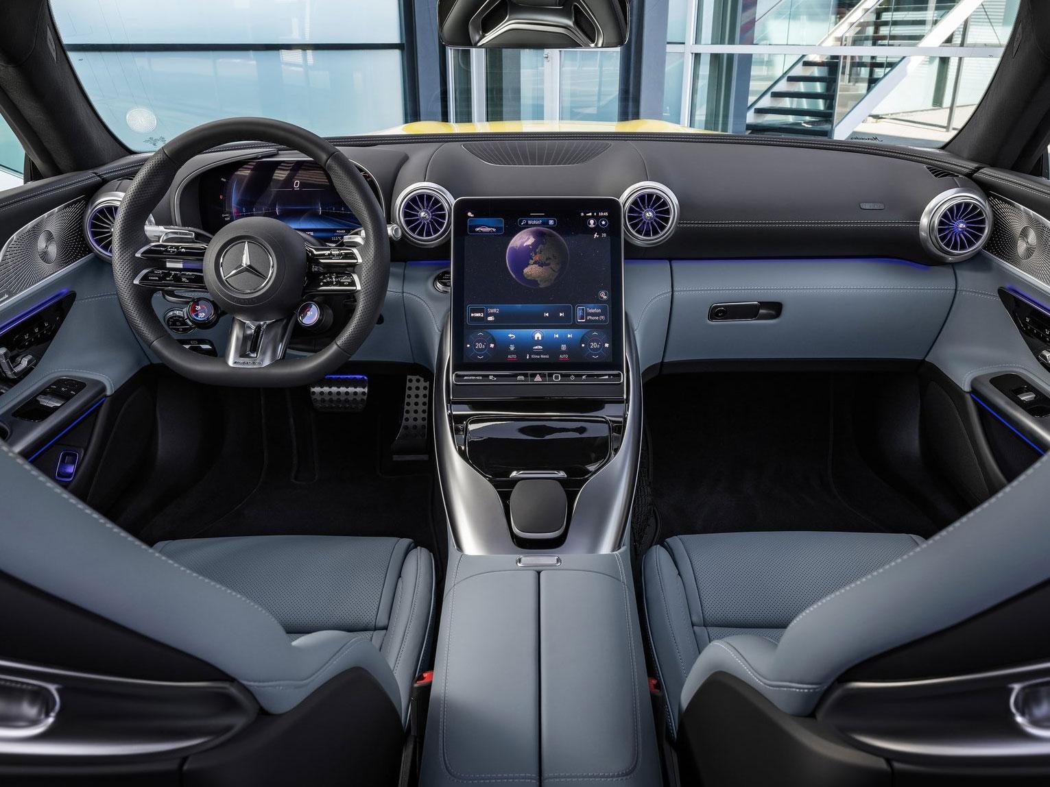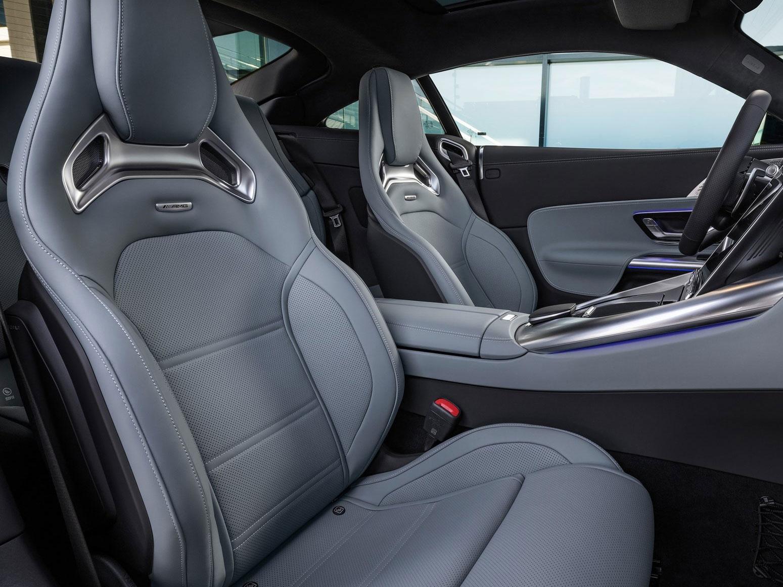 Im Innenraum sind die Sitze standardmäßig mit Nappaleder bezogen und die individuell anpassbaren AMG-Performance-Sitze sind ebenfalls zu haben. Kunden, die das Individualisierungsprogramm wählen, haben die Wahl zwischen drei verschiedenen Farbkombinationen. Mit dem Manufaktur-Interieur-Paket stehen sogar sieben unterschiedliche Farbgebungen zur Auswahl. Die Dekorelemente im Innenraum können in verschiedenen Ausführungen gestaltet werden, darunter Hochglanz-Schwarz (standardmäßig), Carbon, Aluminium oder Manufaktur Chrom Schwarz.