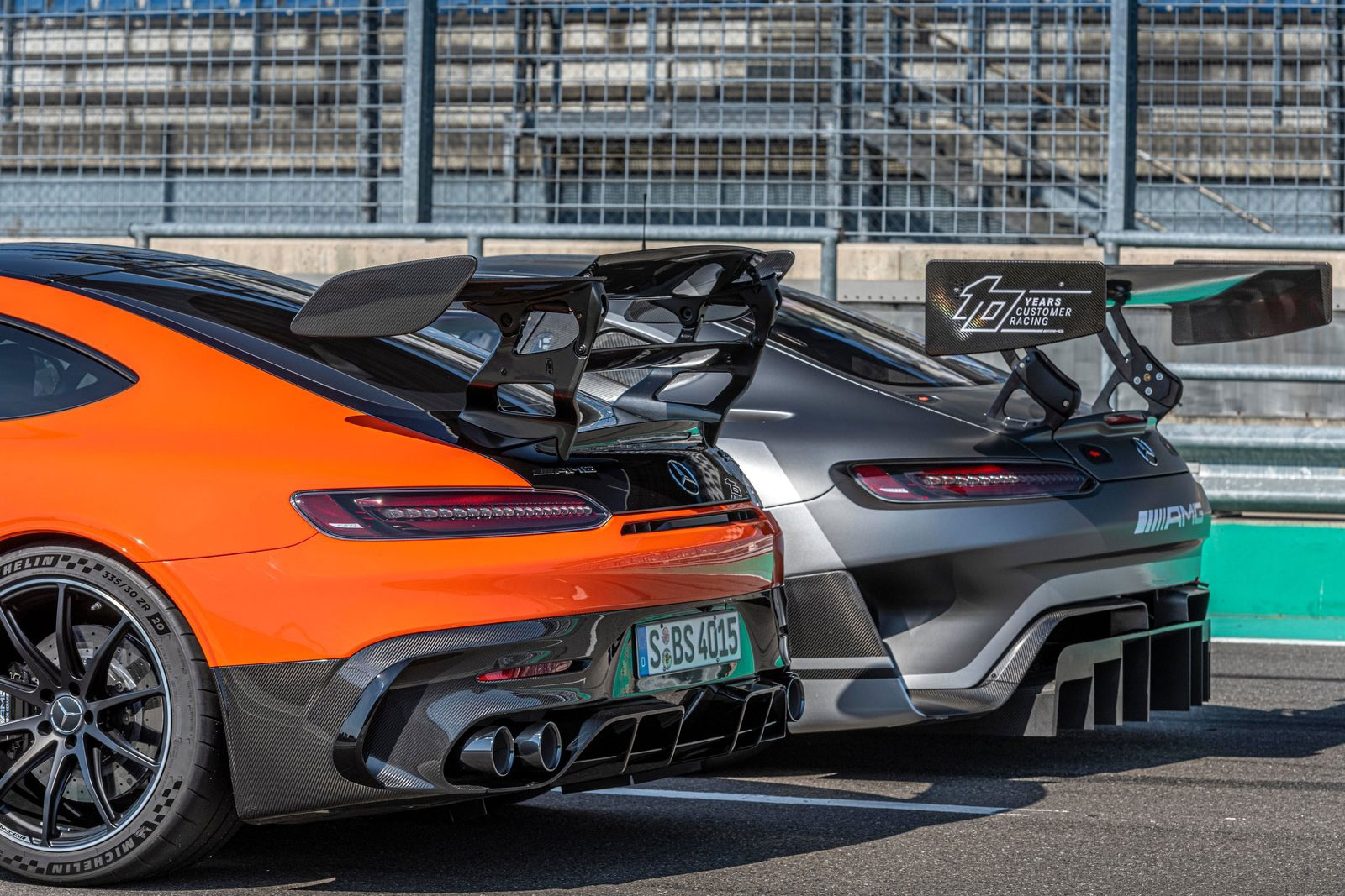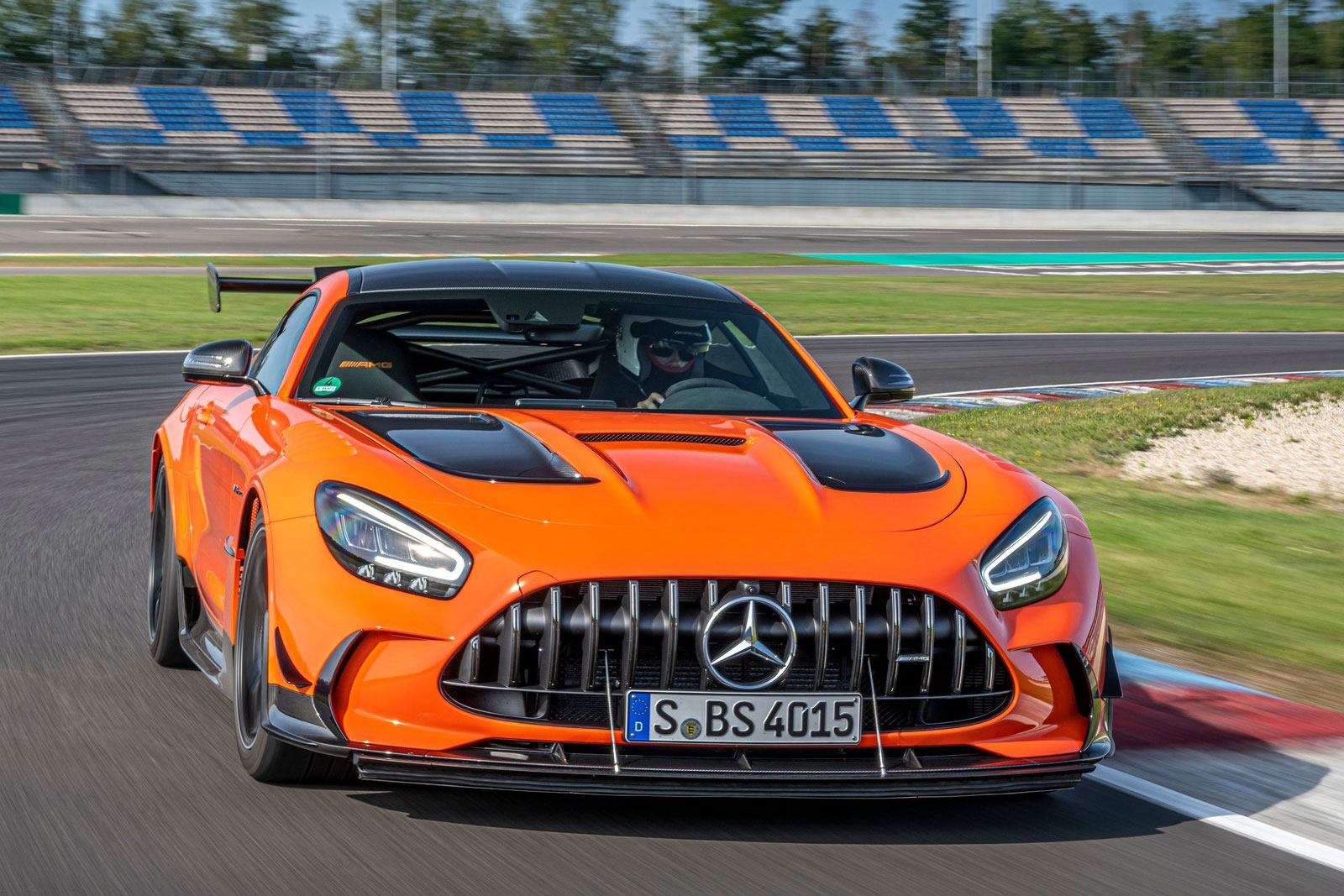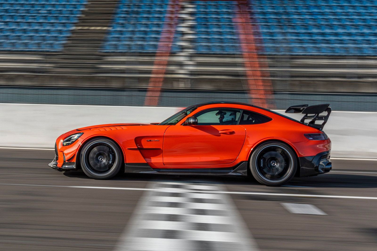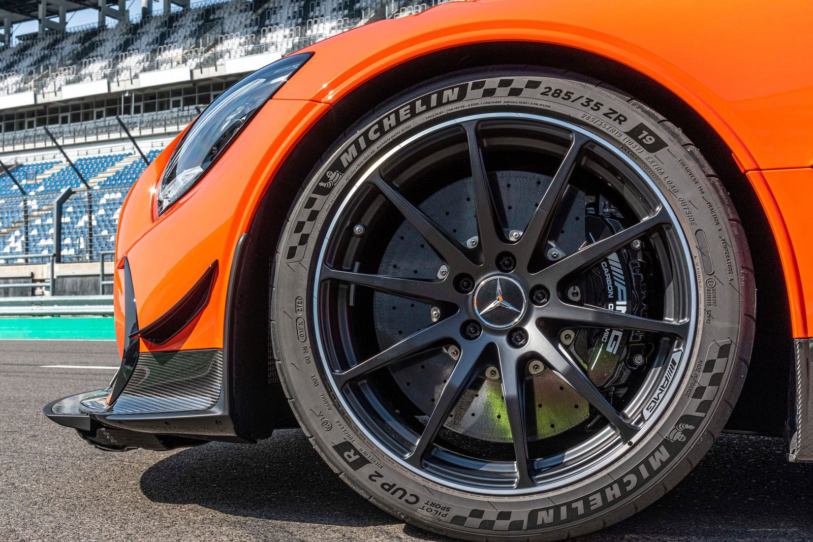 Auch sonst schreit im Flügel-GT alles nach Rennwagen: Carbon allerorten, Dünnglasscheiben, Schraubfahrwerk mit Verstelldämpfung. Schalensitze sind ebenso serienmäßig wie eine zigfach einstellbare Traktionskontrolle. Besonderes Schmankerl: der Mercedes-AMG GT Black Series kommt mit zwei verschiedenen Reifenmischungen.