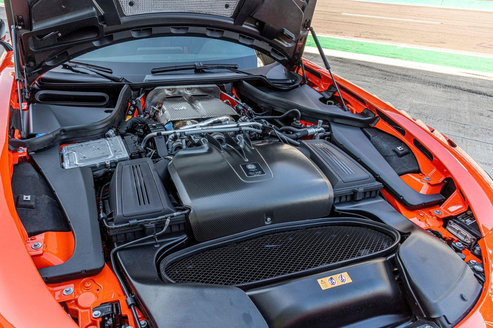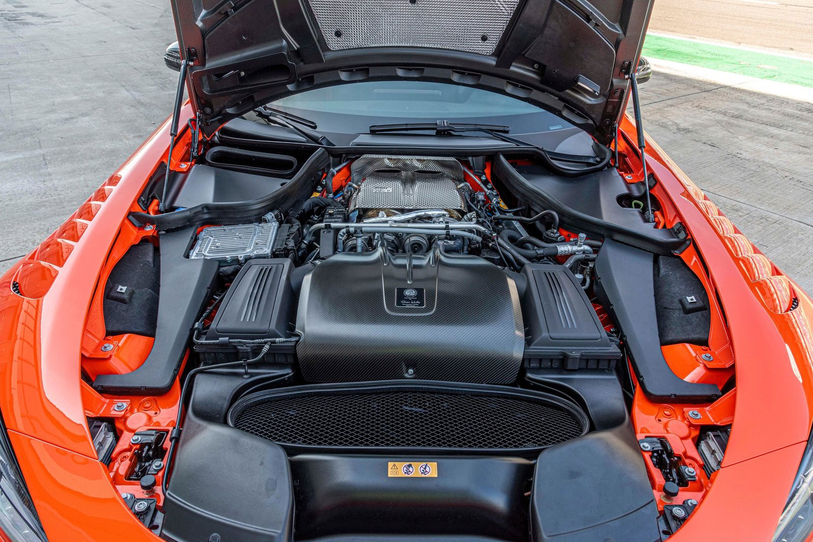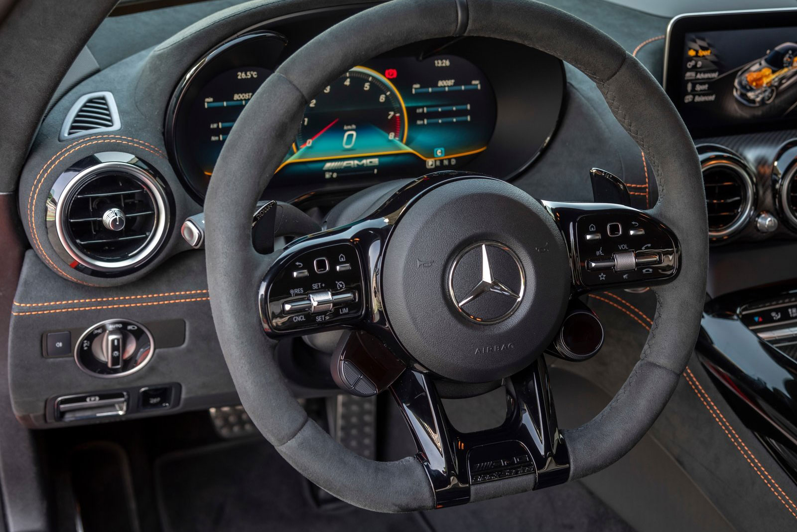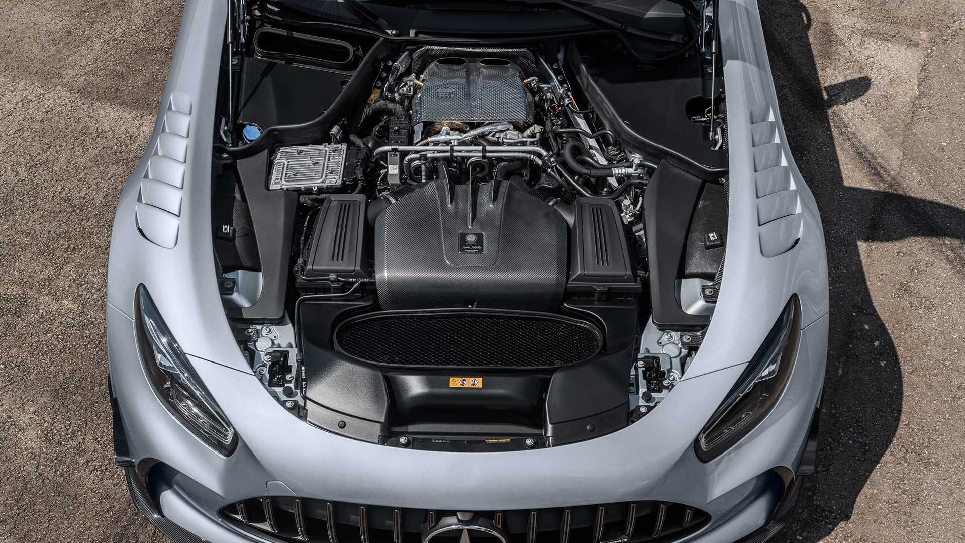Soviel Druck ist auch nötig um die Kraft des V8-Biturbos auf die Strasse zu bringen. 730 PS und 800 Nm leistet der Vierliter-Motor, der grundlegend überarbeitet wurde. Im Gegensatz zu allen andere AMG-V8 arbeitet im Mercedes-AMG GT Black Series eine Flat-Plane-Kurbelwelle. Statt des stämmig wummernden AMG-Beats entweicht dem schwarze-Serie-GT entsprechend ein nervöser Rennwagen-Sound analog eines Ferrari.