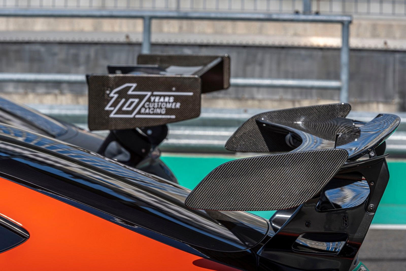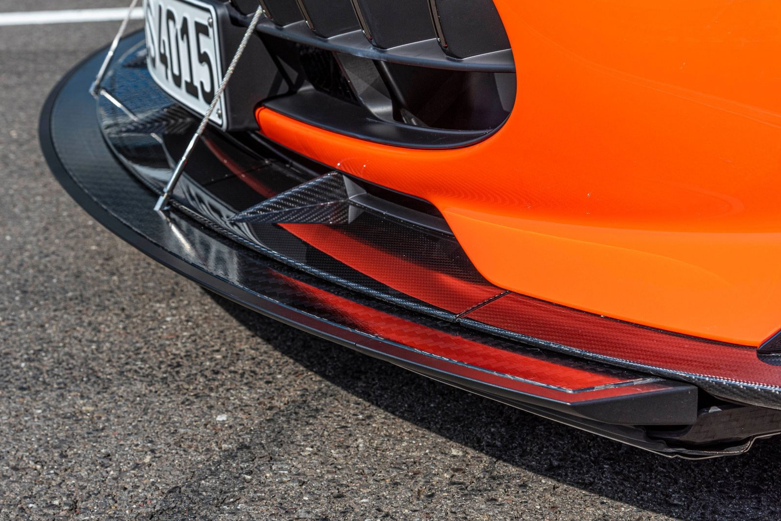 {1}Die Front mit dem gigantischen Kühlergrill ist ebenso vom Rennwagen übernommen wie die Philosophie hinter dem Aerodynamik-Paket. Der Splitter am Vorderwagen ist einstellbar, alle Luftlöcher in der Front helfen Abluft und Abtrieb zu generieren. Am Heck ist aber klar der gewaltigste Hingucker.