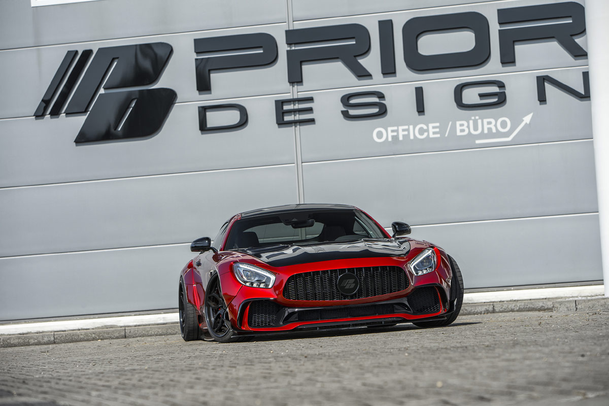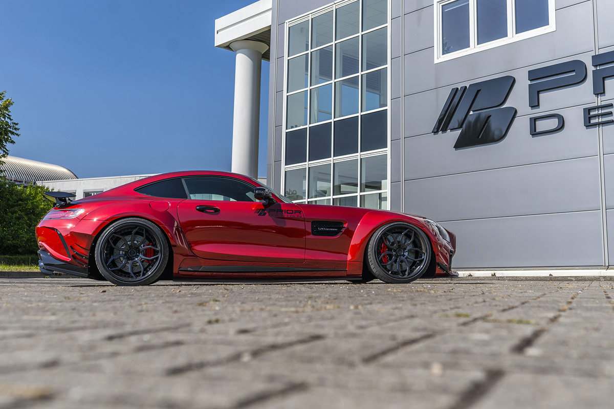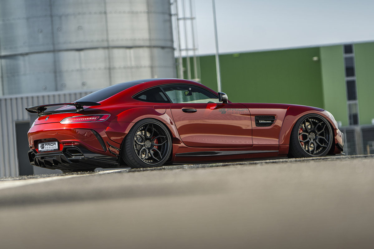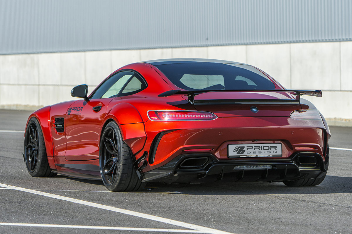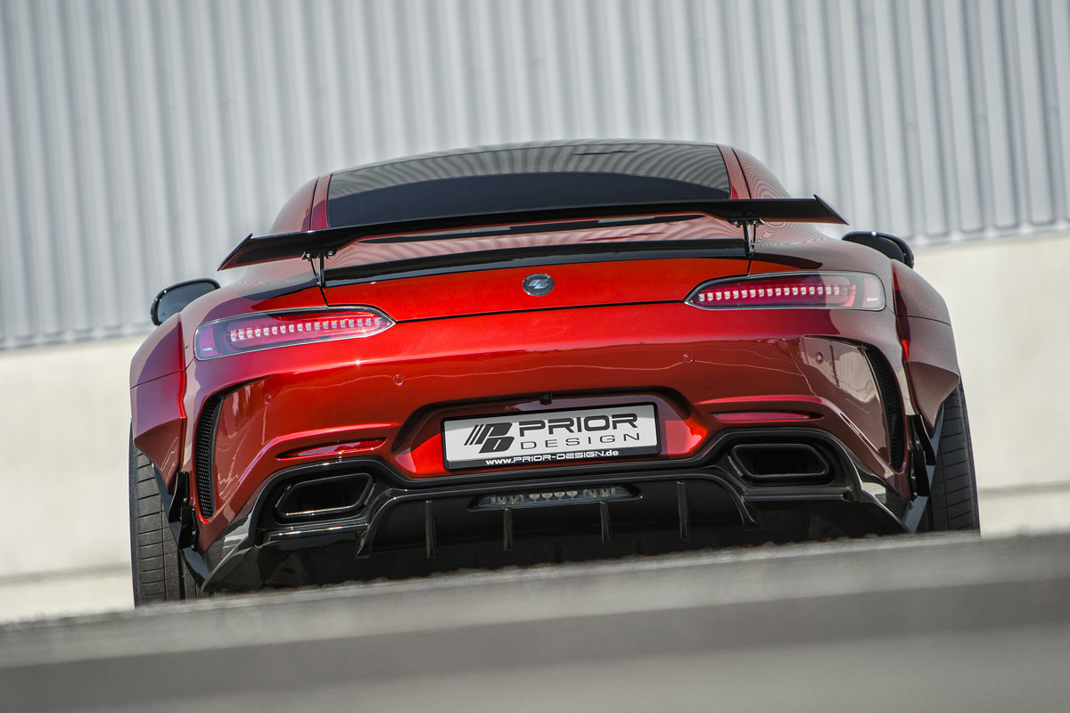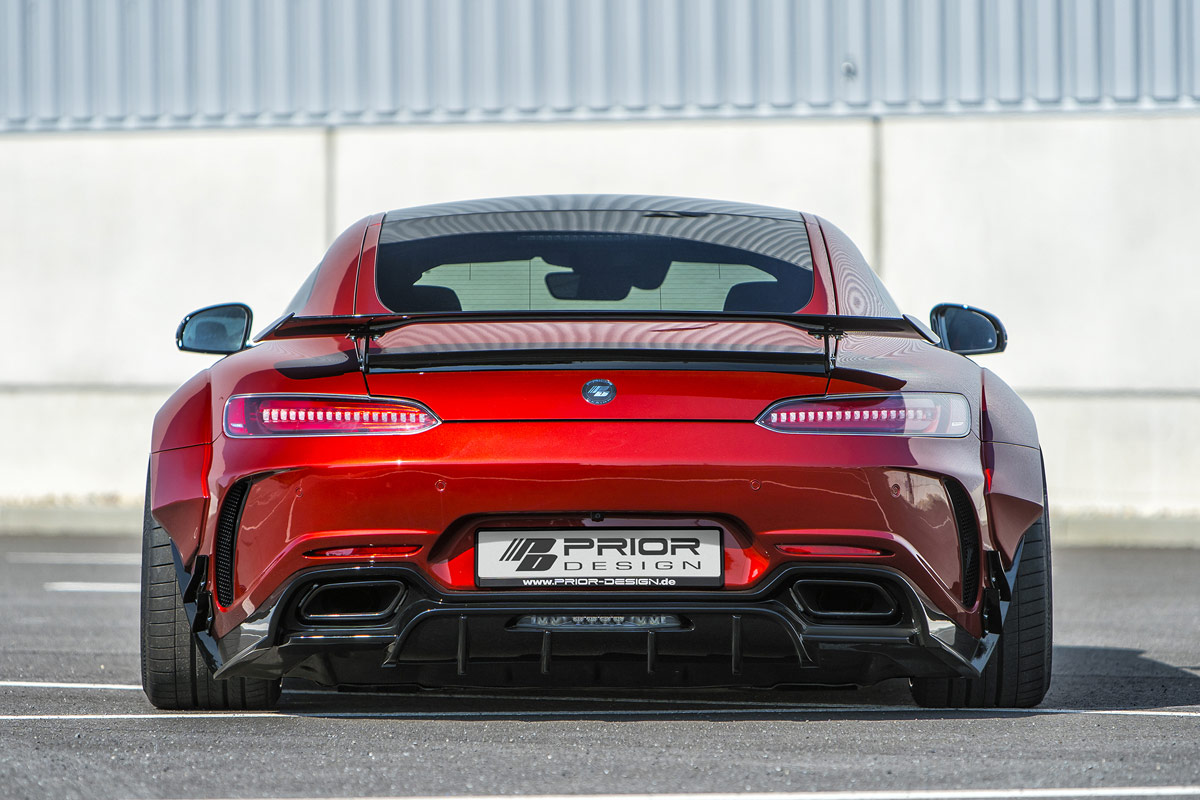 {1}Das neue Bodykit besteht aus Karosserie-Verbreiterungen an Vorder- und Hinterachse, neuen Seitenschwellern und kompletten Front- und Heckschürzen – vorne mit Spoilerlippe und Cupwings, hinten mit Diffusor und Cupwings. Eine Motorhaube und der mehrteilige, feststehende Heckspoiler runden das Paket ab. Produziert wird der Bodykit auf Wunsch komplett aus Carbon. Zwingend notwendig ist bei derart vergrößerten Rad- kästen ferner ein neuer Felgensatz: Der AMG steht auf geschmiedeten Prior Design PD3Forged-Rädern mit fünf Doppelspeichen. Die Dimensionen der Dreiteiler betragen 9,5×20 und 12,5×21 Zoll, die Continental- Bereifung misst 245/30 ZR20 und 305/25 ZR21.
