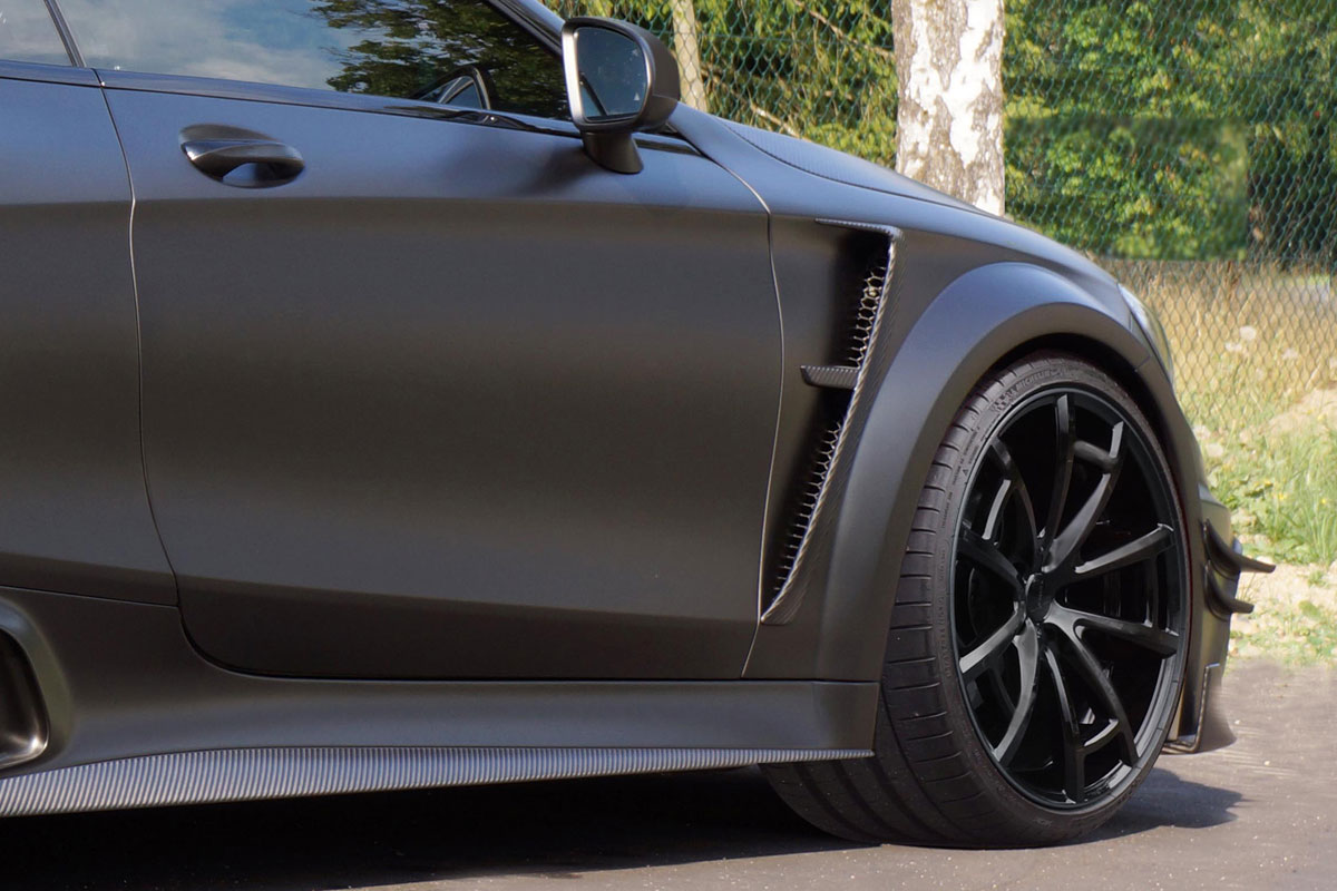Das neue Bodykit besteht aus einer Frontschürze mit großen Luftöffnungen und seitlichen Luftleitelementen, einer Leichtbau-Motorhaube, Carbon-Kotflügeln vorn, eingepassten Verbreiterungen an den hinteren Kotflügeln, neuen Seitenschwellern, Carbon-Gehäusen für die Außenspiegel, einem Dach- und Heckspoiler aus Carbon sowie einer neuen Heckschürze mit Diffusor-Optik.