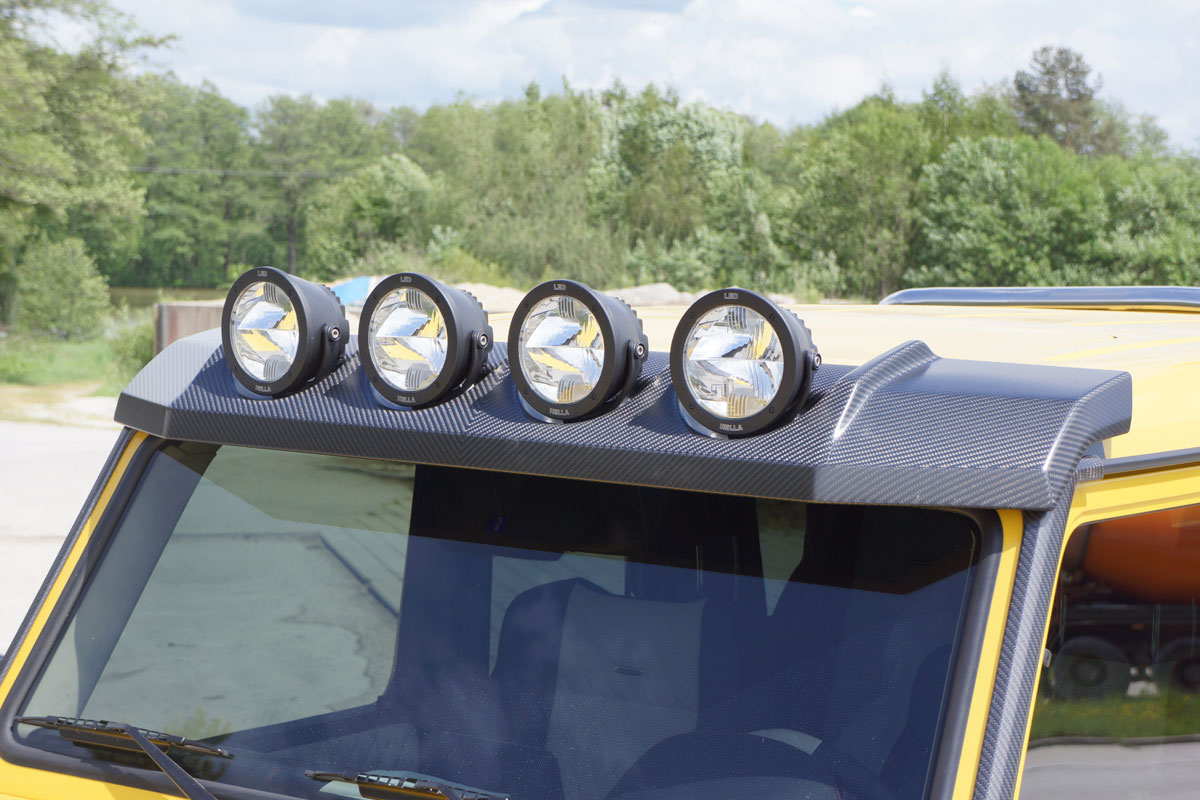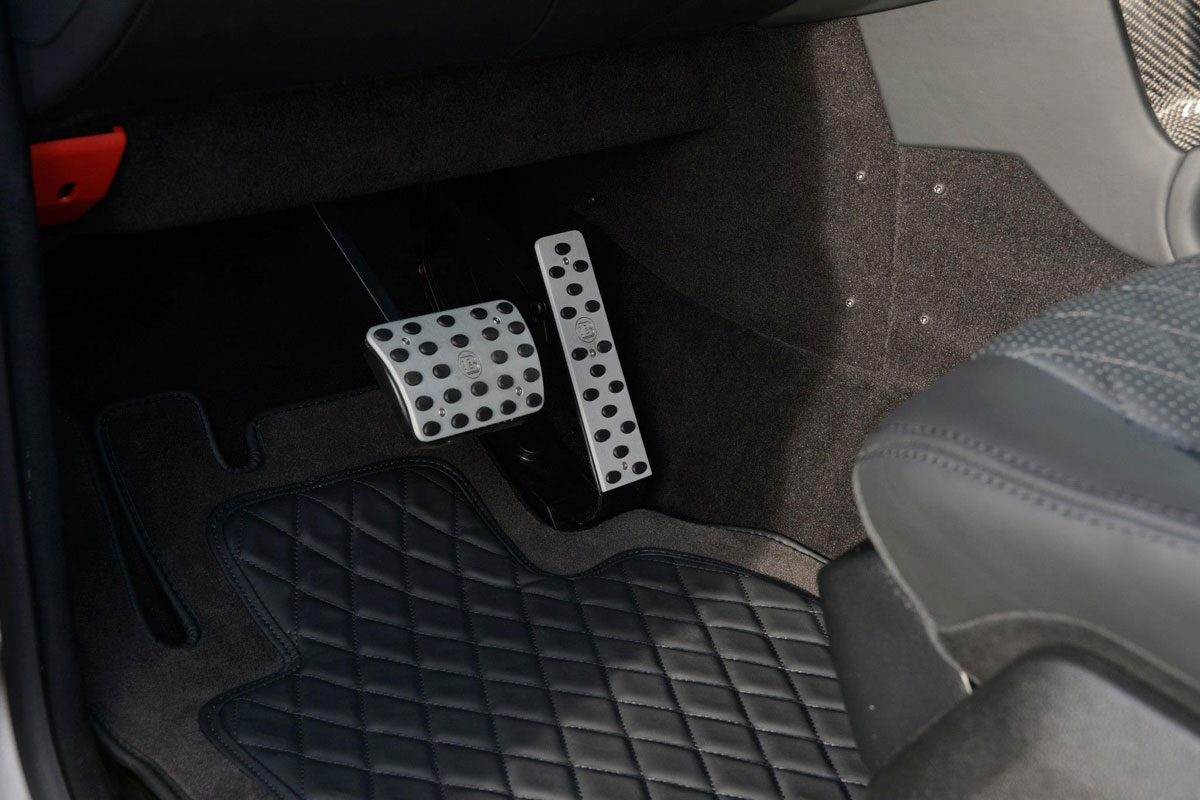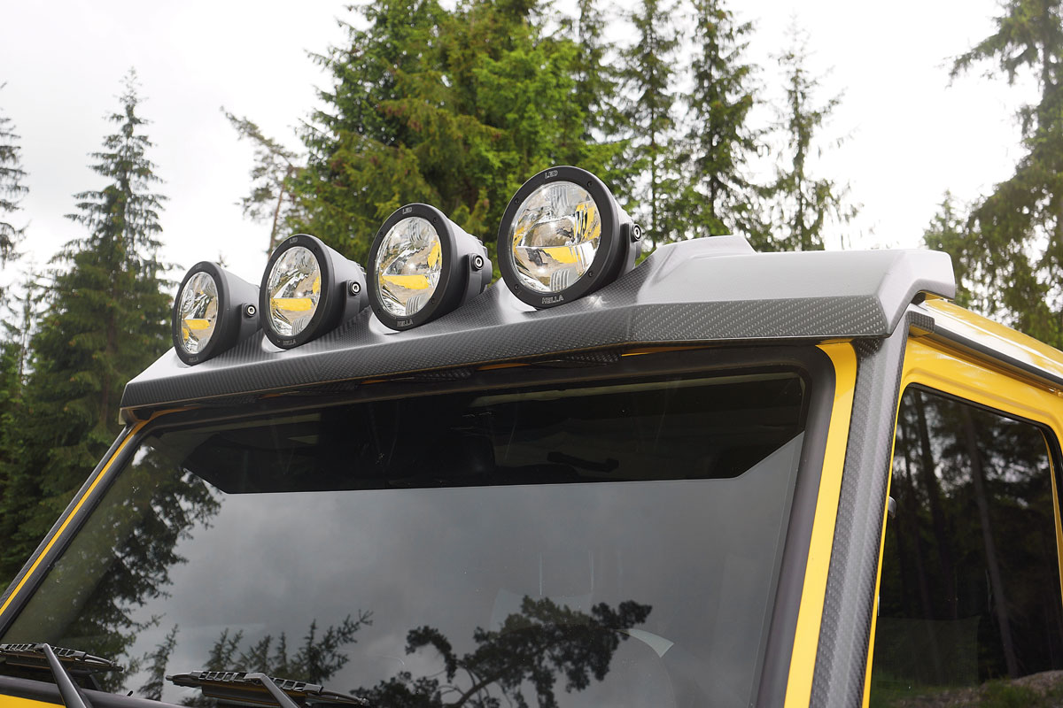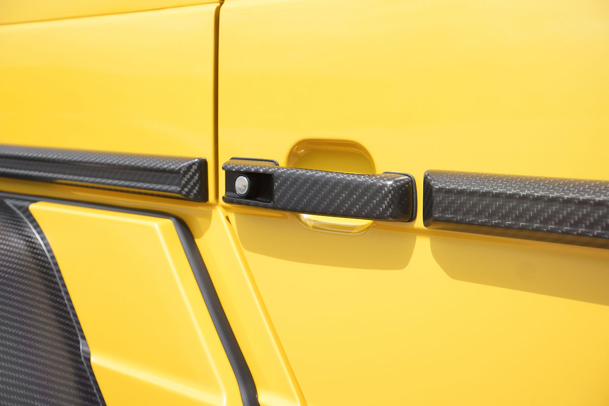 Äußerlich fallen natürlich sofort die für den Tuner typischen Anbauteile aus Carbon ins Auge (die aber auch in Wagenfarbe lackiert geliefert werden können). An Front und Heck, sowie den Seiten und auf dem Dach findet sich das leichte und feste Material. Selbst die neue Motorhaube besteht aus Carbon.