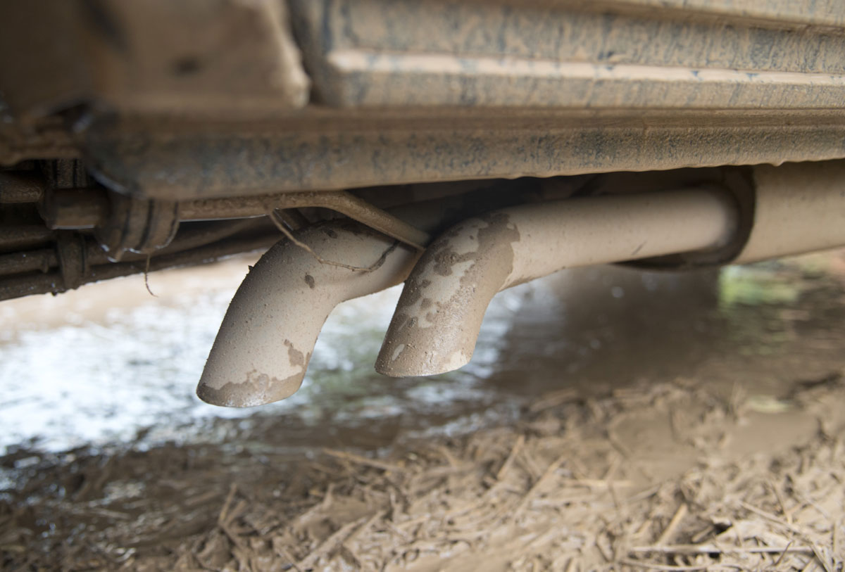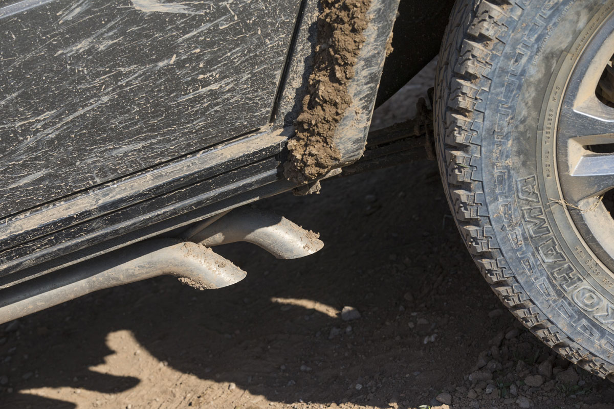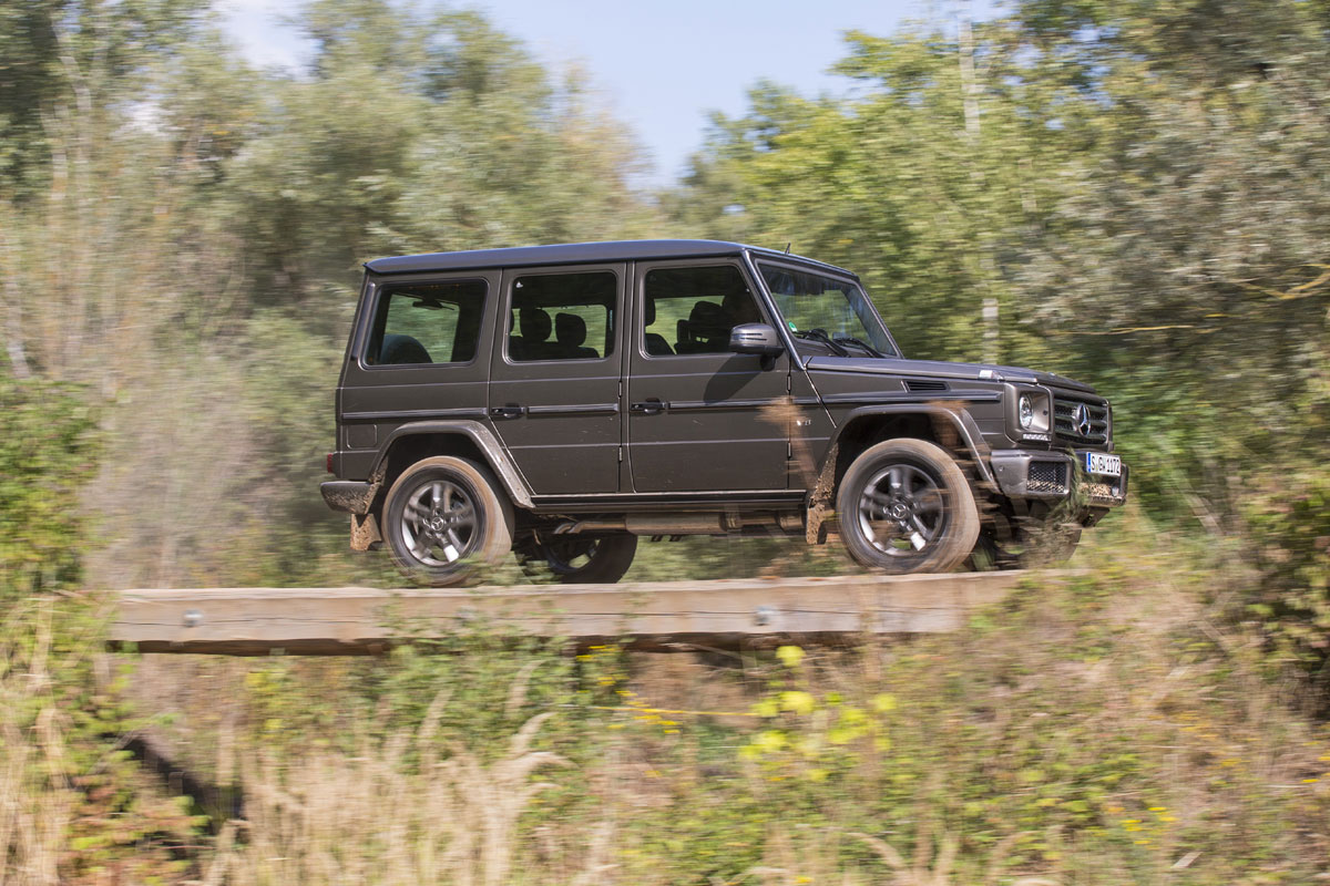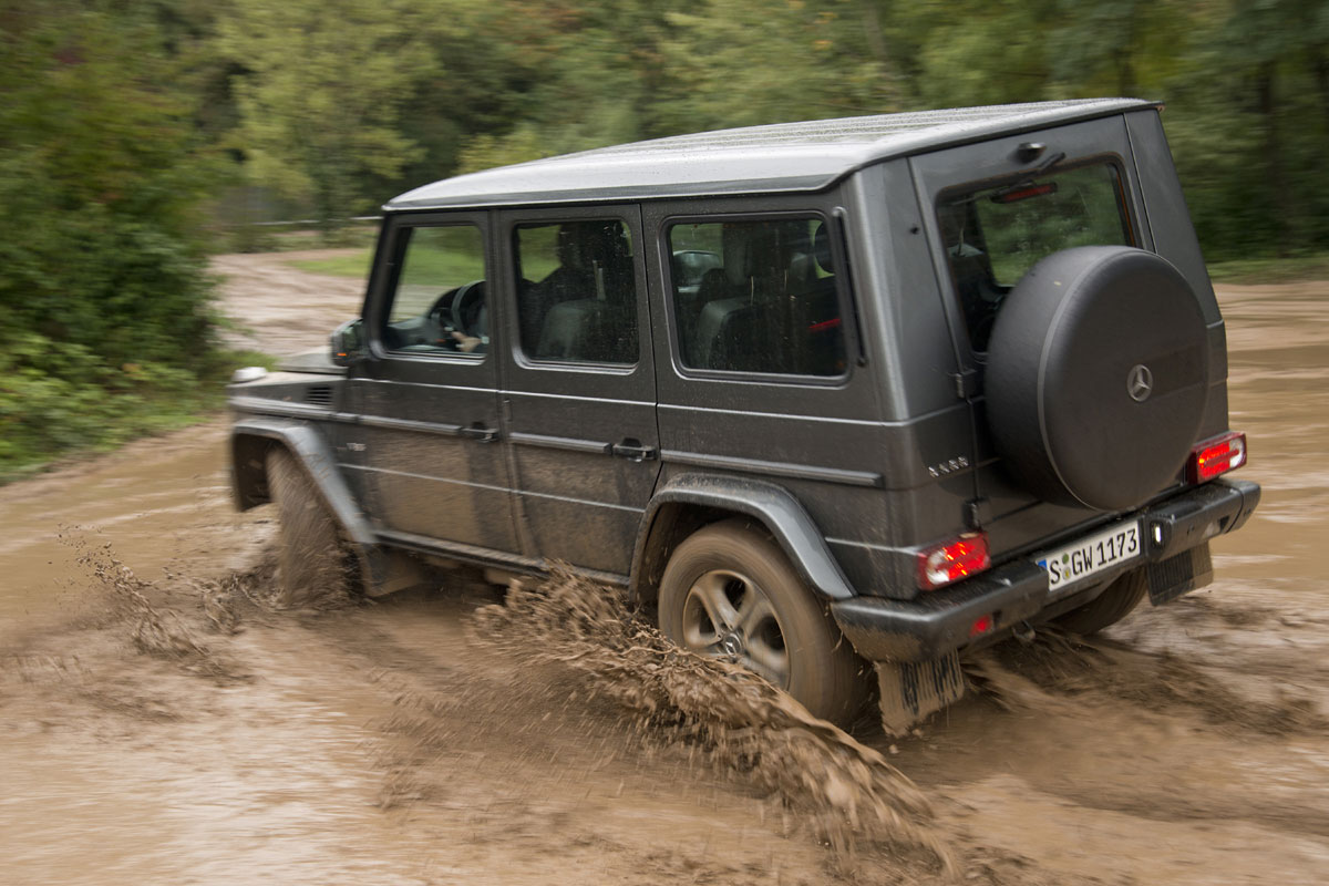 {1}Vor dir liegt ein Parcours, der schon im Trockenen nicht einfach zu fahren ist: steile Hänge, grobe Verschränkungen, enge Schluchten und Gerölllansammlungen in Fussballfeldgröße. Das Ganze nun locker bis zum Knie im Schlamm. Der G legt die Untersetzung ein, sperrt Mitte wie Hinterachse und legt ab. Ganz locker verlierst du den Horizont aus den Augen, baumelst durch den Innenraum wie eine Puppe mit zu lose angenähtem Murmelkopf und hast an manchen Stellen wirklich Angst, dass dir das Ding ganz normal auf die Seite fällt.