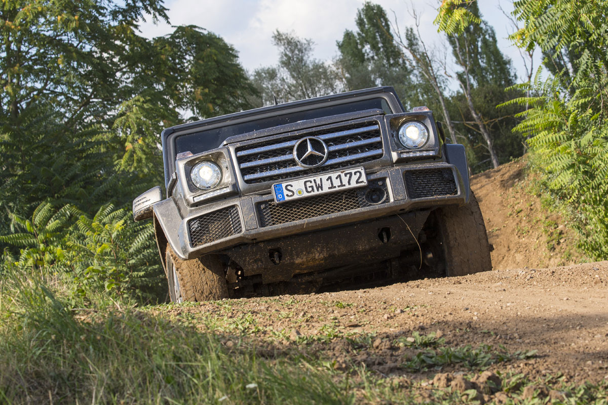 Du wippst durch Verschränkungsbögen, deren Löcher so groß wie ein ganzer Smart sind und krabbelst so locker wieder raus, dass der große V8 nicht einmal seine Stimme erheben muss. Standgas zieht ihn quasi überall raus. An einer Steigung dann, sicher zwanzig Prozent, zu Fuß nicht im Traum zu erklimmen, da fordert er dann die dritte Sperre, weil der Matsch an der blinden Kuppe dann doch bis zur Nabe geht und jede Panickattacke des Fahrers selbst den G hier ohne den Einsatz des komplett starren Durchtriebs in Bedrängnis bringen könnte.
