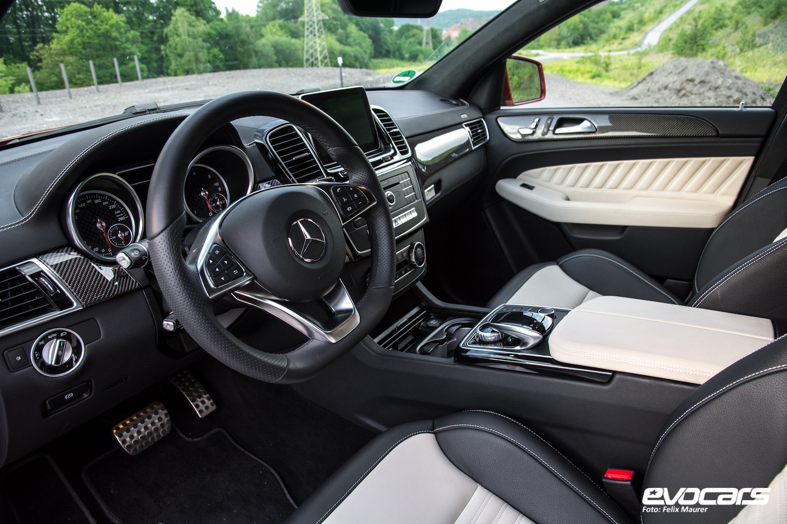 {1}Es ist – wie schon gesagt – eine Gratwanderung zwischen Ab- und Zuneigung beim GLE Coupé. Im Innern empfängt den Fahrer ein Mix aus Designo-Porzellan-Leder (AMG-Interieur zu 2.023 Euro), einem fein abgestickten Armaturenbrett und ebenso feiner, einstellbarer Ambientebeleuchtung sowie dem Gipfel der Dekadenz: einem beheiz- und kühlbaren Cupholder (knapp 250 Euro). Doch der etwas miefige Taxigeruch ist noch nicht verflogen. Die Klimaregler aus der verflossenen E-Klasse von vor zehn Jahren, der klotzige iPad-Verschnitt auf der Mittelkonsole und die grelle LED-Beleuchtung, die das Zeug zum Blenden hat, sobald man eine Tür aufmacht, mögen nicht ganz zum unantastbaren ersten Eindruck passen. Andererseits macht es ihn handfest – also ihn, den GLE.