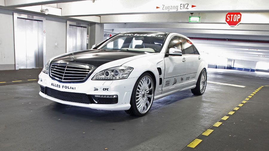 Als Basis dient ein 2006er S-Klasse-Modell, das von der Firma Silver-Color mittels neuer Schürzen, Schwellern und einiger anderer Anbauteile auf den Stand von 2011 gehoben wurde. Doch damit nicht genug. Um auch ja aufzufallen spendierte die Firma CFC dem 2,2-Tonnen-Dickschiff mit dem 612 PS starken V12 unter der Haube verschiedene Folien, die dem großen Schwaben nun jede Eleganz absprechen, die Limousine aber zum Hingucker machen. Ähnliches gilt für den Innenraum. Hier legte die Firma S&N Design Hand an und verwandelte das Cockpit in einen „Traum“ aus schwarzem und weißem Nappa-Leder.