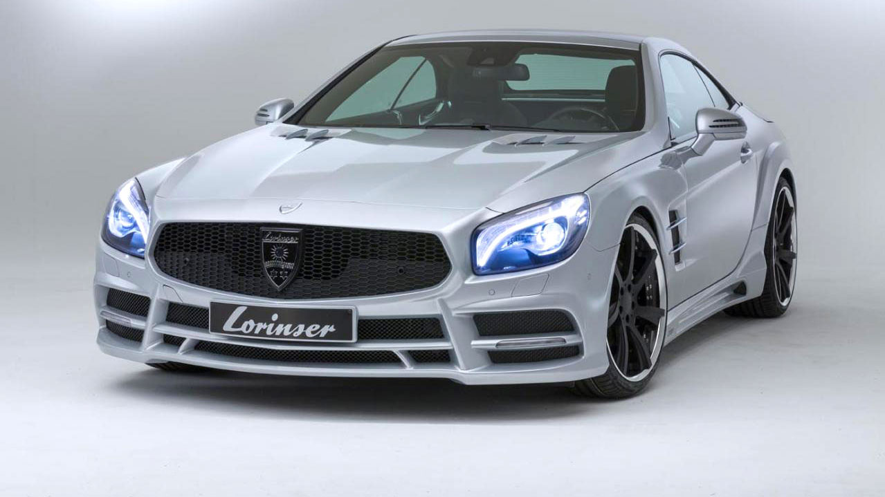 Der extrovertierten Linie bleibt Lorinser treu. Aggressive Schürzen mit großen Lufteinlässen prägen den Auftritt des Messefahrzeugs, das SL-typisch in Silbermetallic lackiert ist. Dazu offeriert der Veredler dreiteilige und polierte 20-Zoll-Leichtmetallfelgen, die in Verbindung mit einer variablen Tieferlegung für eine stimmige Optik sorgen. Am Heck zeugt eine vierflutige Abgasanlage mit eckigen Endrohren von der mächtigen Leistung, die der V8 unter der langen Schnauze entwickelt.