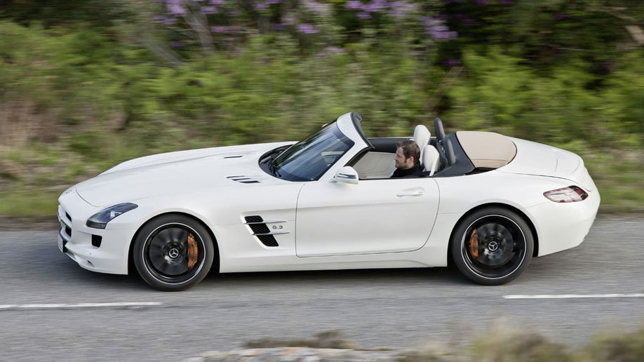 Trotz diverser Verstärkungen wiegt der mit einer knappen Stoffkapuze bestückte Roadster nur 40 Kilogramm mehr als sein Coupé-Bruder und bringt es so auf 1660 Kg. Zusammen mit den 571 PS des 6,2-Liter-V8 unter der Haube liegt sein Leistungsgewicht also bei 2,9 Kg / PS. Auf Tempo 100 geht’s so in 3,8 Sekunden und Schluss ist erst bei 317 km/h. Immerhin bis Tempo 50 kann das Stoffverdeck geöffnet und geschlossen werden. Exakt elf Sekunden sollen für diese Vorgänge vergehen. Offen wie geschlossen fasst das Gepäckabteil des SLS AMG Roadsters 173 Liter.