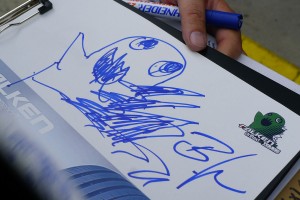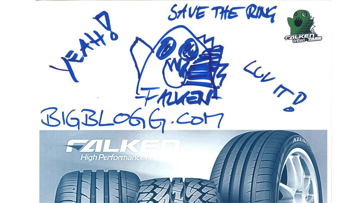 Denn die Jungs von Falken wollten für eine Gruppe von Journalisten und Bloggern nicht die gängige Marketing Bespaßung an einer Rennstrecke abziehen, sondern mal etwas ziemlich Ausgefallenes machen: Zeichnen! Dazu steckten sie acht online publizierenden Herren auf den Beifahrersitz eines VLN Rennwagens und drückten ihnen ein Klemmbrett samt dicken Edding in die Hand. Aufgabe: Während einer Nordschleife-Runde das Maskottchen des Reifenherstellers malen, den Falkenzilla.