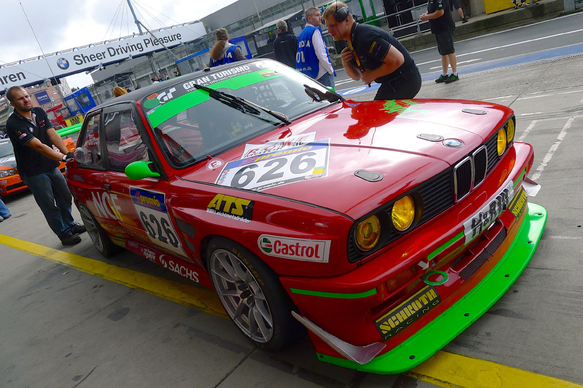 Um die Aufgabe „etwas leichter“ zu gestalten, sägt allerdings nicht der Flat Six des Porsche 911 GT3 R des Falken-Teams sondern der unwiderstehlich brüllende Vierzylinder eines BMW M3 E30 vom Valentin Racing unter der Haube des „Zeichen-Wagens“. Ein Vorteil für die Blogger, denn so ein Auto aus der Klasse H3 ist doch ein gutes Stückchen von den Rundenzeiten eines SP9 Bombers entfernt. Und das Ergebnis? Ganz ehrlich: Weit ab von künstlerisch wertvoll, doch das war irgendwie absehbar. Aber damit war die Nummer noch nicht ausgestanden. Die acht gezeichneten gekritzelten Falkenzilla-Mutanten mussten sich der fast 18.000 Fans großen Falken Motorsports Facebook Community zur Bewertung stellen. Hart und erbarmungslos wurden dabei die kleinen Monster von sechs Teilnehmern und unserem Redakteur Griesinger (der dies ausnahmsweise im Namen seines eigenen Blogs machte) kommentiert und beurteilt. Das Resultat: Ein eindeutiges Voting für den Falkenzilla von Griesinger.