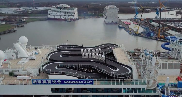 {1}Das 326 Meter lange Schiff wurde von der Meyer Werft in Papenburg konzipiert und gebaut. Es bietet Platz für maximal 3.850 Passagiere, wobei bis zu 20 von ihnen gleichzeitig mit Elektro-Karts auf der Kartbahn gegeneinander fahren können. Die Kartbahn verläuft über zwei der obersten Decks und wurde in Zusammenarbeit mit der Scuderia Ferrari entworfen. Wer die teureren Außenkabinen bucht, kann zudem kostenlos auf die Kartstrecke gehen. Einziger Wermutstropfen: die Norwegian Joy, die von der amerikanischen Norwegian Cruise Line eingesetzt wird, wurde extra für den chinesischen Tourismus gebaut. Sie unternimmt seit diesem Sommer Kreuzfahrten zwischen Shanghai und Tianjin. Doch die Meyer Werft hat noch weitere Kreuzfahrtriesen in Planung, die ja möglicherweise auch mit Kartbahn und vielleicht sogar nach Europa kommen werden.