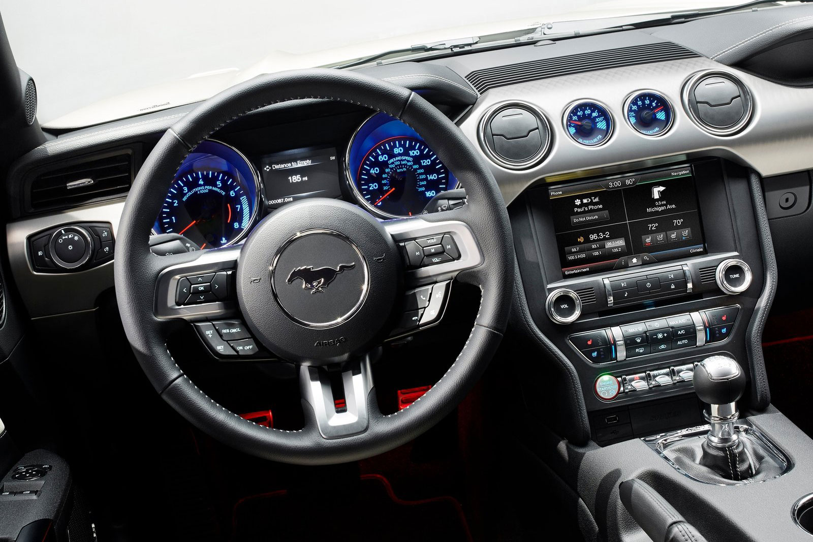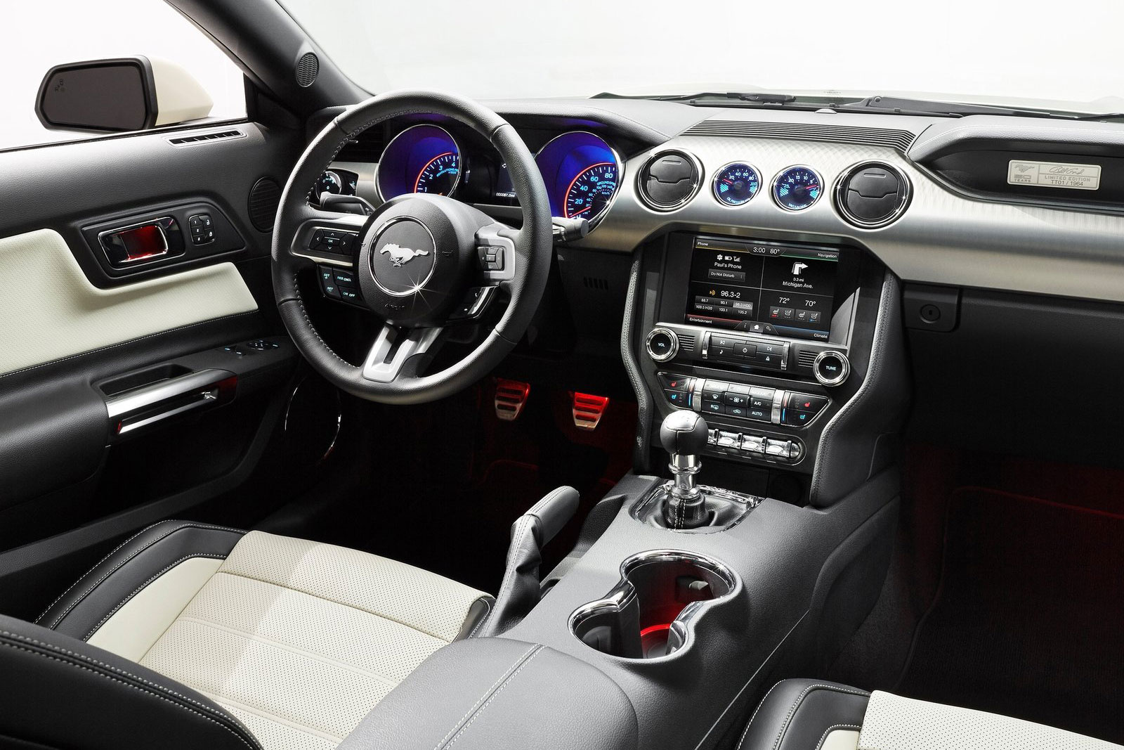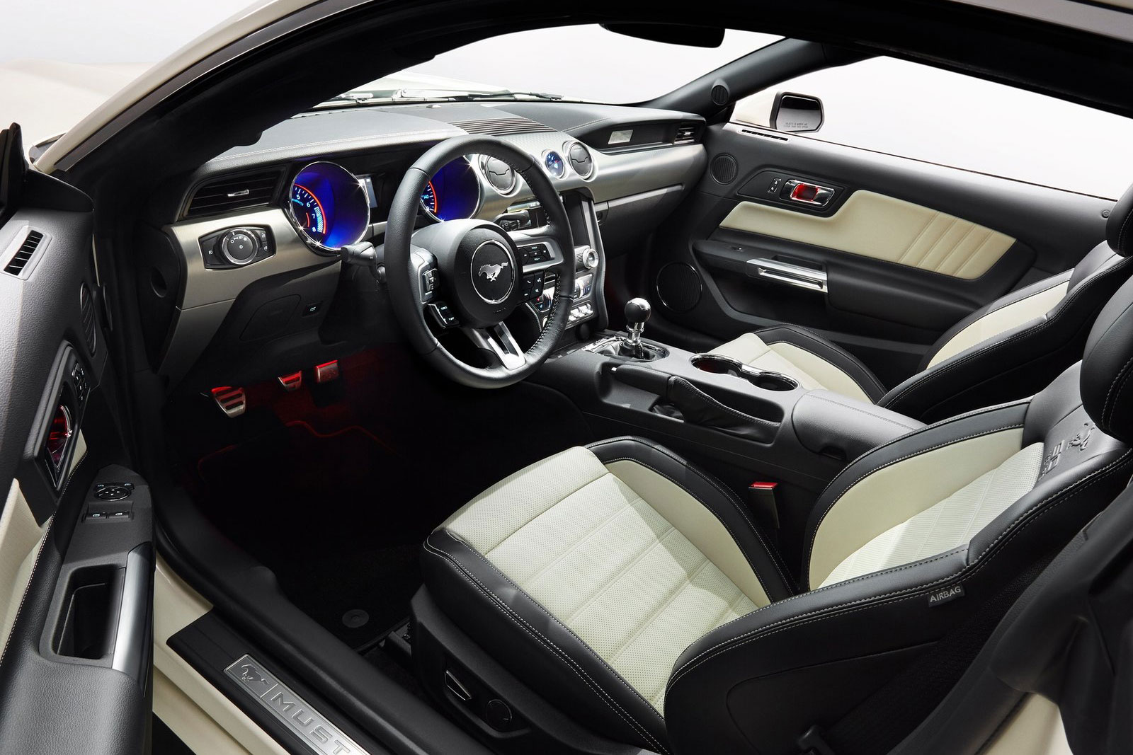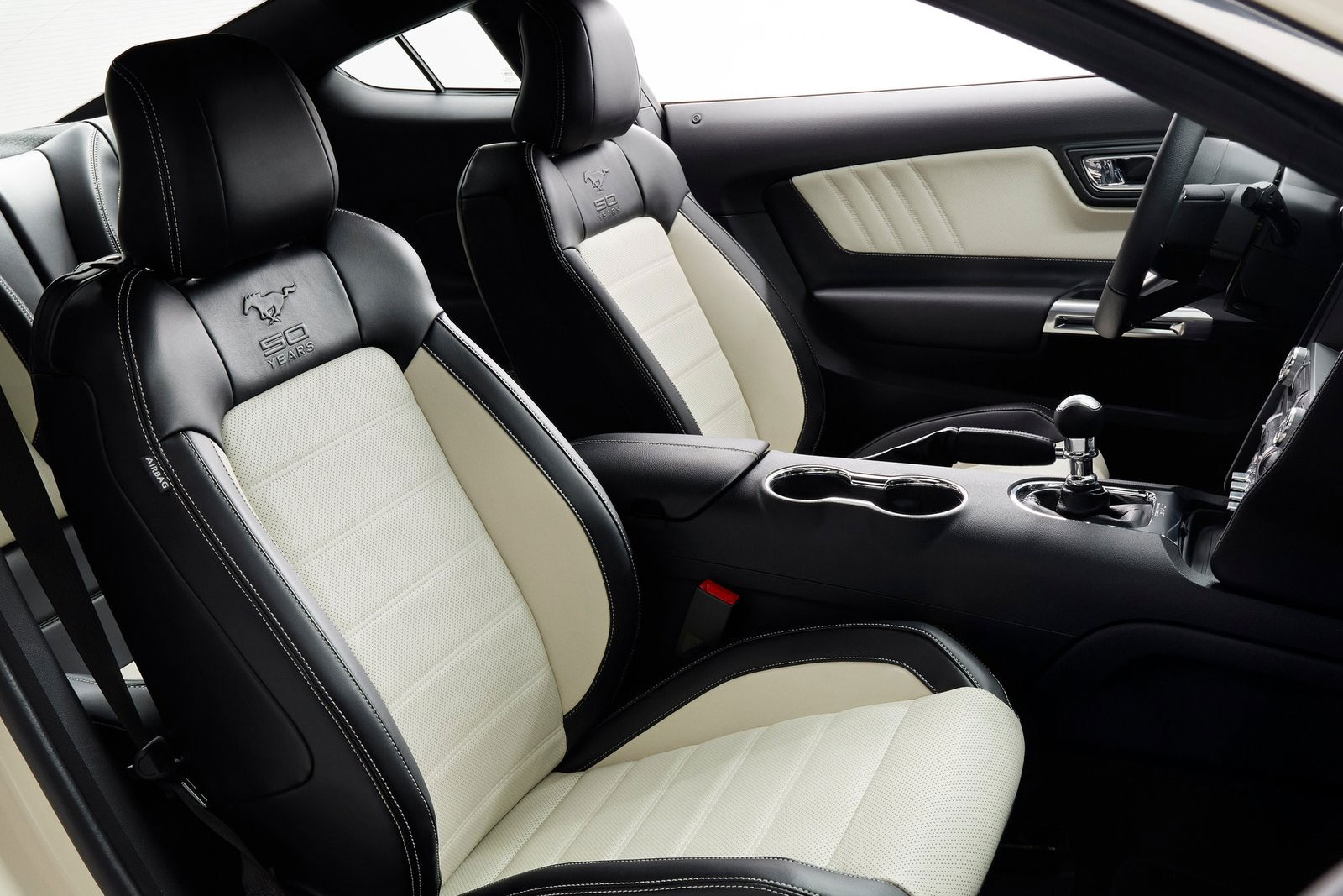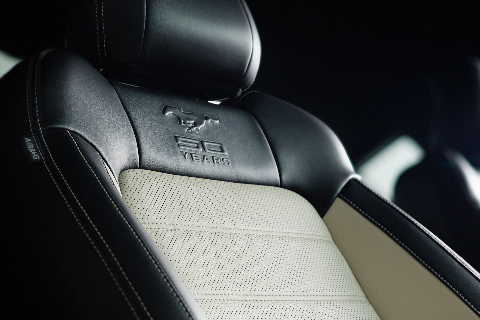 Das Sondemodell ist zudem die einzige Möglichkeit, an das hier verbaute kaschmirgenähte Lederlenkrad zu kommen. Die gleiche Naht wird zudem auch auf dem Leder des Armaturenträgers, des Schalthebels, der Mittelarmlehne, der Türeinsätze und der Sitze verwendet. Die Sitze sollen durch Bezüge aus zweifarbigem Kaschmir und schwarzem Leder sowie einem „50 Jahre“-Logo auf den Sitzlehnen punkten. Diese exklusive Innenraum-Ausstattung wird ausschließlich für das Editionsmodell und für sonst keinen anderen Ford Mustang erhältlich sein.