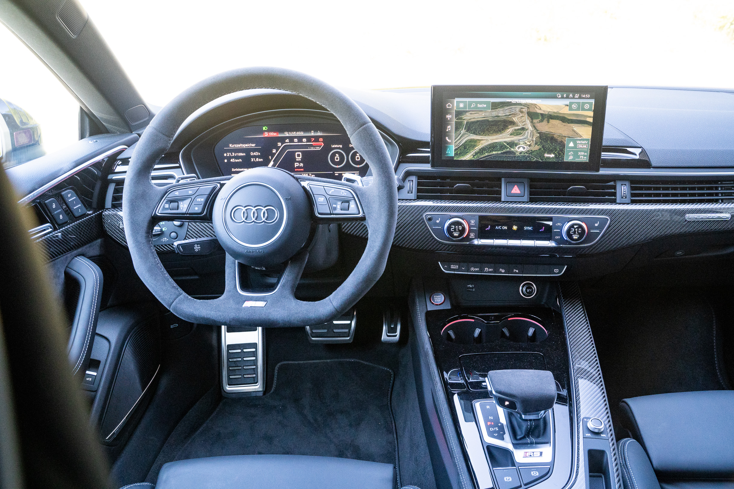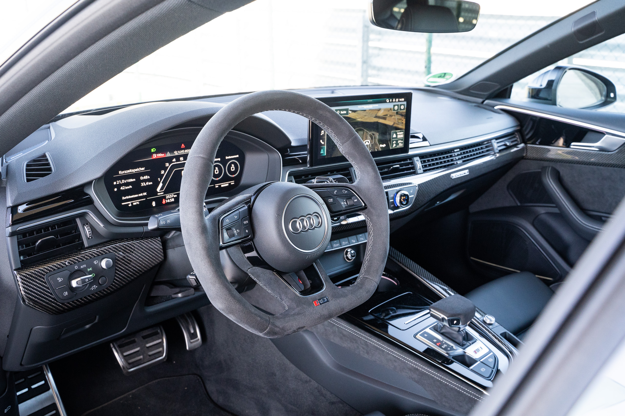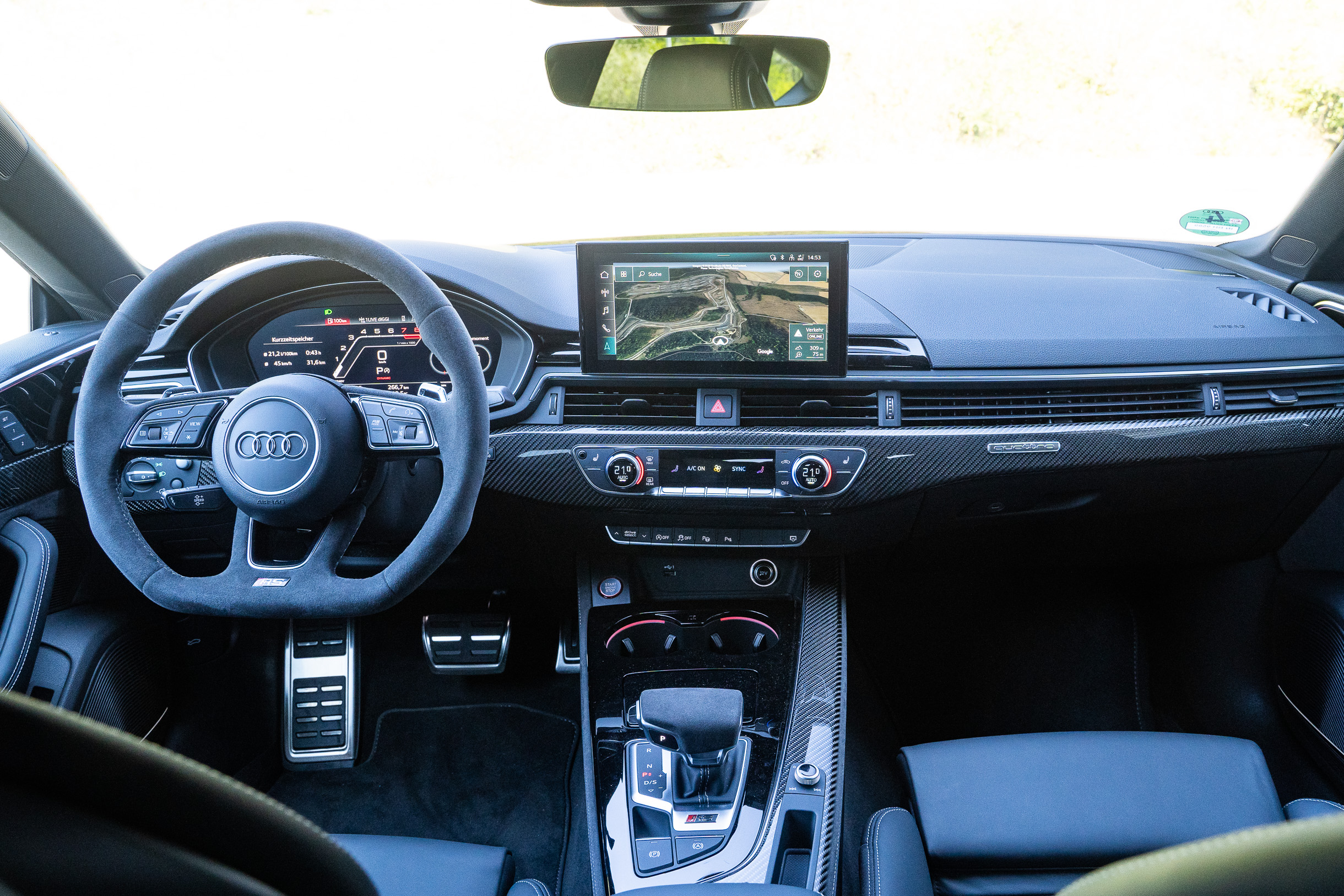 {1}Doch auch im Innenraum muss man die Veränderungen mit der Lupe suchen. Ergebnis unserer Suche: Im Multifunktionslenkrad sitzt jetzt eine RS-Taste, über die zwischen zwei RS-Fahrmodi gewählt werden kann. Das Zentraldisplay wächst auf 10,1 Zoll und das digitale Cockpit bietet jetzt eine spezielle RS-Anzeige für die Fahrwerte an, kostet aber weiterhin Aufpreis. Dahinter arbeitet jetzt die neueste Generation des Audi Infotainmentsystems, die vor allen Dingen beim Navigieren mit der Google Earth Darstellung weiterhin beeindruckt.