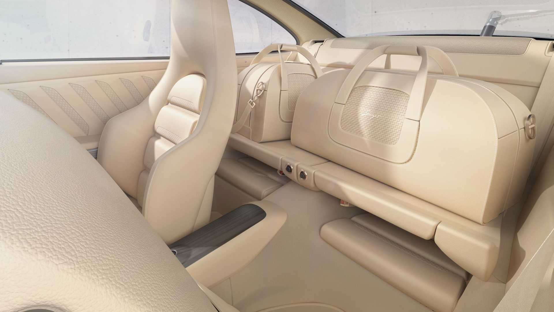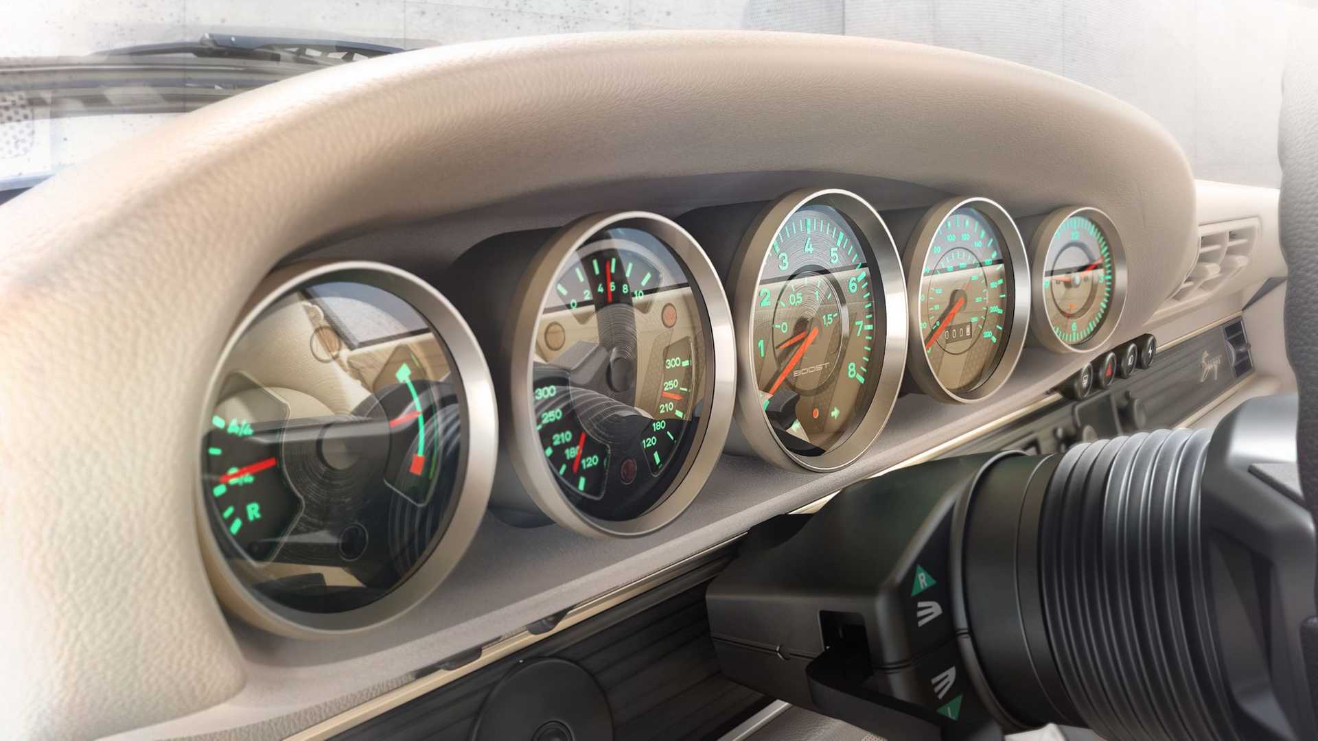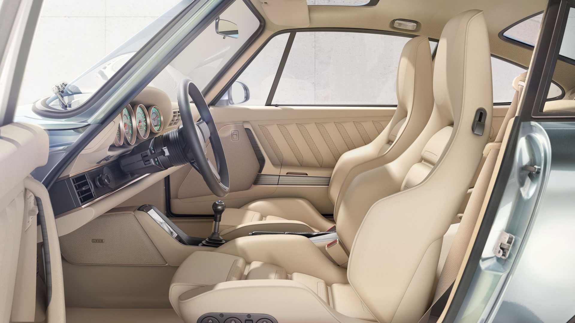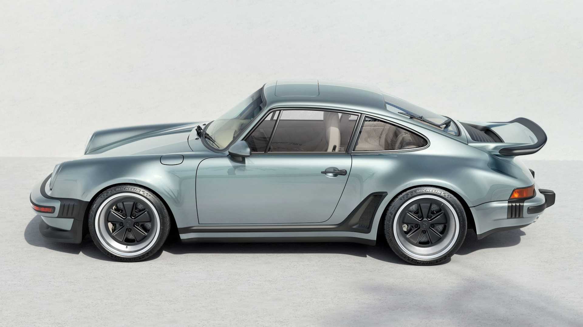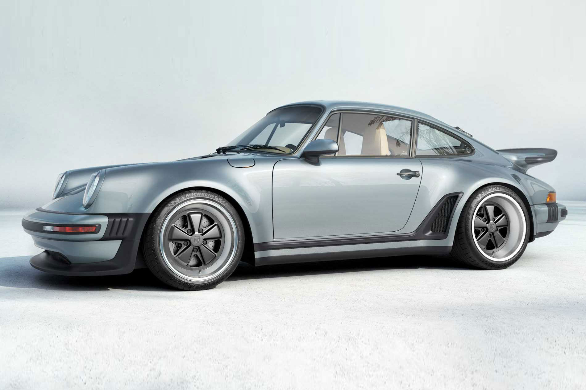 [adrotate group=“1″]Eine Nummer drunter, aber nicht minder sensationell ist der „Porsche 911 Turbo 930 von Singer, der dem Original aus den 70er bzw. 80er Jahren auf den ersten Blick zum Verwechseln ähnlich sieht. Das in den USA ansässige Unternehmen Singer Vehicle Design verwendet bei der Kreation des hier gezeigten 911 Turbo (930) wie üblich einen Porsche 911 der 964er Baureihe (gebaut zwischen 1988 und 1993). Viel übrig blieb vom Spenderfahrzeug allerdings nicht, denn sowohl die nun aus Kohlefaser bestehende Karosserie wie auch die Innenausstattung, die Elektronik, das Fahrwerk und der Motor sind neu. Obwohl: Das Aggregat im Heck basiert weiterhin auf dem Original 3,6-Liter-Boxer des 964ers, wurde aber auf 3,8 Liter vergrößert und dank zweier Turbos kommt der luftgekühlte Boxer nun auf mindestens 450 PS. Als Ladeluftkühler kommen Luft-Wasser-Wärmetauscher zum Einsatz. Auf Wunsch kann die Leistung noch weiter nach oben geschraubt werden.
