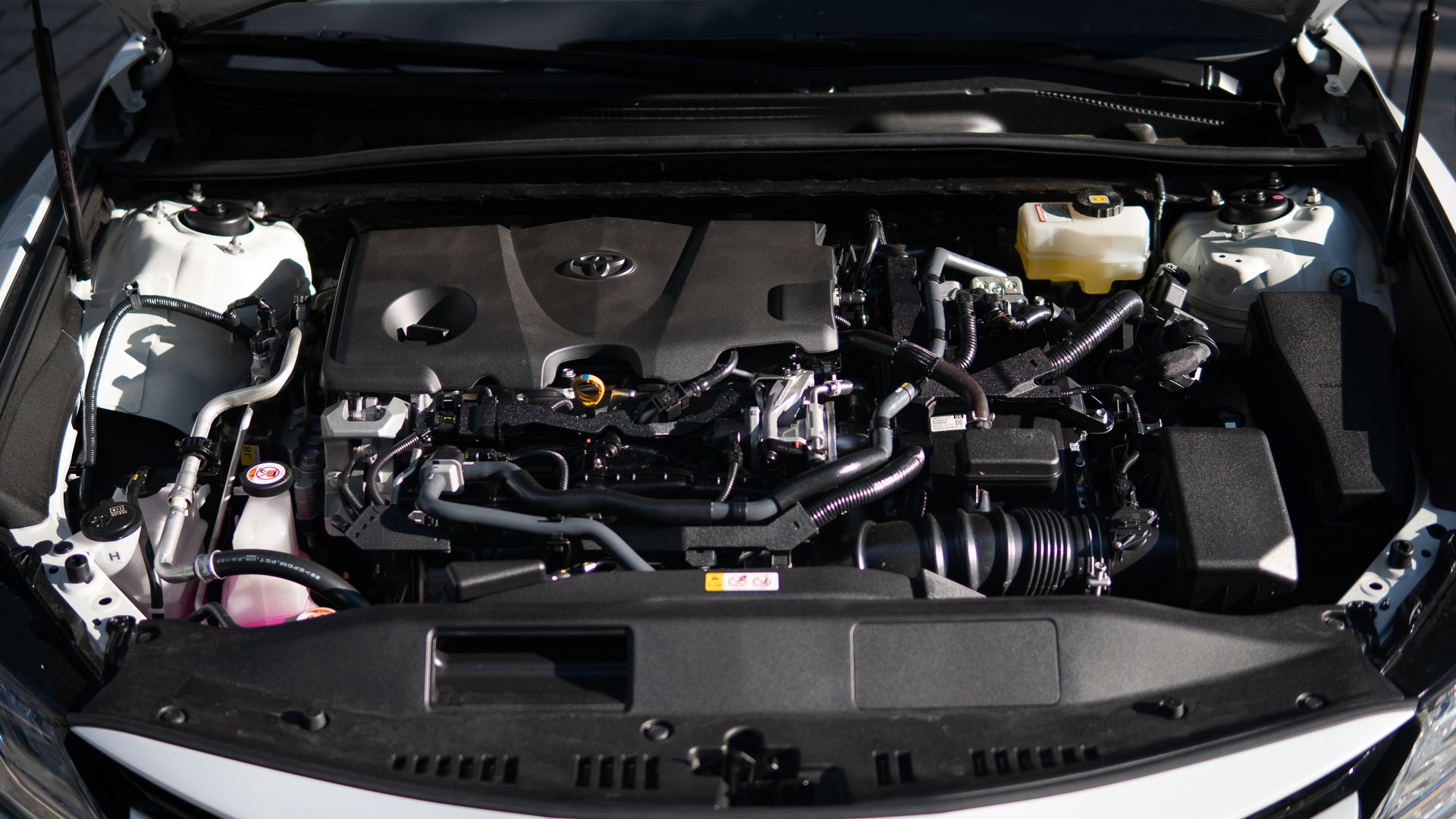 Und die 202Nm des Elektromotors reichen locker aus um ganz locker im Verkehr mitzuschwimmen. Man ist sogar schneller als die meisten anderen an der Ampel, weil der Camry eben nie schalten muss und sein Drehmoment ansatzlos zur Verfügung stellt. Und kommt dann außerorts der Verbrenner hinzu, wird die Sache nicht schlechter. Denn das hochverdichtete 2.5 Liter Saugtriebwerk ist ein echter Streber. 14,0:1 verdichtet, mit Saugrohr- und Direkteinspritzung, mit vollvariablem Ventiltrieb auf Ein-, wie Auslassseite spielt er das hohe Lied der Motorenbaukunst. Dabei kann er trotzdem auf Turbolader, NOx-Speicherkats und den ganzen anderen Chemiebaukasten verzichten, der andernorts heute nötig ist, um die Abgase zu reinigen.