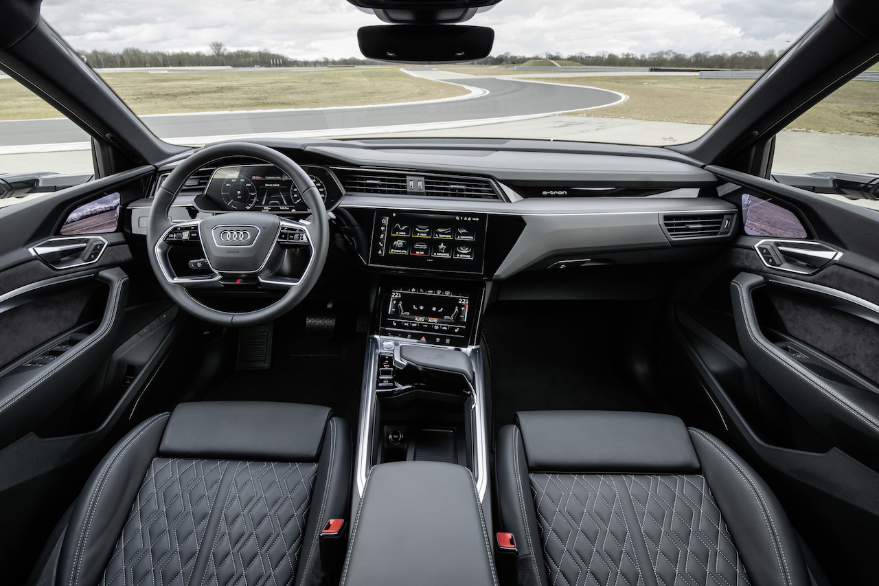 {1}Optisch unterscheiden sie die Sportmodelle nicht nur durch die serienmäßigen 20-Zoll-Felgen, die auf Wunsch bis zu 22-Zoll vergrößert werden können. Gut zwei Zentimeter breitere Radhäuser unterstreichen die Wuchtigkeit, wie der fast über die ganze Breite verlaufende hintere Diffusor. Auch die Aerotricks an der Front wurden angpasst: mächtigere Air-Curtains und ein neu konturierter Stoßfänger zeigen an, dass hier der Audi e-tron S kommt.