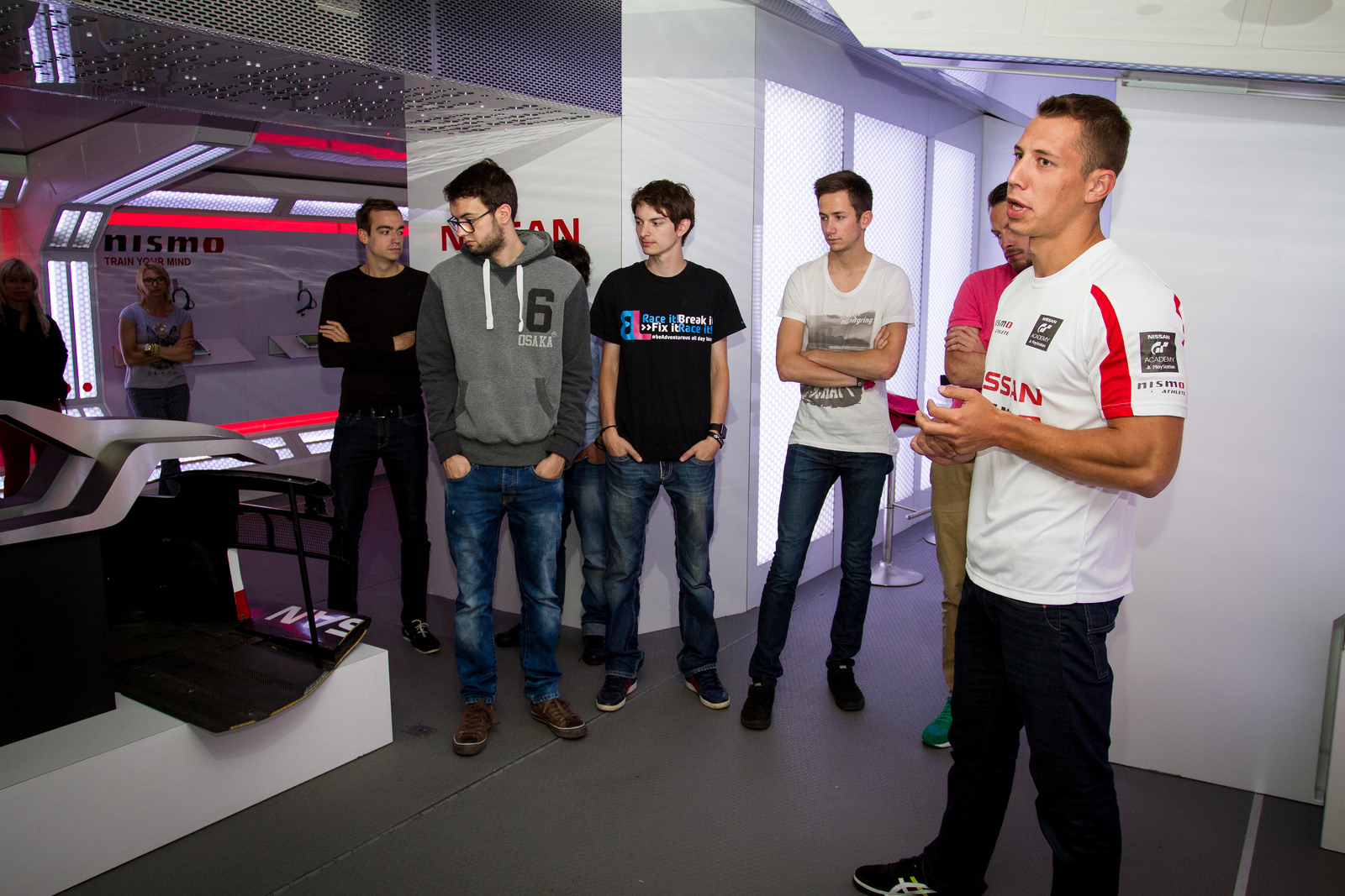 14659622344_9403fba7a0_hWeiter geht’s mit einem Besuch im „Nismo-Lab“, einem LKW-Auflieger, der mit allerlei technischen Spielereien vollgepackt ist, an denen wir uns versuchen dürfen. Vorher erklärt Florian Strauss noch ein wenig die Historie von Nismo im Motorsport. Nach einer Art Reaktionstest wird der Fittnessgrad jedes Journalisten gemessen – für manche erfreulich, für manche eher weniger. Anschließend darf sich jeder im Profi-Simulator versuchen und einen Nissan LMP2-Prototypen über die virtuelle Version des Silverstone-GP-Circuit jagen.