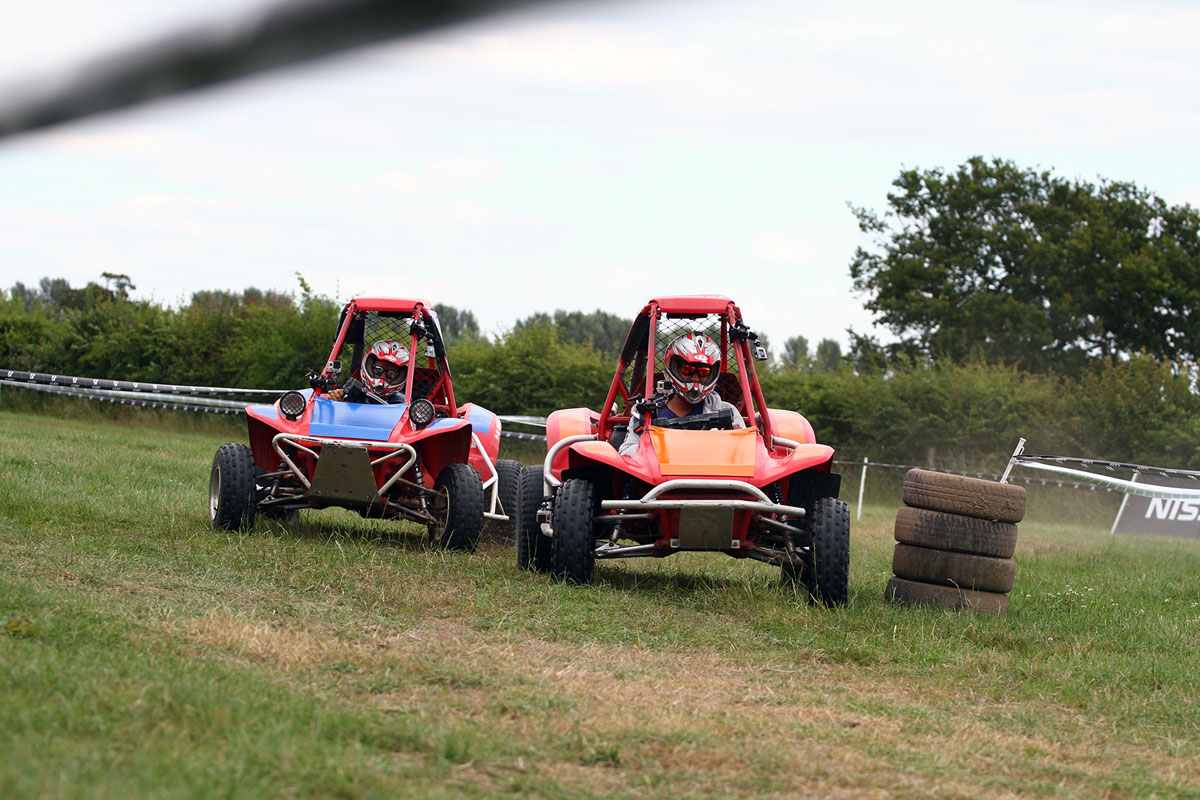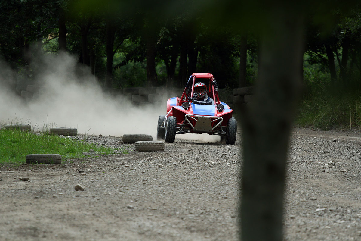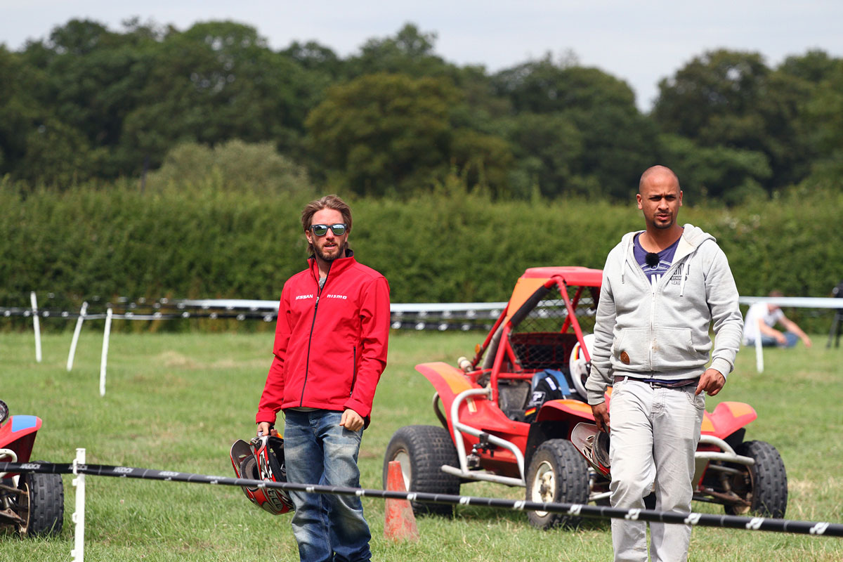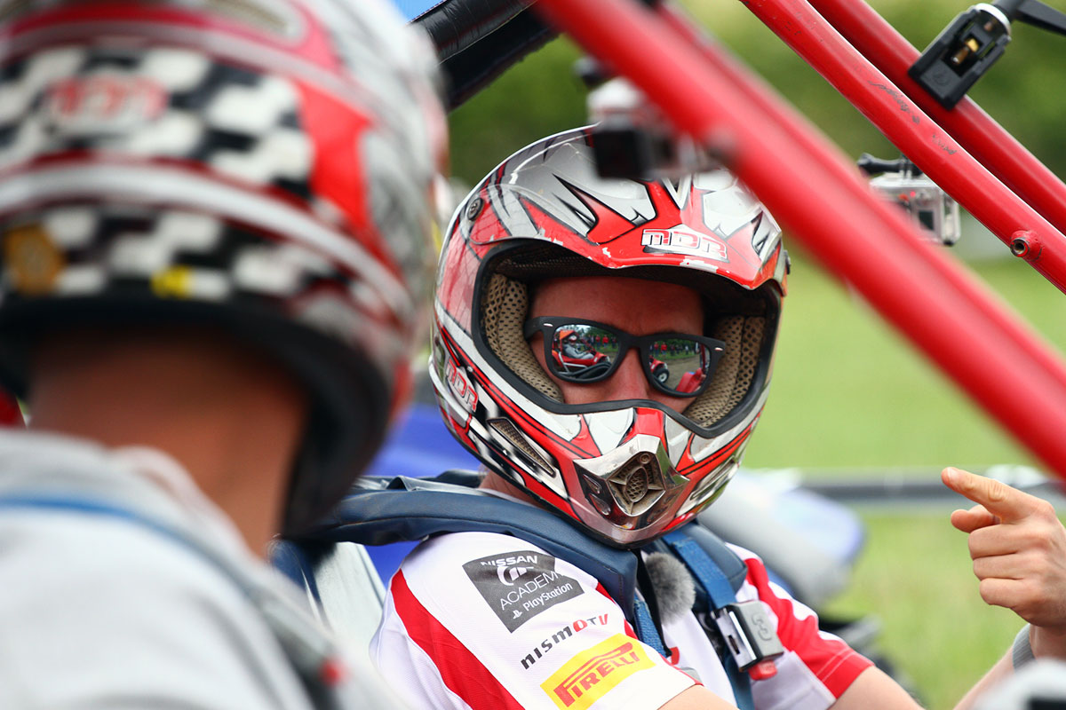 Doch damit nicht genug. Nach unserer Ankunft geht es gleich weiter mit der „Buggy-Challenge“. Es gilt, kleine Cross-Buggies auf einem Rundkurs über Wiese, Schotter und Beton zu scheuchen. Sogar zwei recht große Sprunghügel sind in den Kurs eingearbeitet. Vor Ort haben „PS-Profi“ JP-Krämer und Ex-F1-Pilot Nick Heidfeld, zwei der Juroren der Academy, die Buggies bereits warm und schon jede Menge Spaß dabei. Nach zwei spannenden Rennen stehen die vier Finalisten für den letzten Tag fest. Zum Schluss darf auch die versammelte Pressemeute auf die Piste. Die kleinen Buggies, mit Handgas und Bremse ausgerüstet, machen derbe Spaß, lassen uns alle aber viel Staub schlucken.
