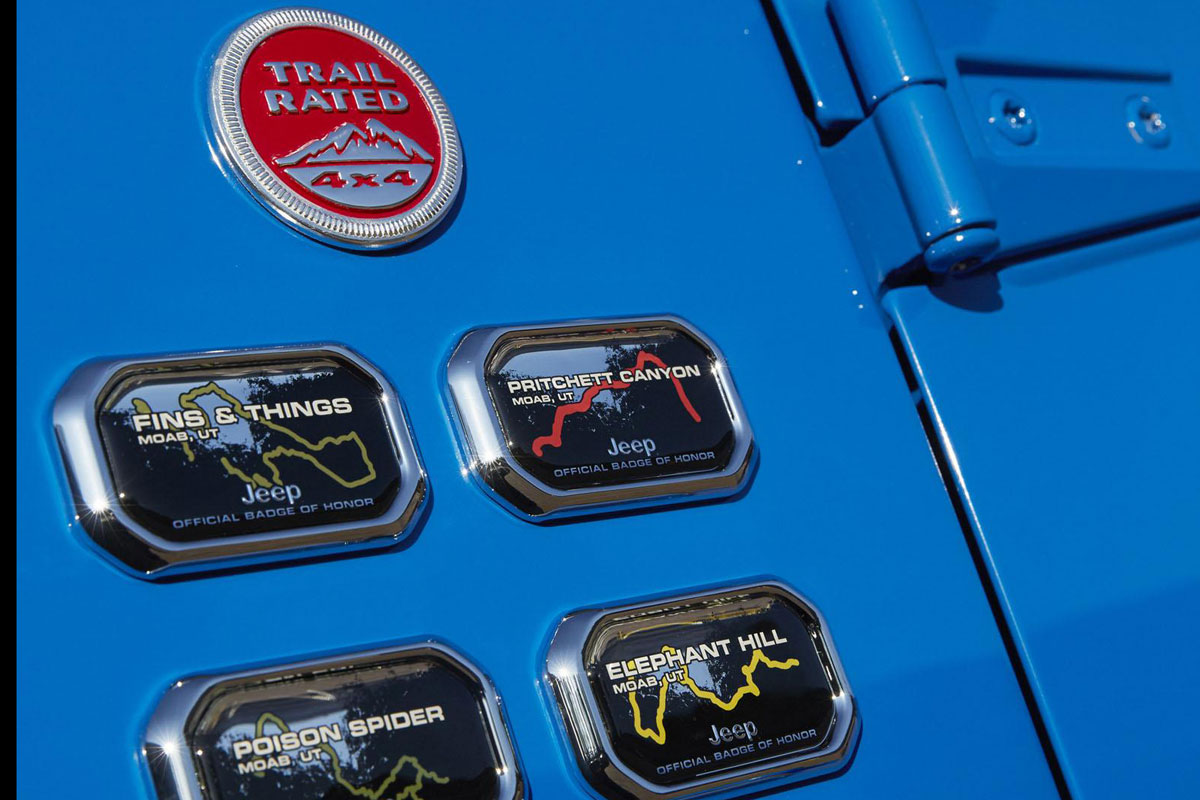 Den Anfang macht dabei zunächst das klassische Wrangler Modell, das in drei verschiedenen Varianten vertreten ist. Variante eins kommt in metallic schwarz und roten Akzenten daher und ist mit einem Lift-System, Dana 44-Achsen und einem Rock-Trac transfer case ausgestattet. Dadurch soll ein Kletter-Ratio von 73:1 möglich sein. Ledersitze und ein 3,6-Liter-V6 mit neuer Luftzufuhr und Abgassystem vervollständigen den „Level Red“. Die zweite Variante, auf den Namen „MOJO“ getauft, verfügt über die gleichen Modifikationen wie „Level Red“, darüber hinaus aber auch über 37 Zoll große „BFGoodrich Mud Terrain“-Tires, LED Scheinwerfer und eine Bi-Colour-Innenausstattung. Der dritte im Bunde, die „Maximum Performance“-Variante, kommt in leuchtendem Blau daher und verfügt unter anderem über elektronisch gesteuerte Dana 60 Achsen und einem Zehn-Zentimeter Lift-System.