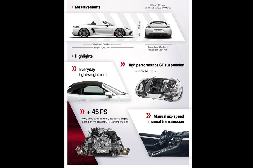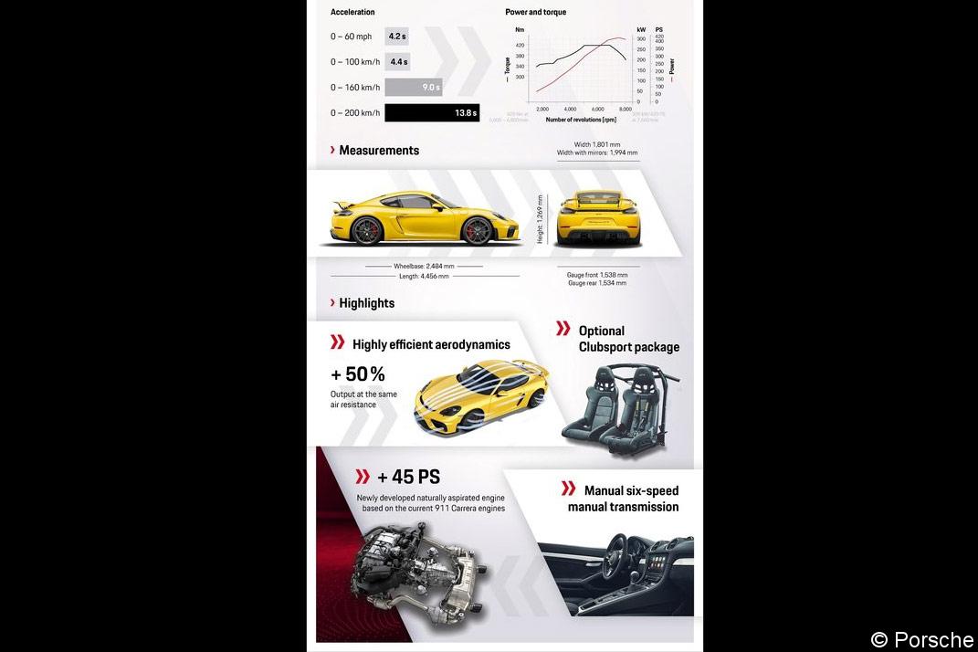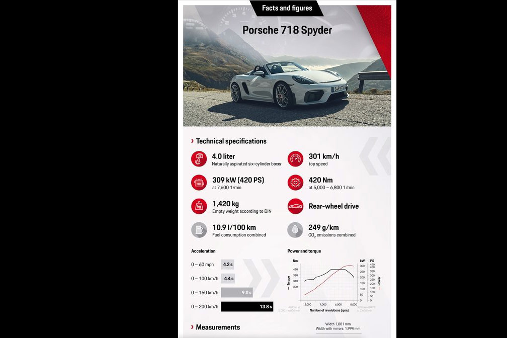 Die 718-Familie bekommt Verstärkung: Mit dem neuen 718 Spyder und dem 718 Cayman GT4 stellt Porsche zwei besonders emotionale und leistungsfähige Topmodelle an die Spitze der Baureihe. Ihr puristischer Charakter soll Sportwagen-Enthusiasten ansprechen, die Freude an ungefiltertem Fahrspaß haben und ein hohes Maß an Agilität sowie eine fast schon intime Nähe zum Kraftzentrum schätzen. All das soll das perfekt ausbalancierte Mittelmotorkonzept bieten. Erstmals teilen sich der offene 718 Spyder und der 718 Cayman GT4 mit festem Dach die technische Basis. Dazu gehört der neu entwickelte Vierliter-Sechszylinder-Saugmotor samt manuellem Sechsgang-Schaltgetriebe. Das Boxer-Triebwerk leistet in beiden Modellen 309 kW (420 PS). Während der GT4 den Einstieg in die GT-Straßenmodelle von Porsche darstellt, bietet sich der Spyder für Kurven aller Art an. Beide setzen auf eine hoch effiziente Aerodynamik, ein vollwertiges GT-Fahrwerk und kraftvoll zupackende Bremsen.